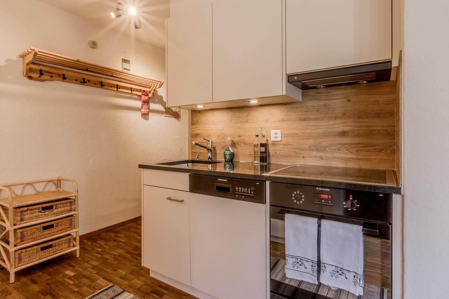 Eingangsbereich mit Einbauschrank, offene Kücke mit 3 Herdplatten, Backofen, Nespresso Kaffeemaschine, Kühlschrank mit Tiefkühlfach.