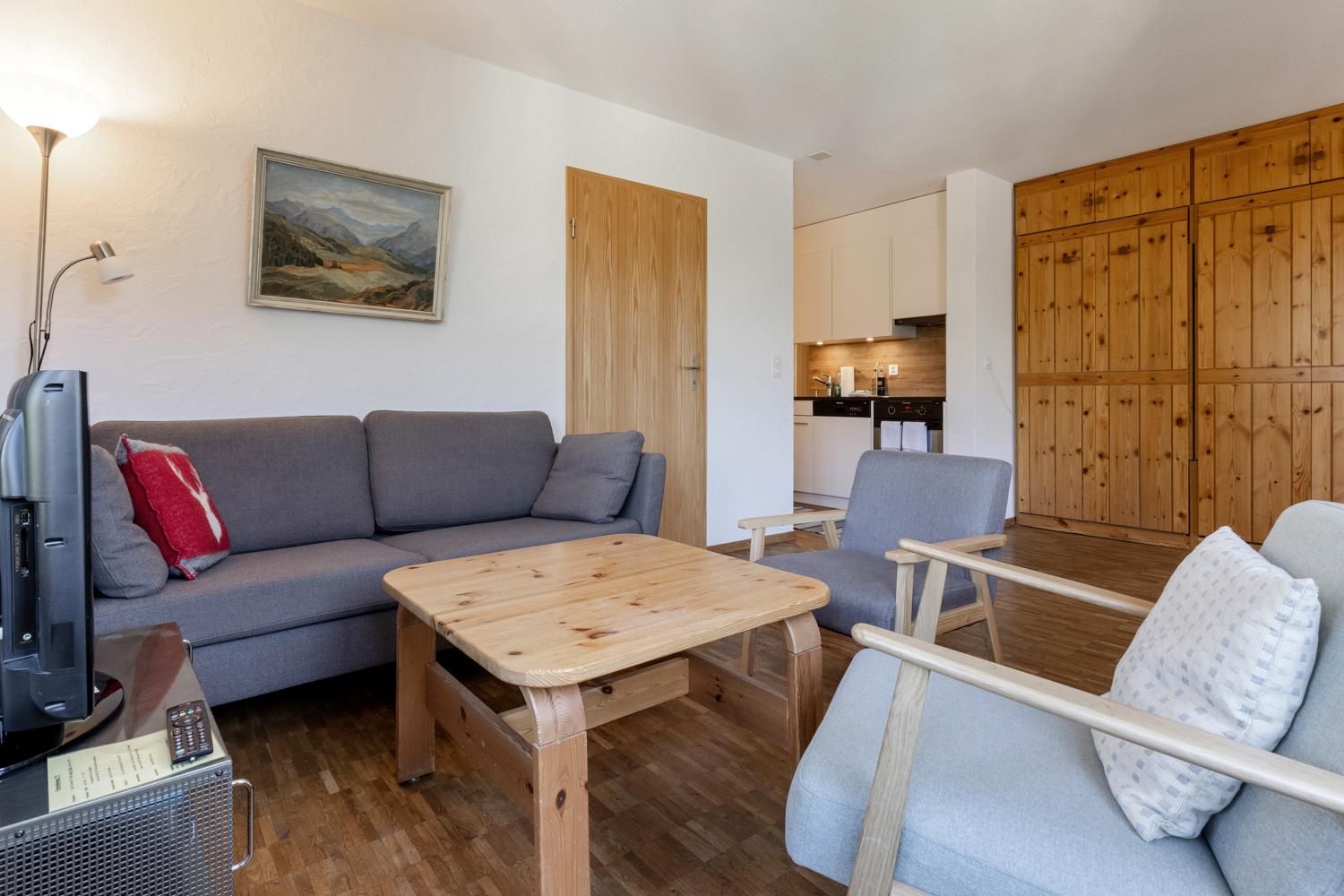 Das Wohnzimmer mit Fensterfront von Osten bis Südwesten verfügt über ein Sofa, 2 Sessel und Tisch und 2 Wanklappbetten. Die verglaste Veranda ist mit einem grossen Esstisch und 4 Stühlen ausgestattet. In den genannten Bereichen befindet sich ein Parkettboden.