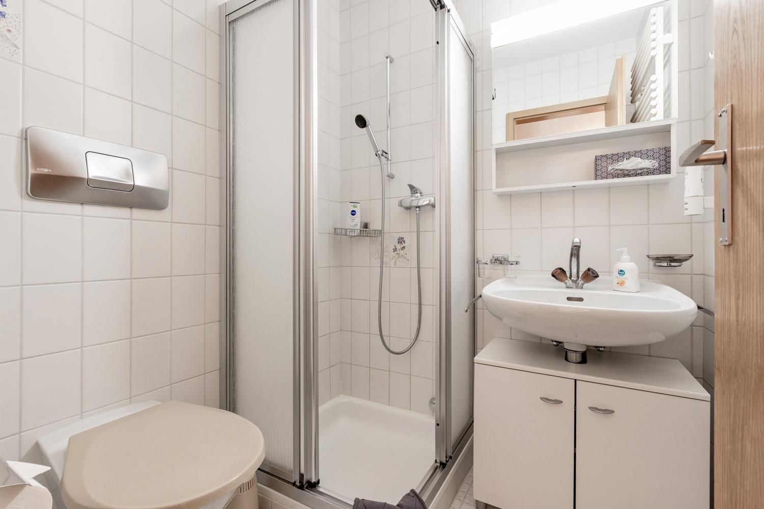Das Badezimmer verfügt über Dusche, Lavaboò und Unterbauschrank, Handtuchradiator und WC.