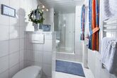 • Badezimmer mit großer Echtglas-Dusche, Waschbecken, Spiegel, WC, Föhn, Kosmetikspiegel, großflächiger Handtuchtrockner, Kosmetiktücher, Seifenspender