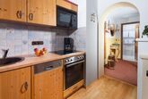 • Küchenbereich mit Essecke, Mikrowelle, Geschirrspüler, 4-Platten-Ceranherd, Backofen, Dunstabzug, Kühlschrank mit Gefrierfach, Kaffeemaschine, Wasserkocher, Eierkocher, Toaster, Geschirr farblich passend zur Ferienwohnung, Töpfe, Pfanne, Tablett, Brotzeitbretter