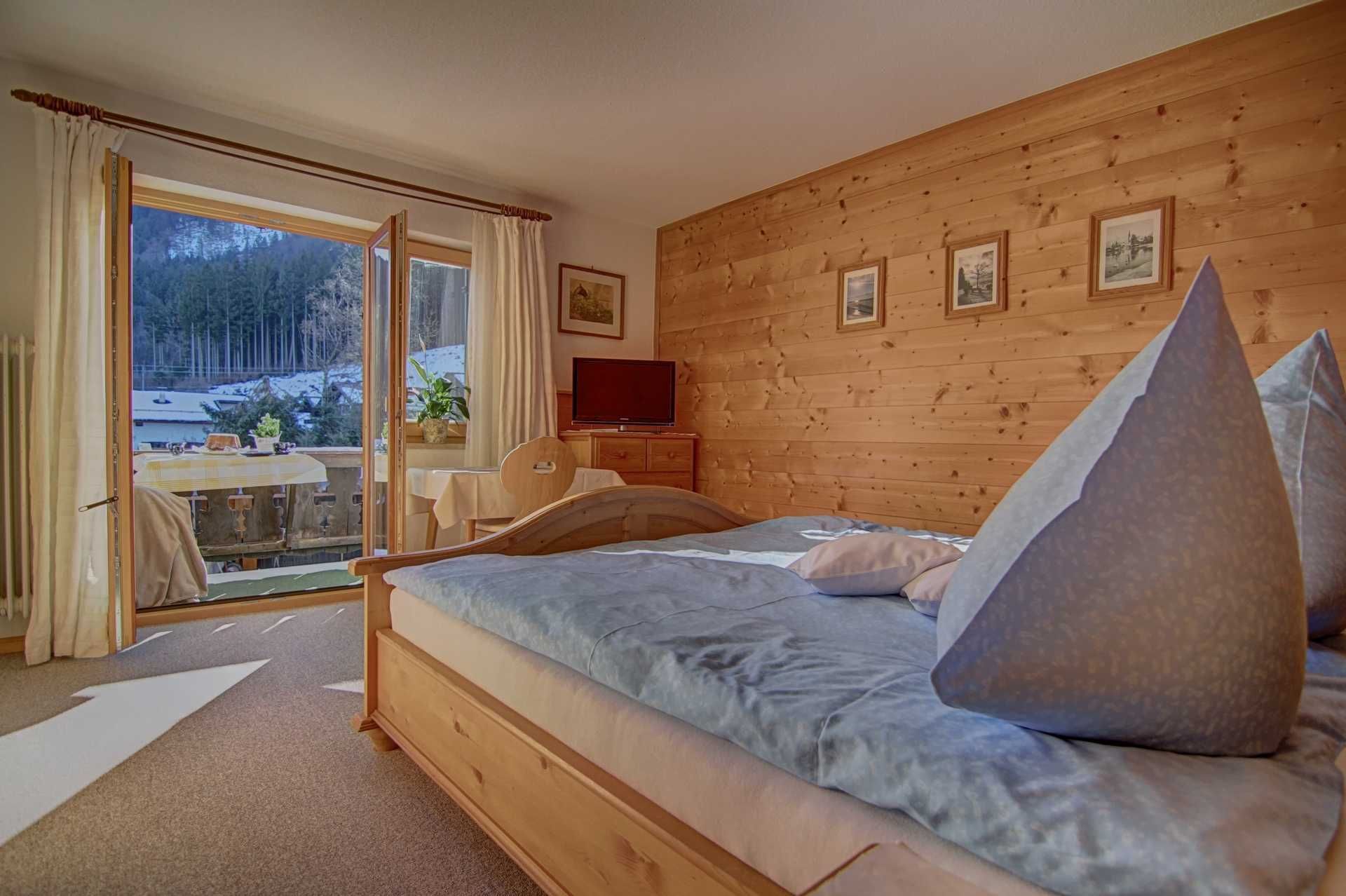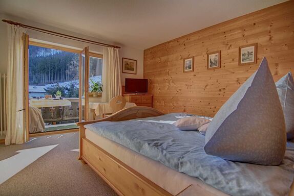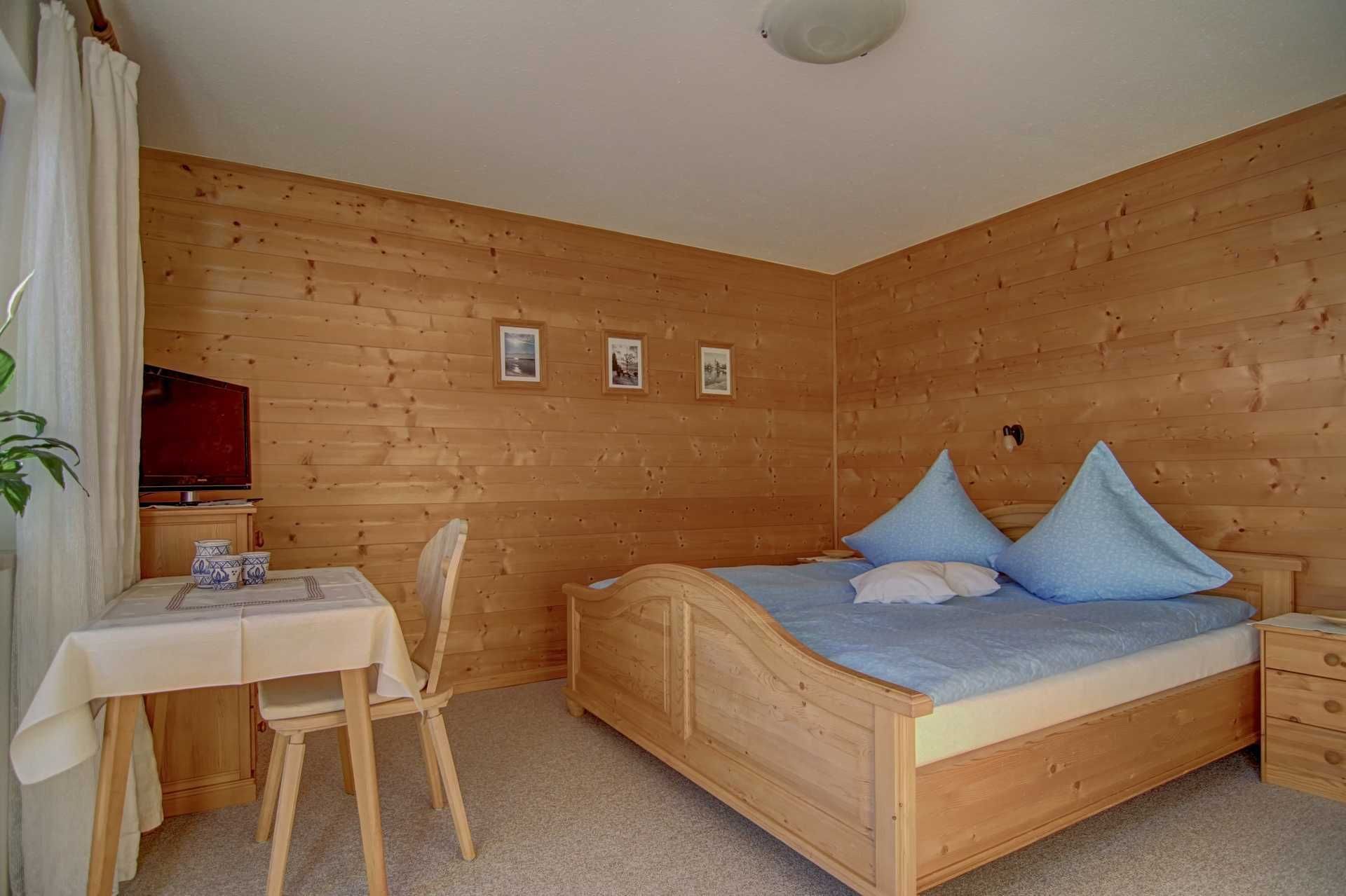 Schlafraum mit Doppelbett sowie Bad mit WC und separater Küche.