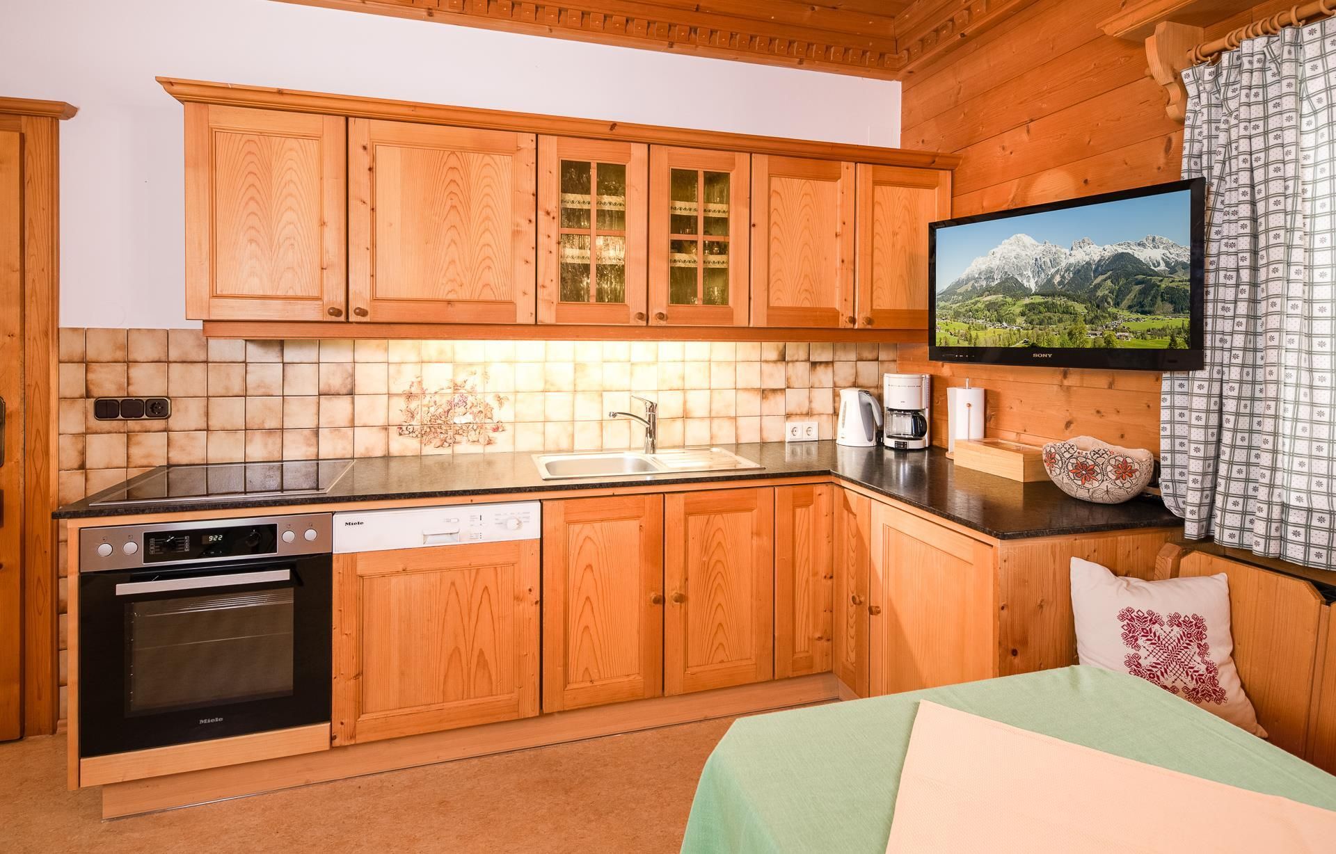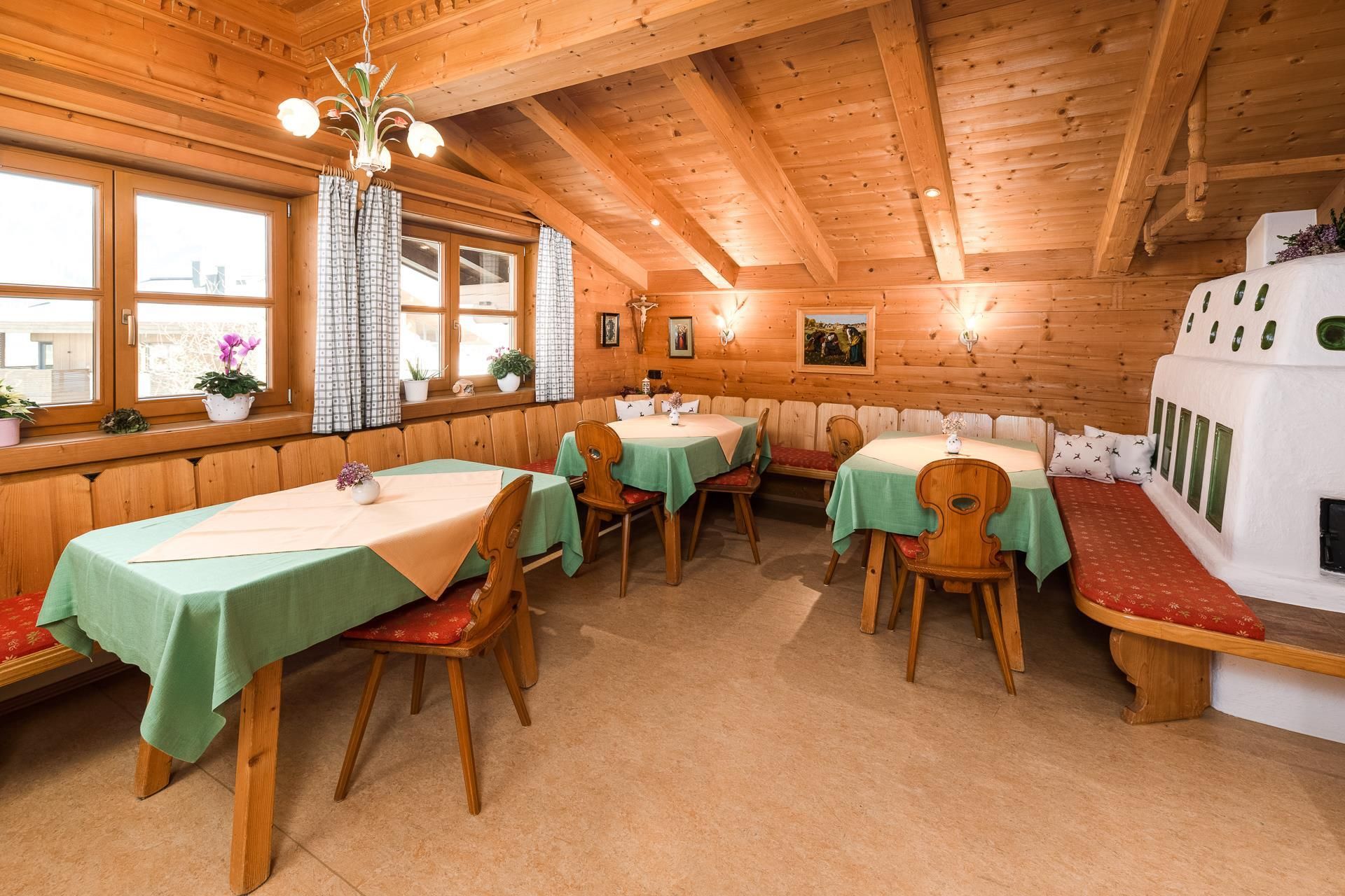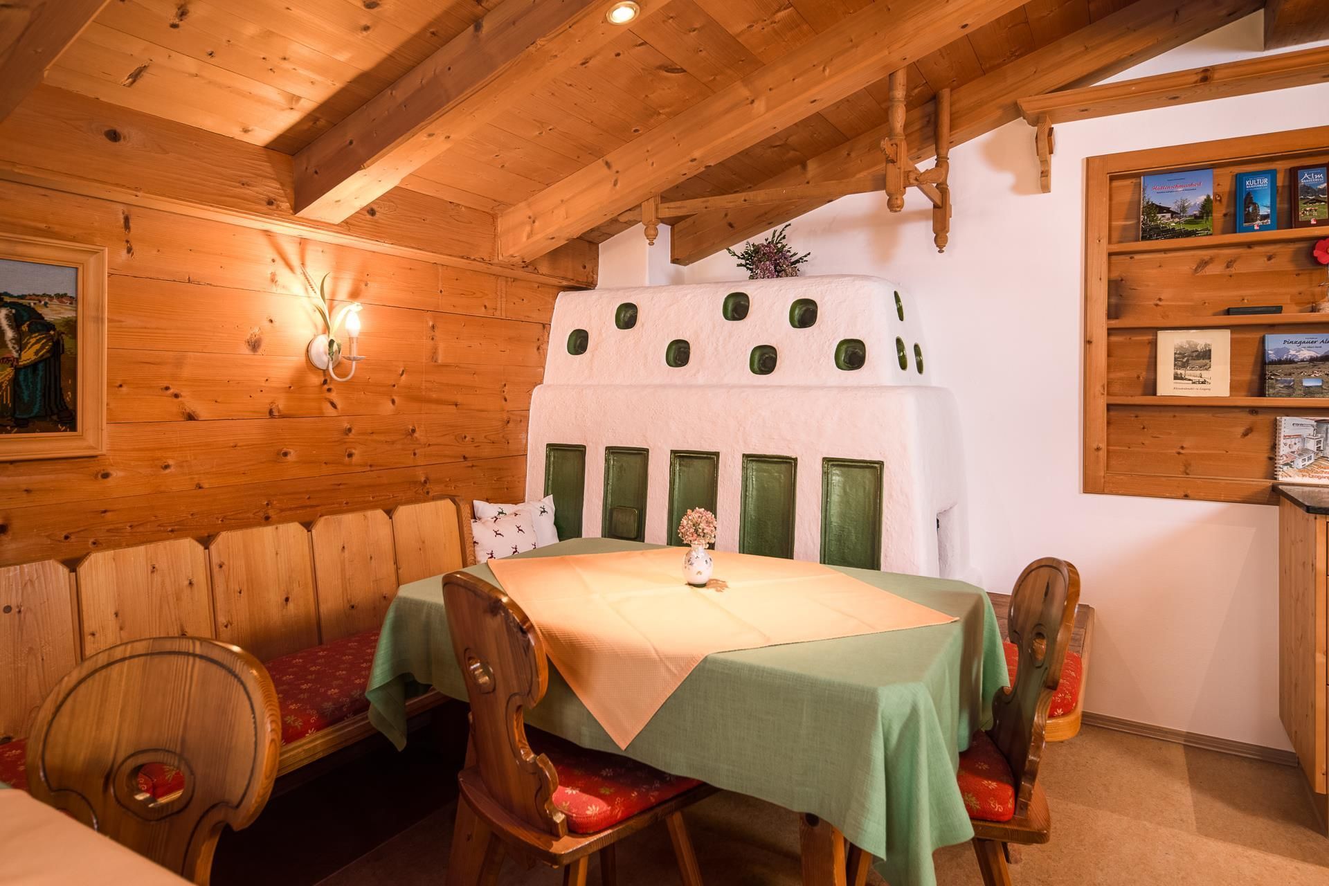 Des Weiteren bietet der große Frühstücks- bzw. Aufenthaltsraum mit gemütlichen Kachelofen eine komplett ausgestattete Gästeküche, die jederzeit benützt werden kann.