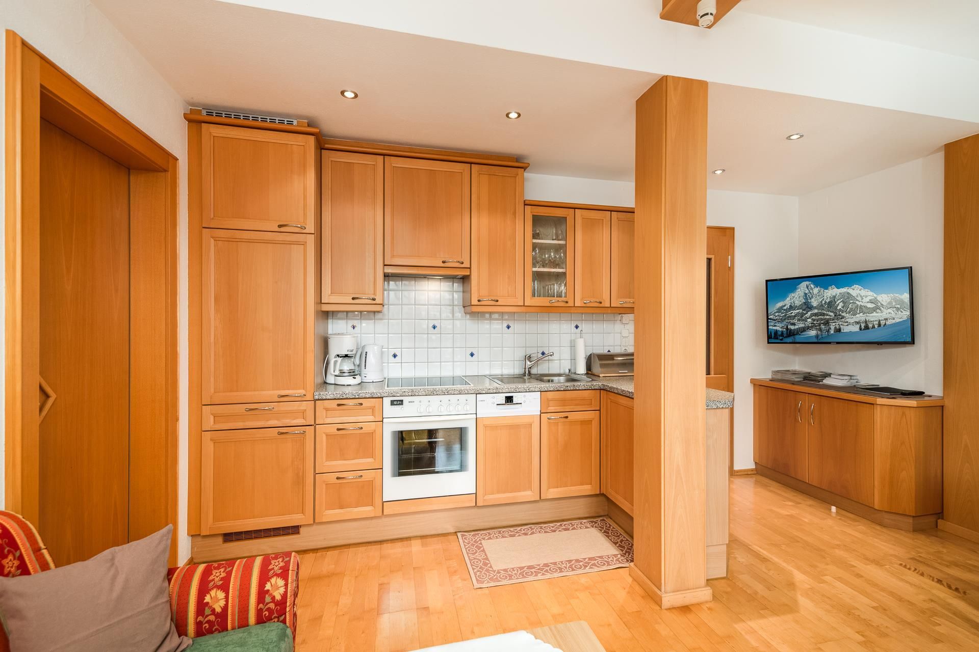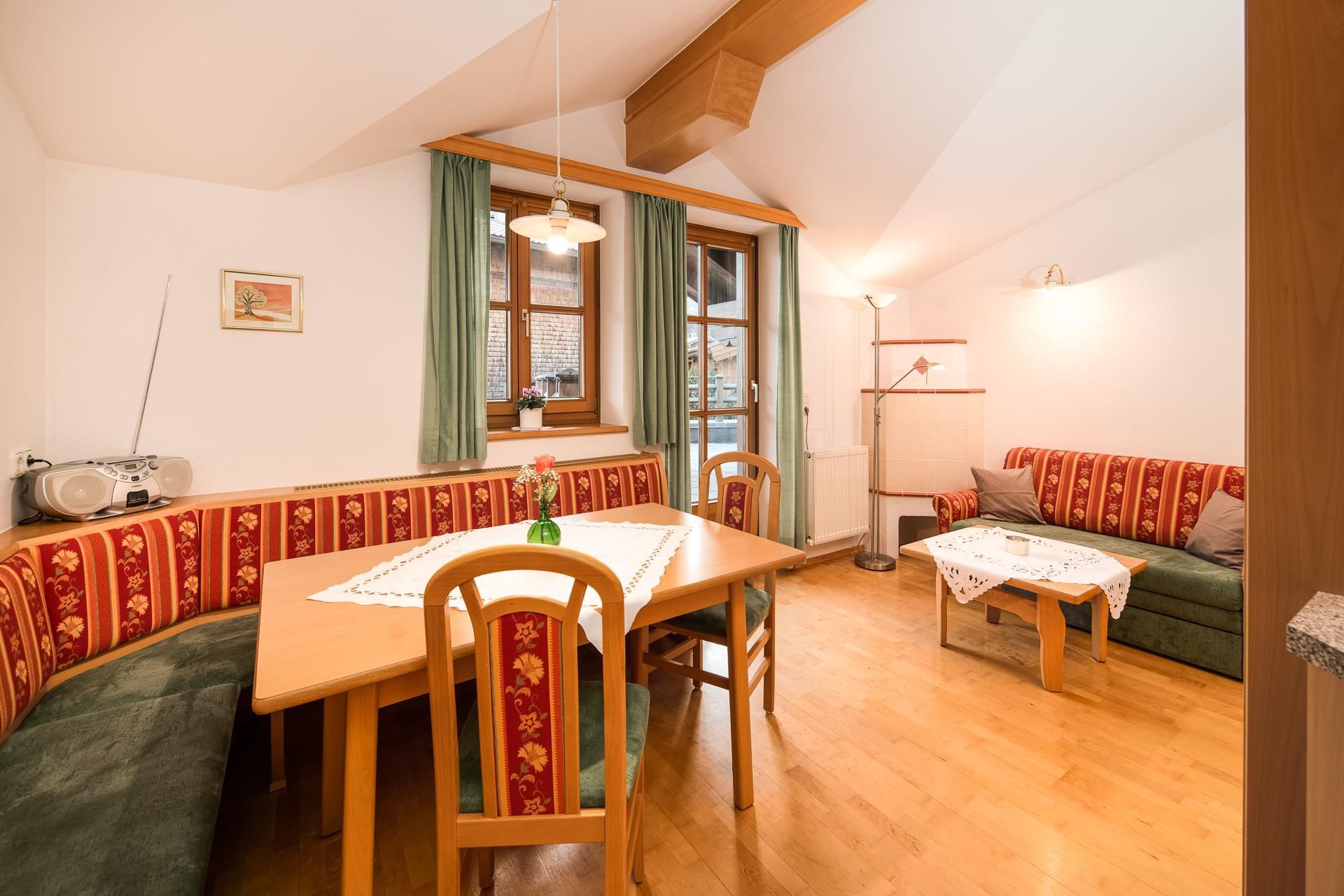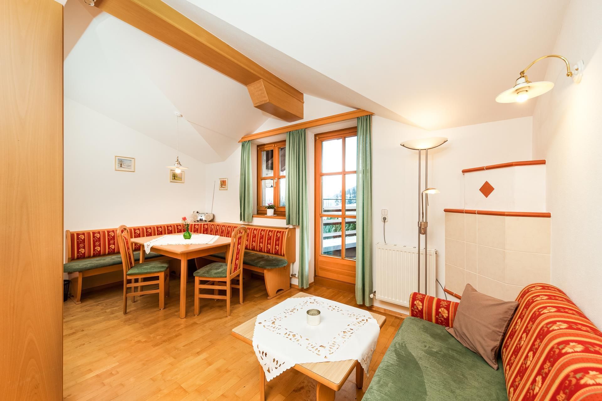 Des Weiteren bietet der große Frühstücks- bzw. Aufenthaltsraum mit gemütlichen Kachelofen eine komplett ausgestattete Gästeküche, die jederzeit benützt werden kann.