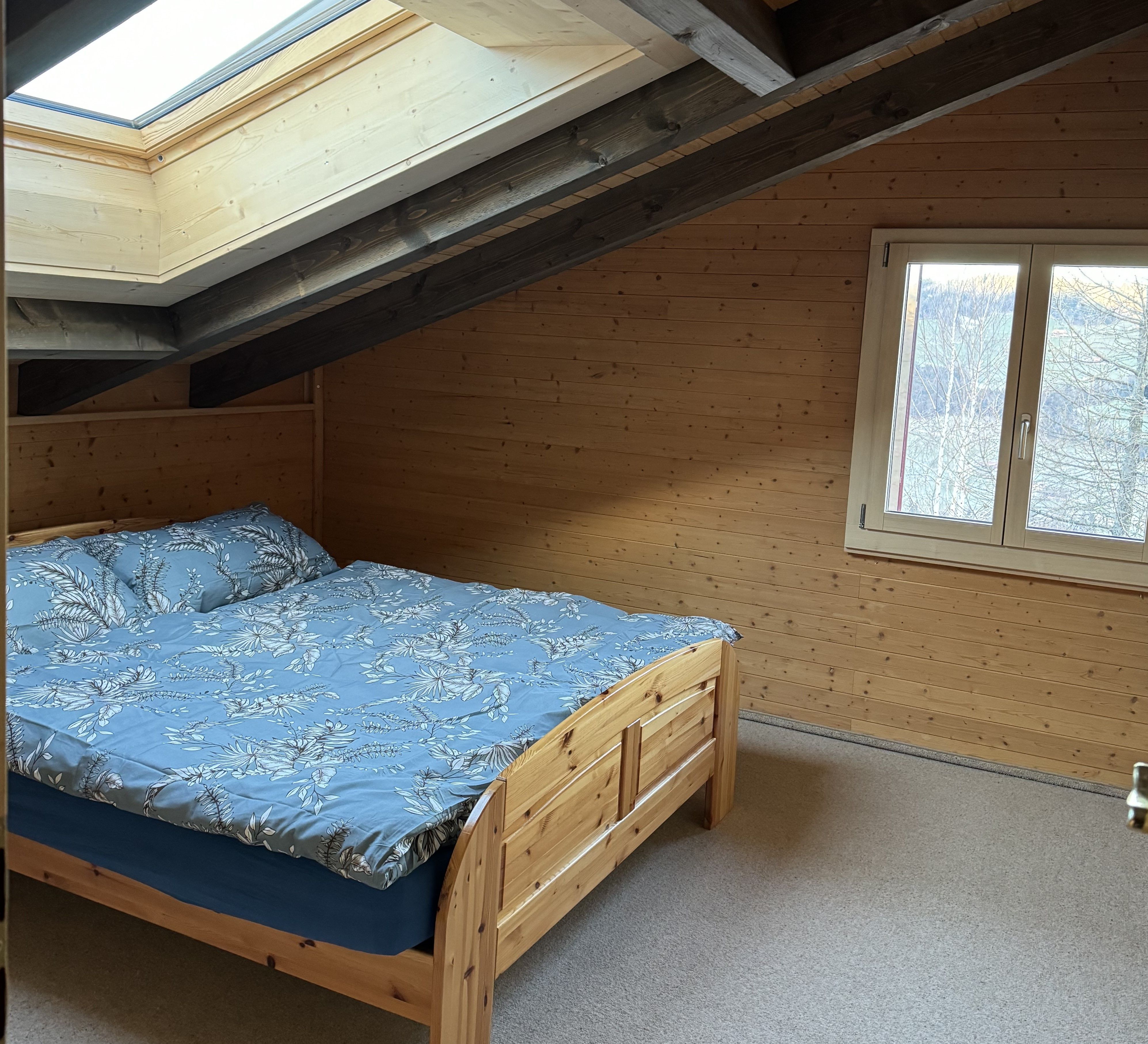 Die drei Schlafzimmer unter Dach, Ausbau alles aus Holz mit grosszügigen Dachfenstern, bieten einen heimeligen und traumhaften Ausblick in den Sternenhimmel. Zwei Schlafzimmer verfügen über ein Doppelbett (180 x 200 cm), das dritte verfügt über ein Einzelbett (90 x 200 cm). Bettwäsche ist vorhanden.
