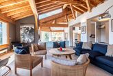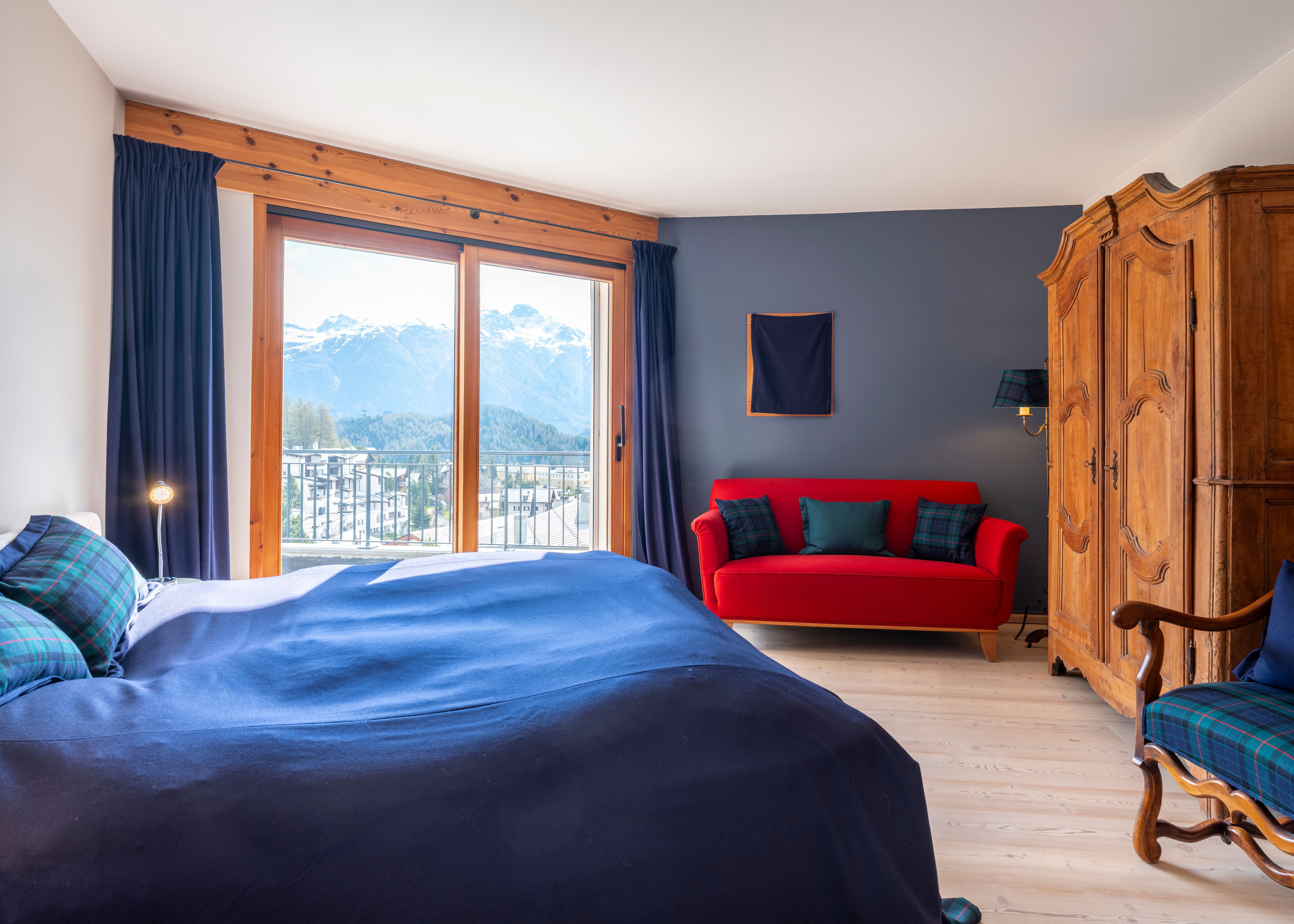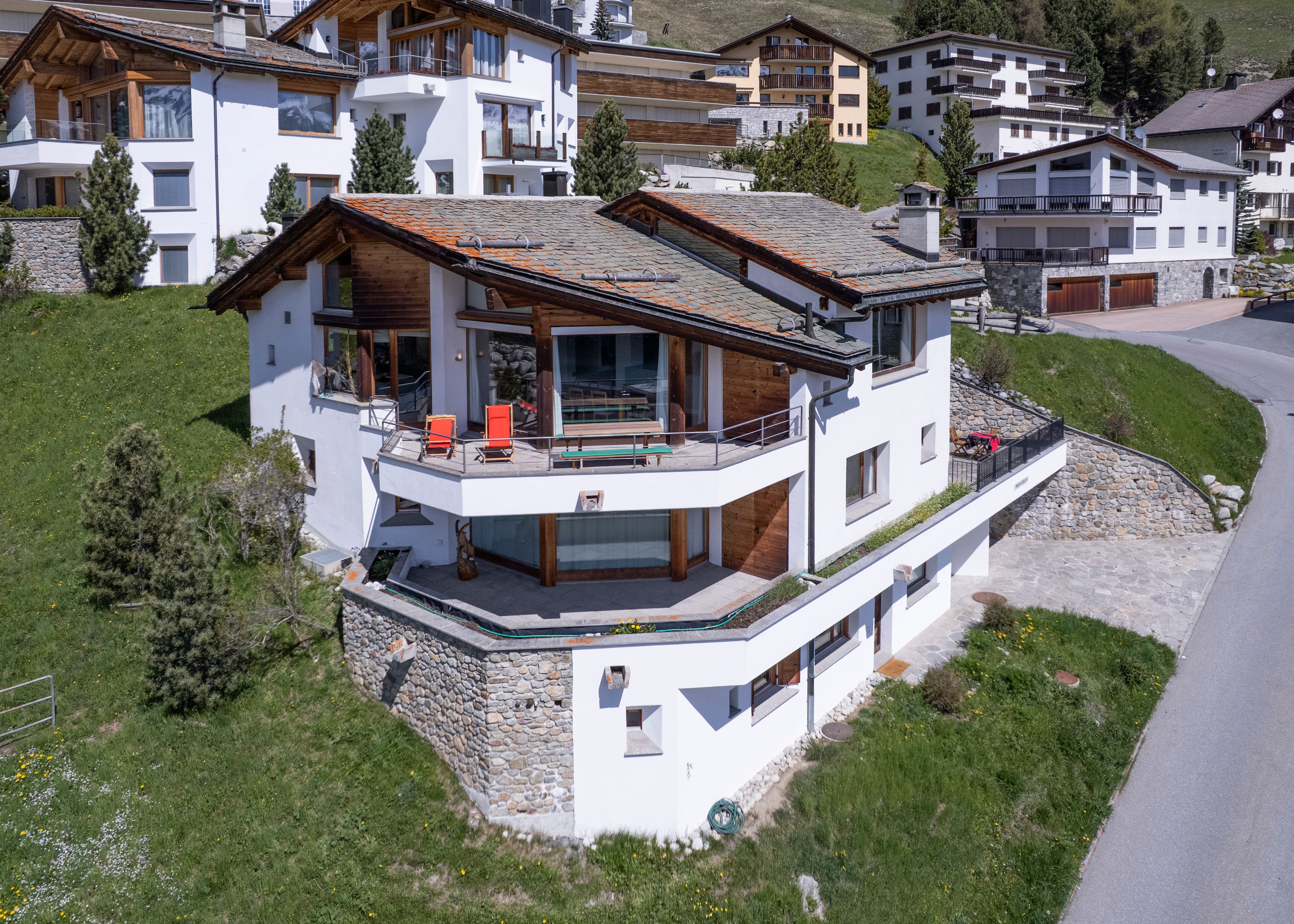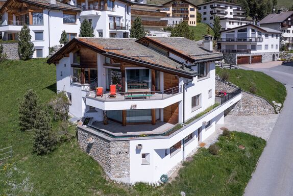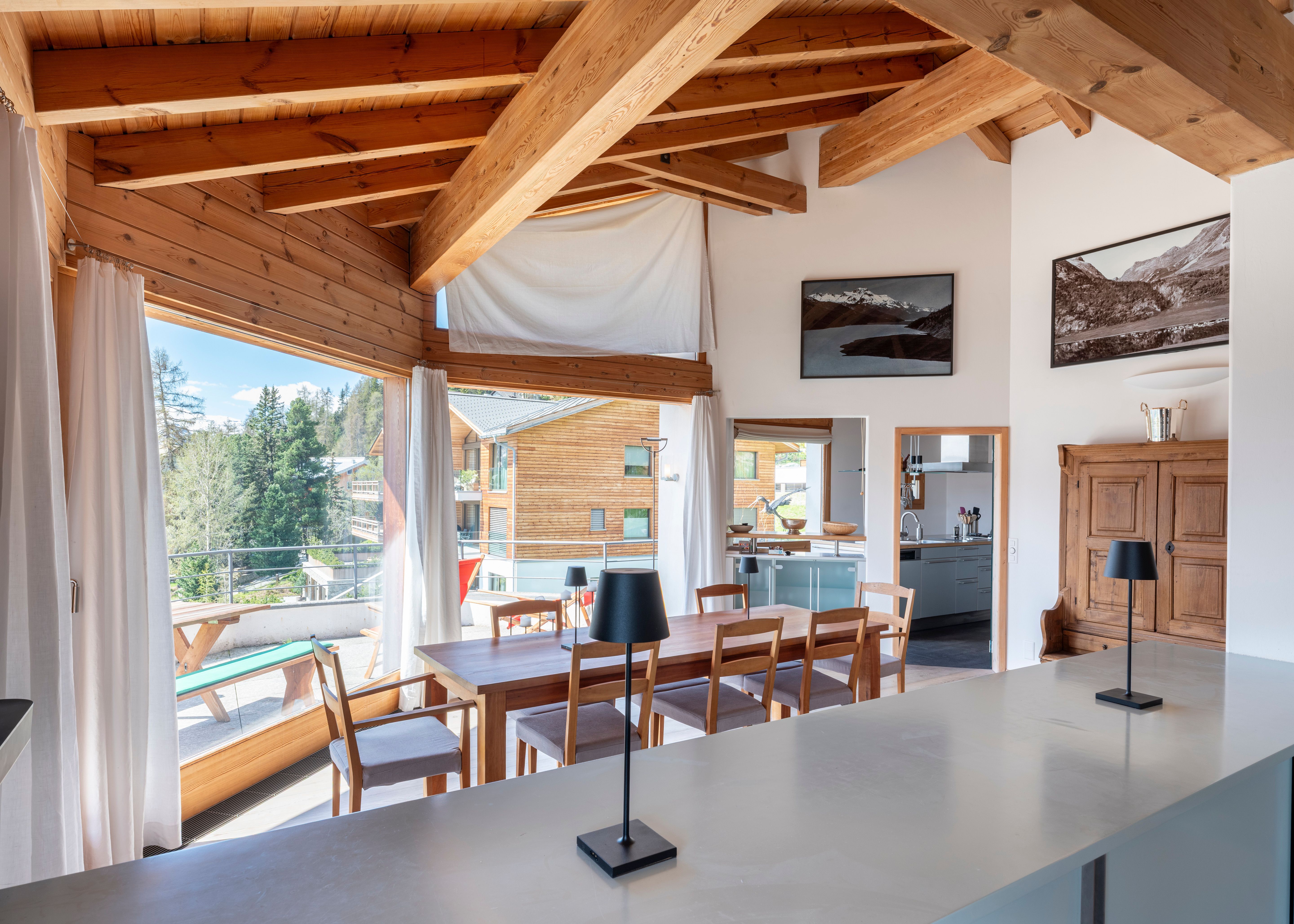 Das Wohnzimmer bietet einen einmalig wunderbaren Ausblick über ganz St. Moritz inklusive See. Bei Sonnenschein laden die Terrassen ein die Aussicht und Wärme zu geniessen.