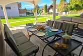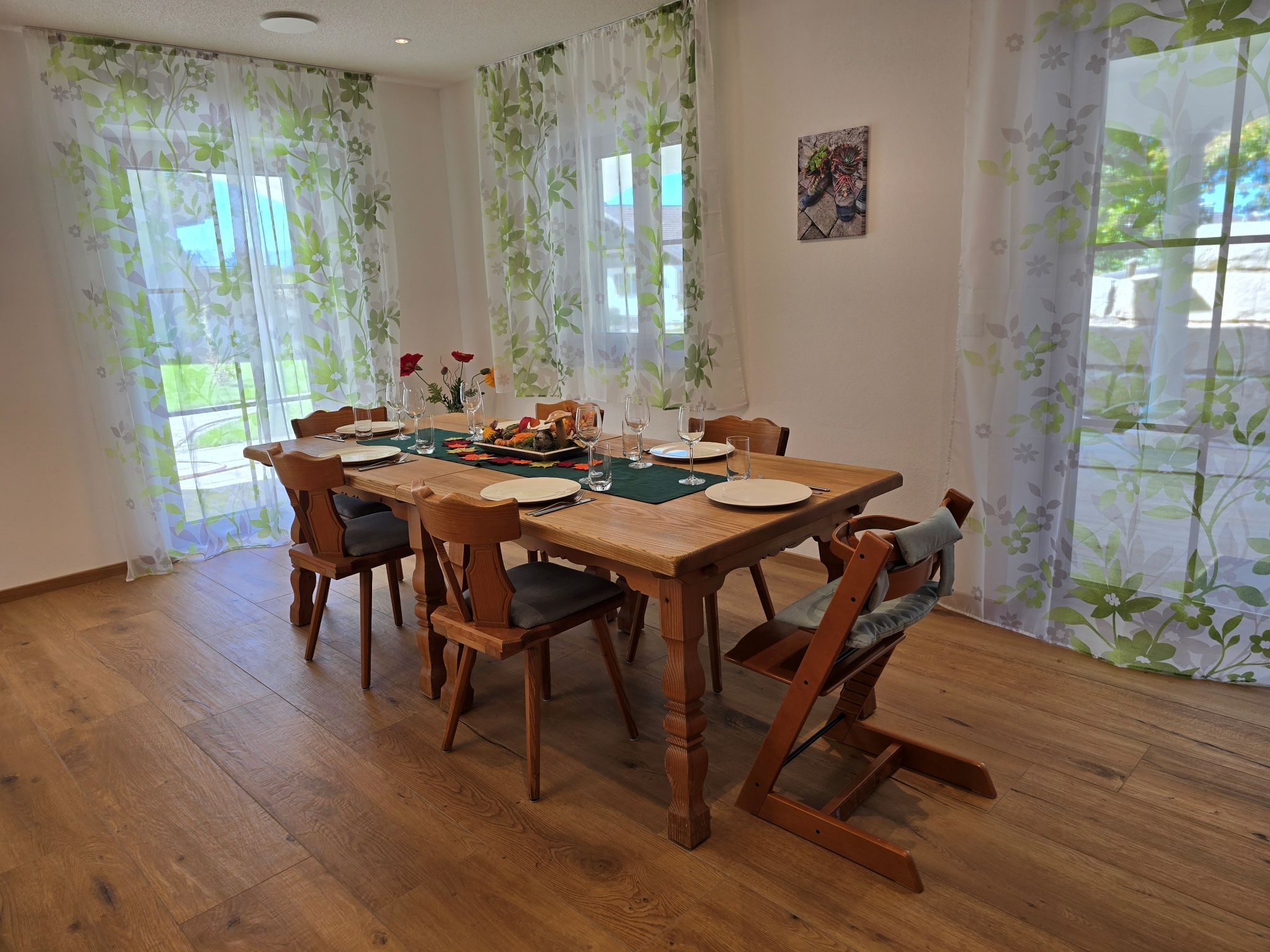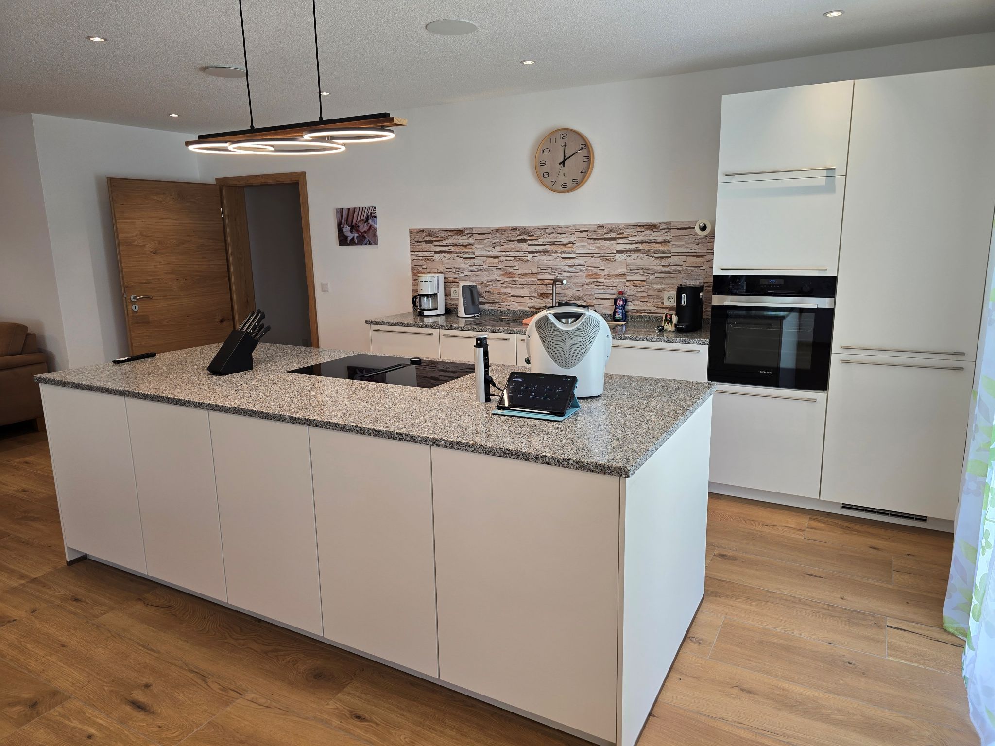 Die Wohnung liegt im Gartengeschoss eines nagelneu gebauten, nachhaltig konzipierten Zweifamilienhauses. Alles ist barrierefrei gestaltet und mit Liebe zum Detail im gemütlichen Landhausstil eingerichtet. Auf rund 135 m² Wohnfläche finden sich zwei Schlafzimmer mit bequemen Doppelbetten, ein sehr großzügiger Wohn-Essbereich mit Kochinsel und eine moderne Küche, die auch ambitionierten Hobbyköchen alles bietet – inklusive Thermomix.