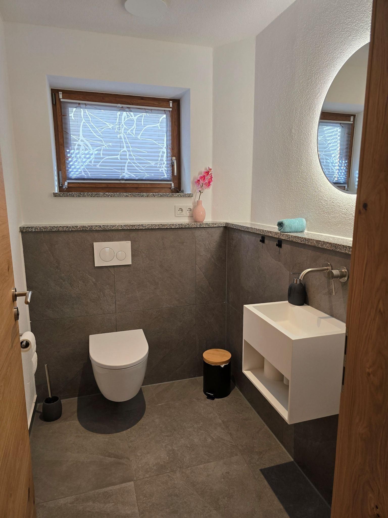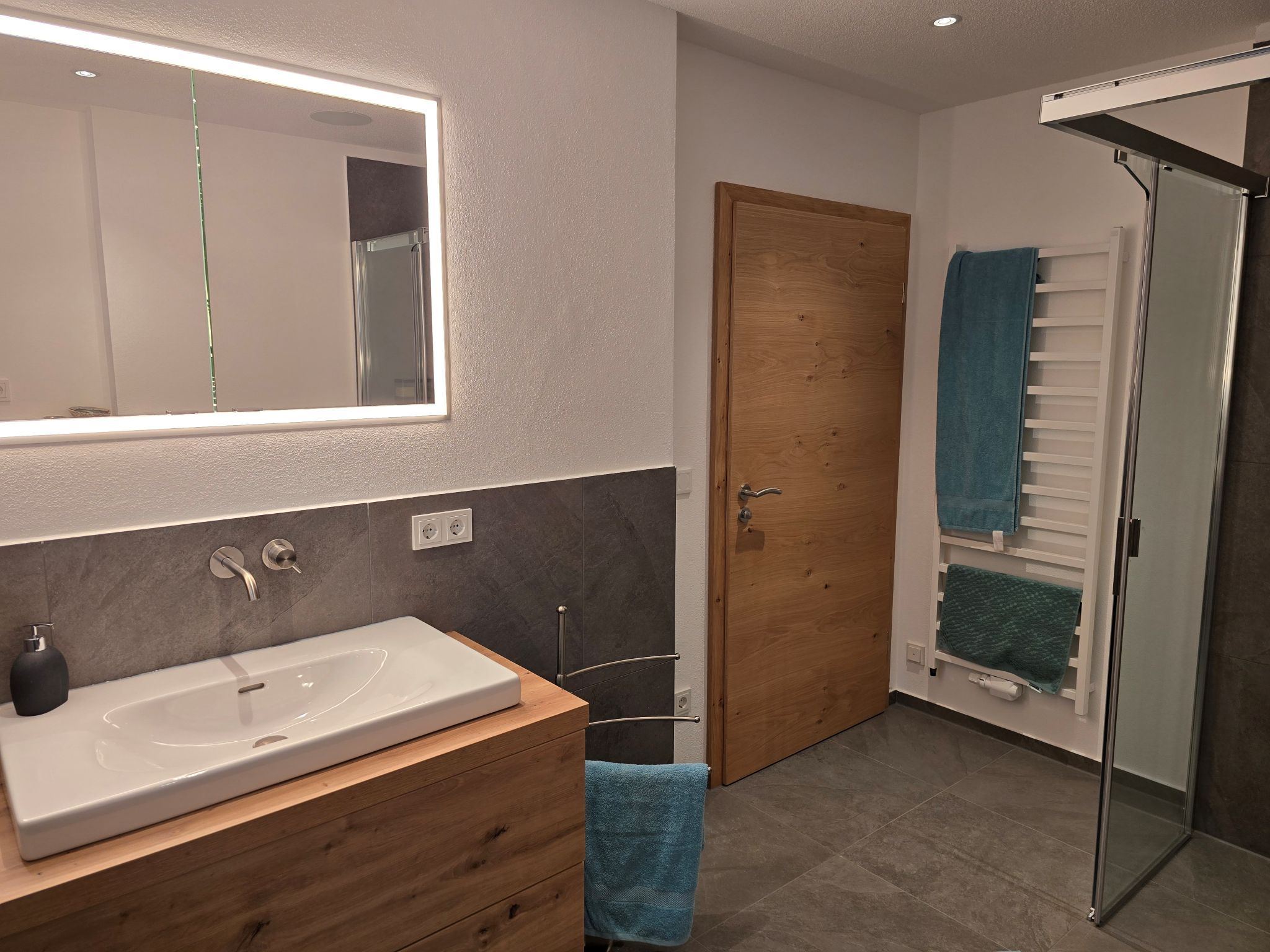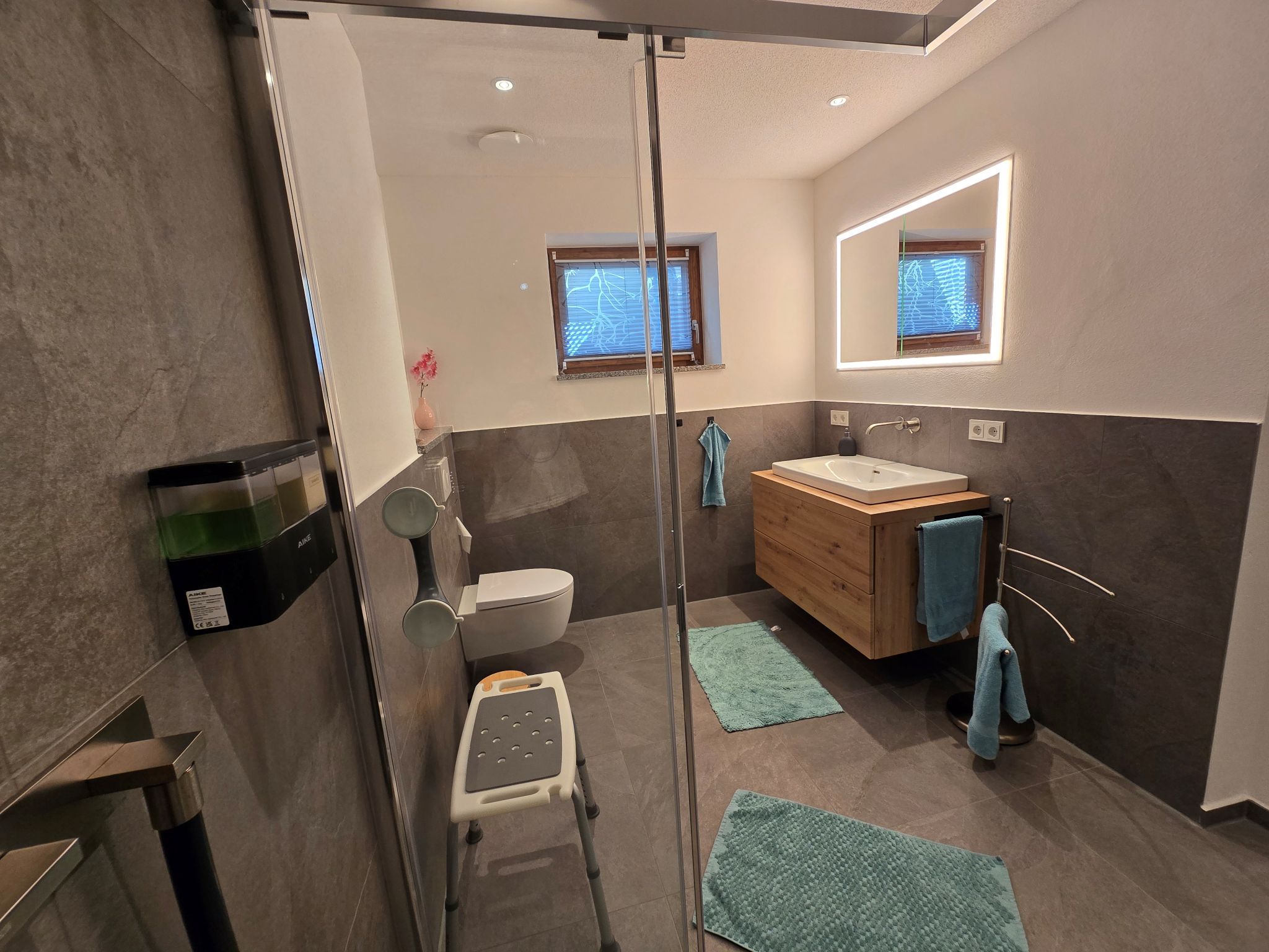 Das Bad verfügt über eine Regendusche sowie eine Infrarot-Sonnendusche zum Aufwärmen. Ein separates WC sorgt für zusätzlichen Komfort. Technisch ist die Wohnung bestens ausgestattet: Smart-Home-System (Loxone), Lüftungsanlage mit Pollenfilter, Farbbeleuchtung, Lautsprechersystem, kostenlosen highspeed WLAN, extragroßen Smart-TV – alles vorhanden, um den Aufenthalt angenehm zu gestalten.