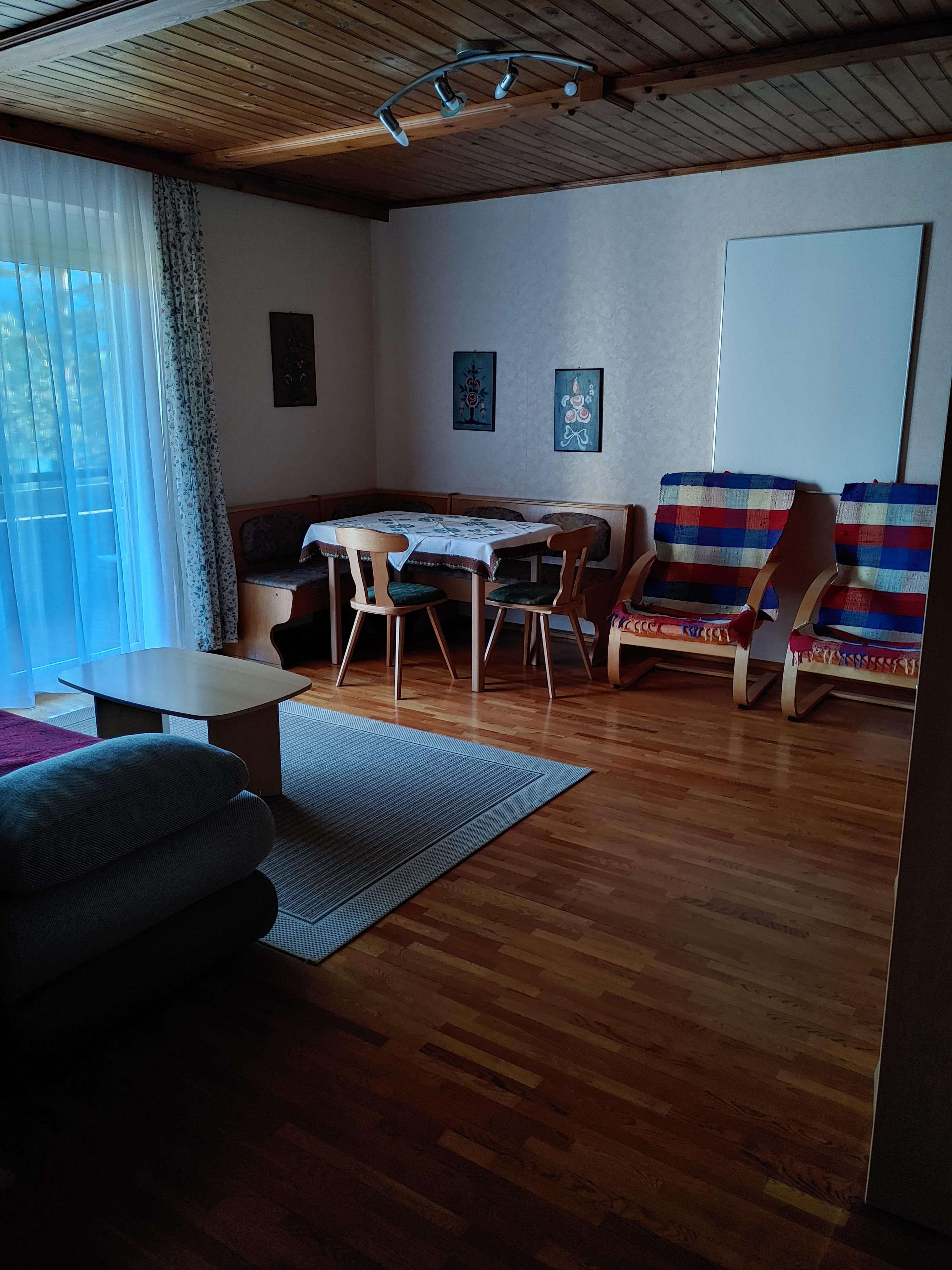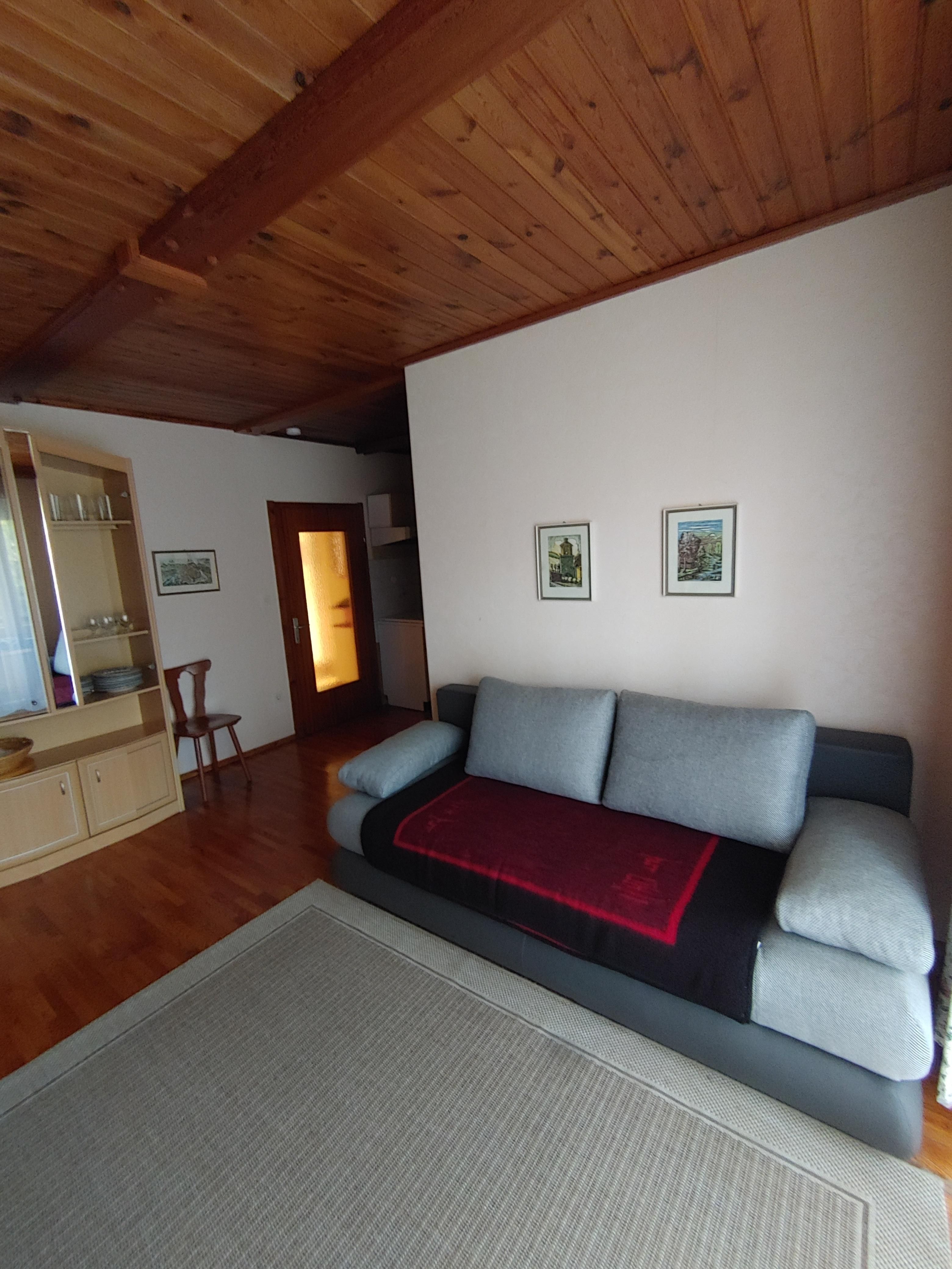 Das Apartment für zwei Personen besteht aus einem Vorraum, einem Badezimmer mit Dusche und WC, sowie einem Wohnraum mit Kochnische und einen abgetrennten Schlafraum für zwei Personen. Auf dem Schlafsofa im Wohnzimmer können bei Bedarf zwei weitere Schlafgelegenheiten eingerichtet werden. Der südseitige Balkon bietet einen prächtigen Blick auf den Pressegger See und die Karnischen Alpen.