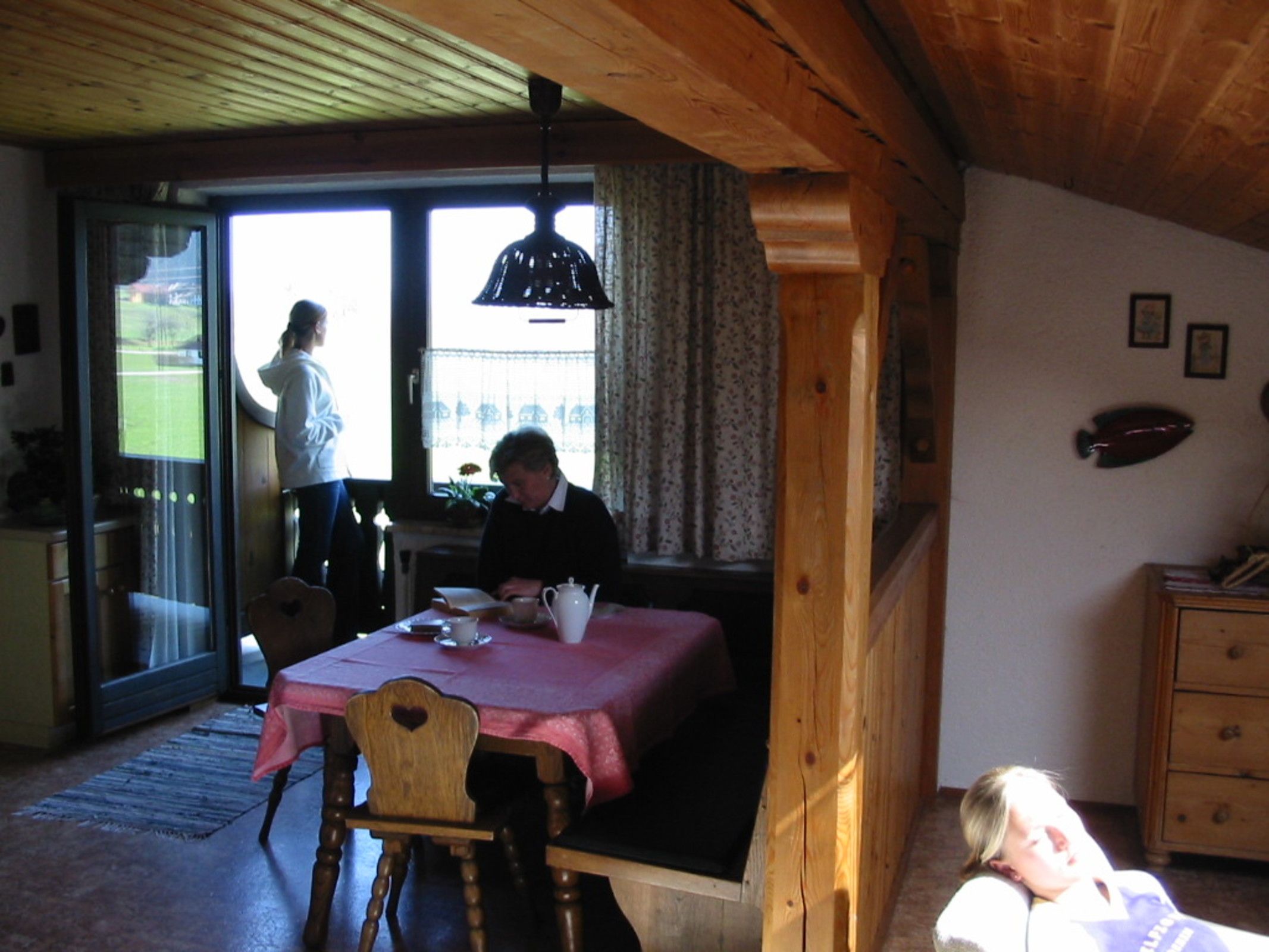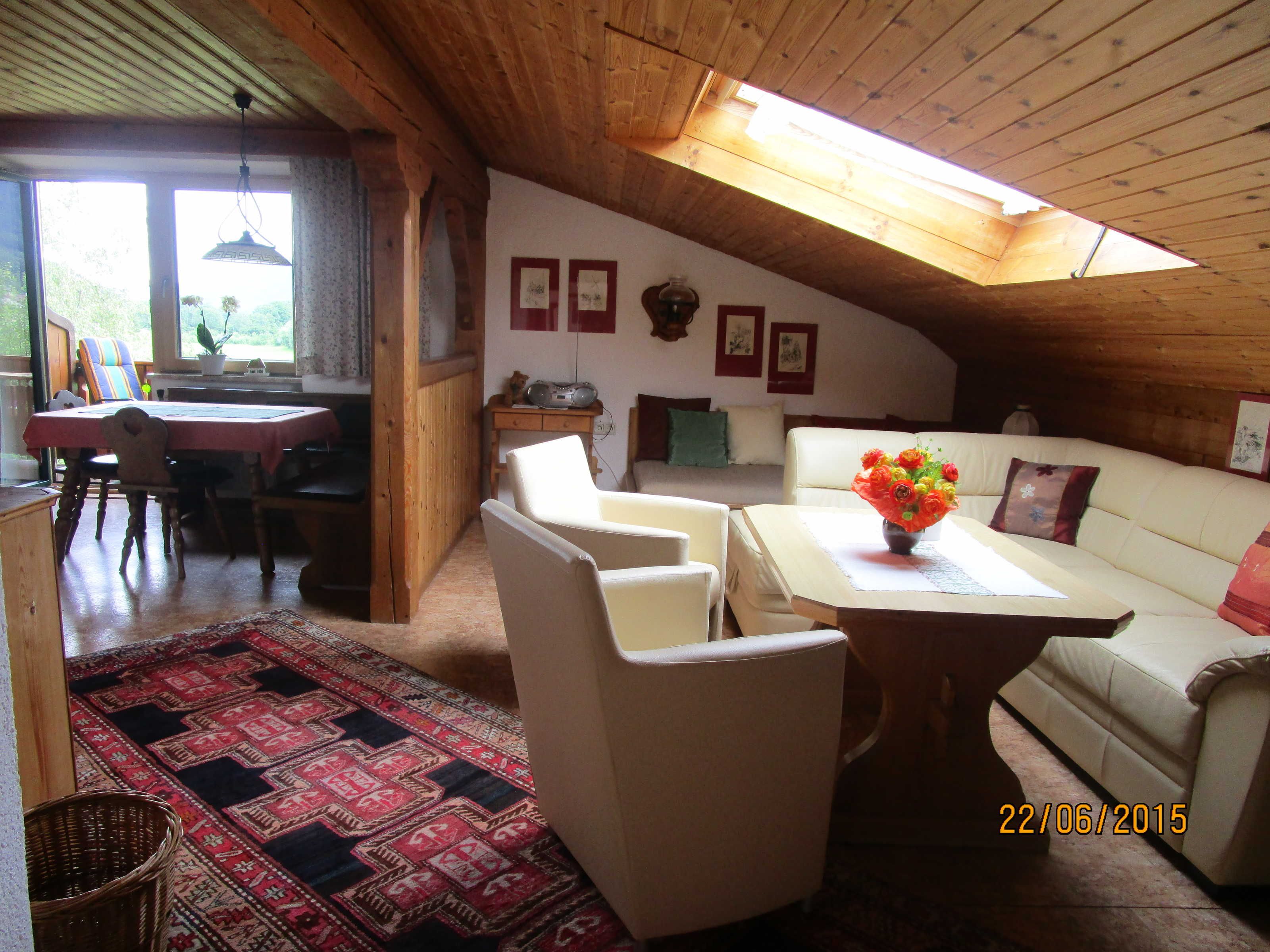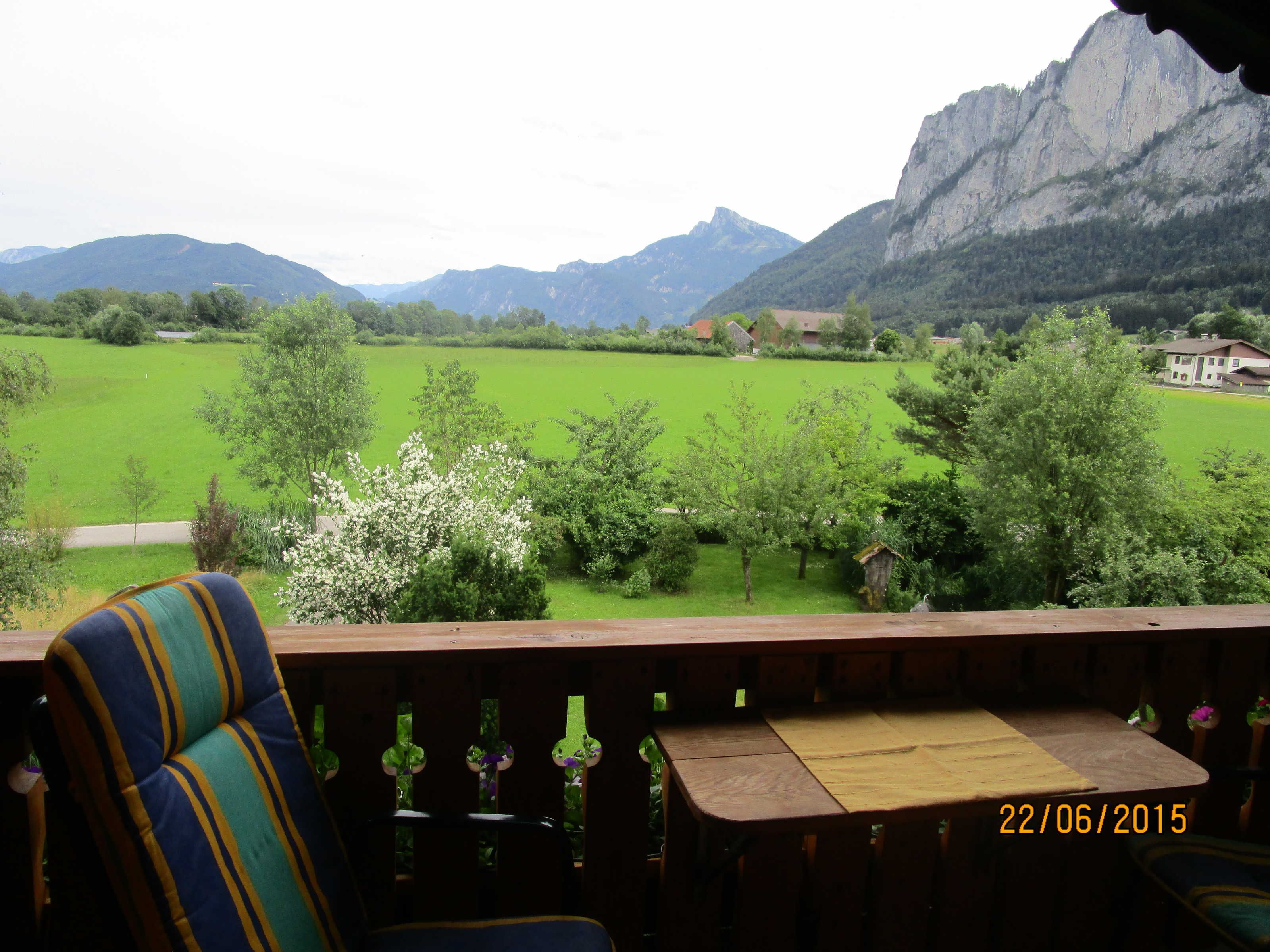 Vom Balkon aus sehen Sie über die Wiesen hinweg den Schafberg und die Drachenwand.