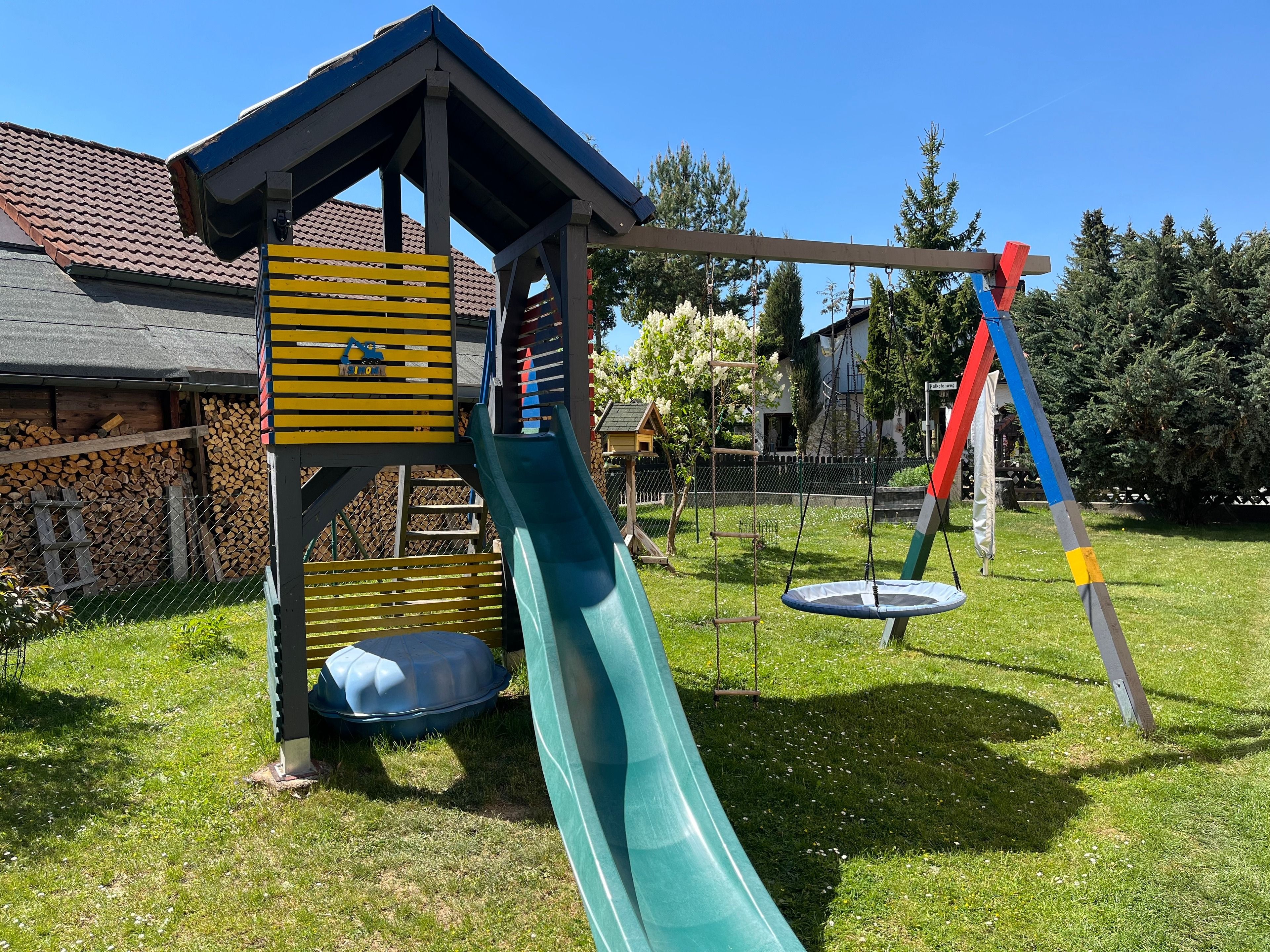 Für Familien mit Kindern bietet unser eingezäuntes Grundstück jede Menge Freiraum. Ein Spielturm mit Schaukeln, Rutsche und Sandkasten steht ebenfalls zur Verfügung.