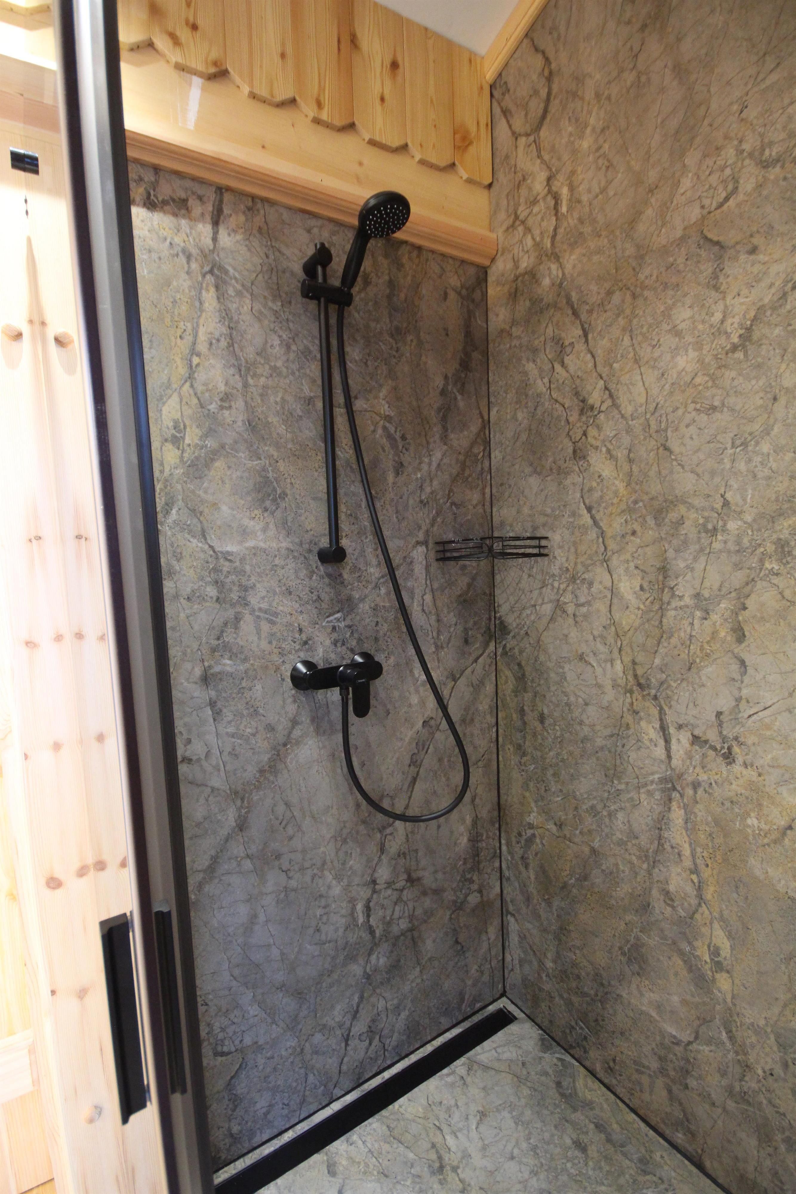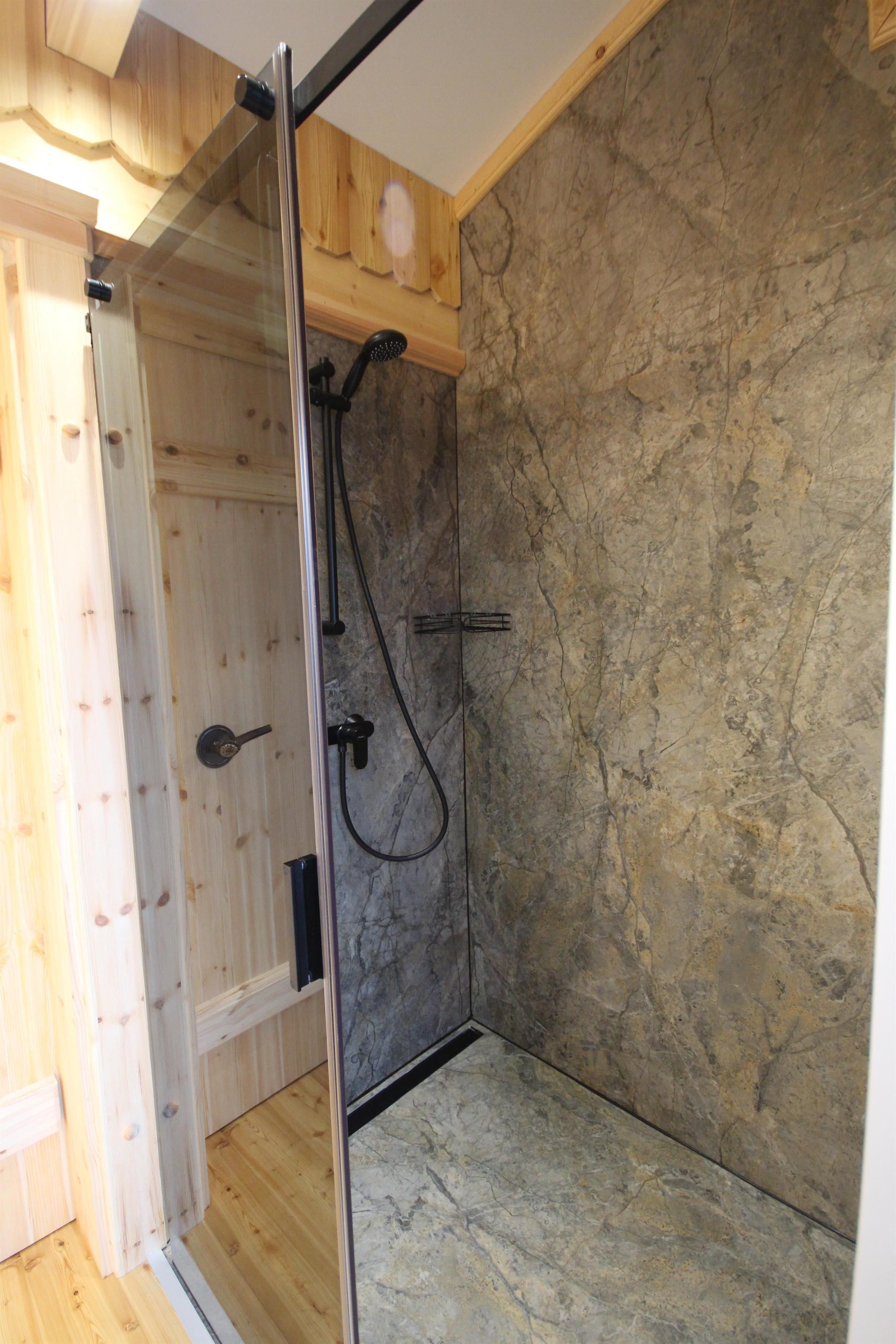 • Ein geräumiges Badezimmer mit Dusche und Waschtisch