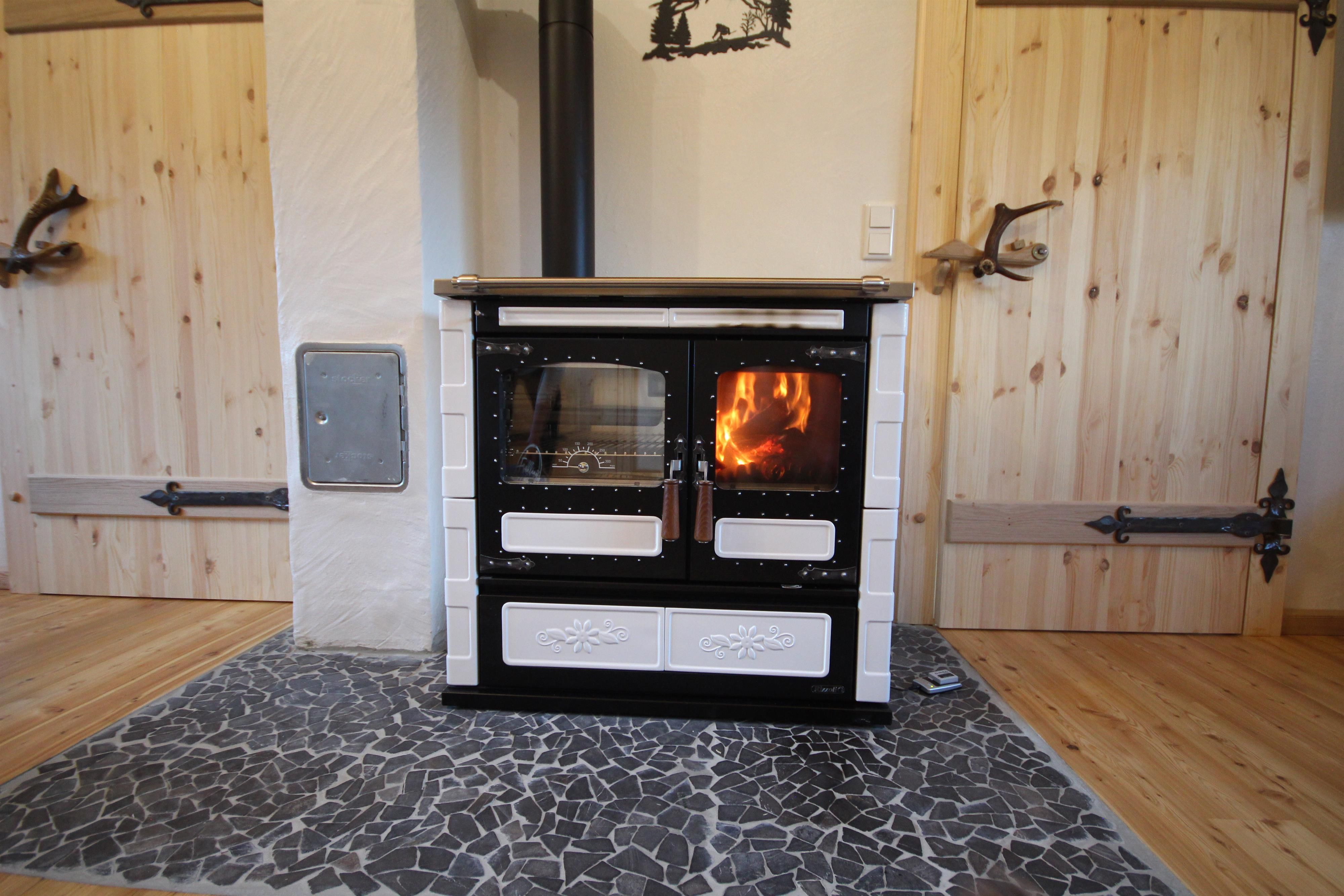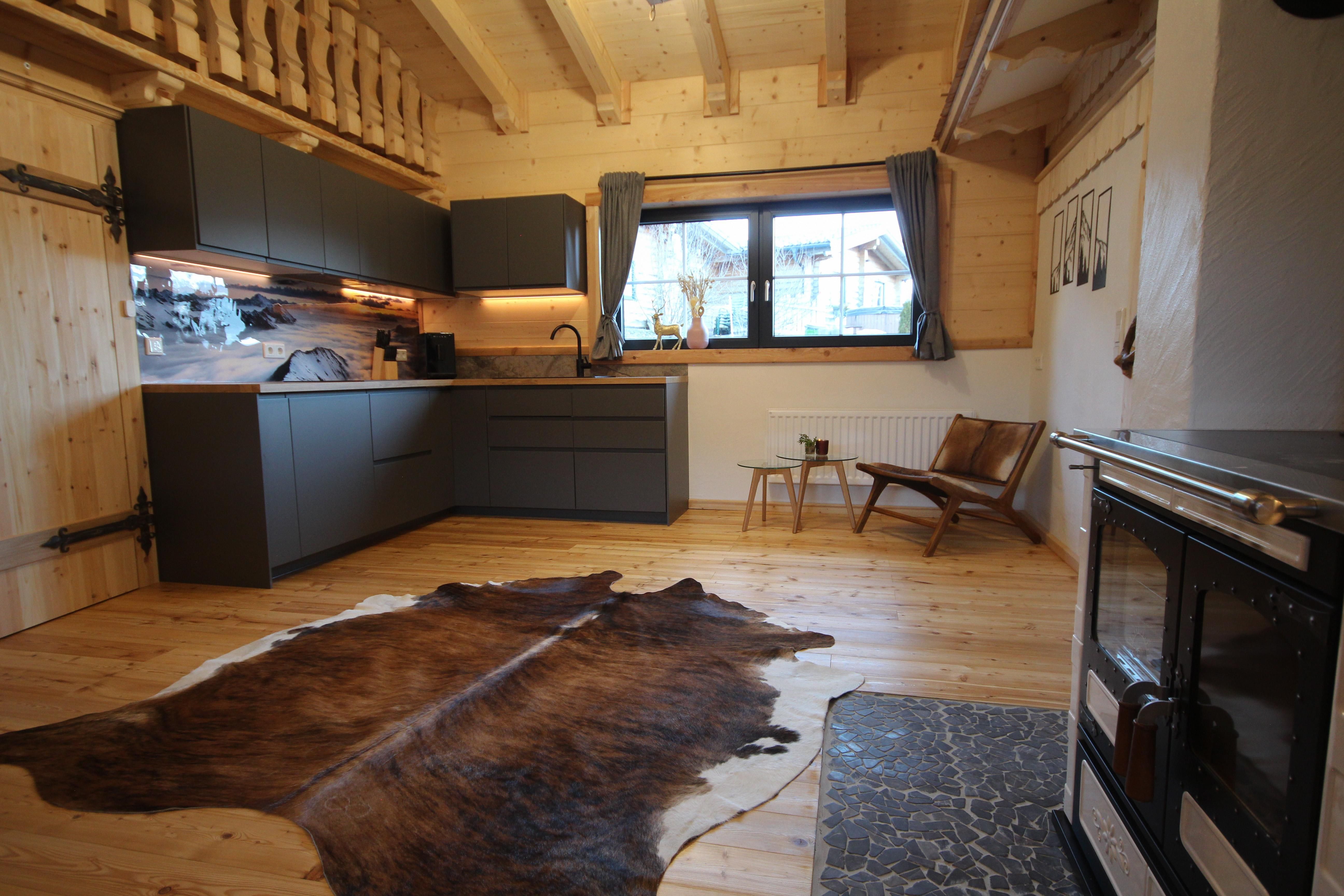 • Voll eingerichtete offene Küche mit Sitzecke und großem Jogeltisch im Landhausstil