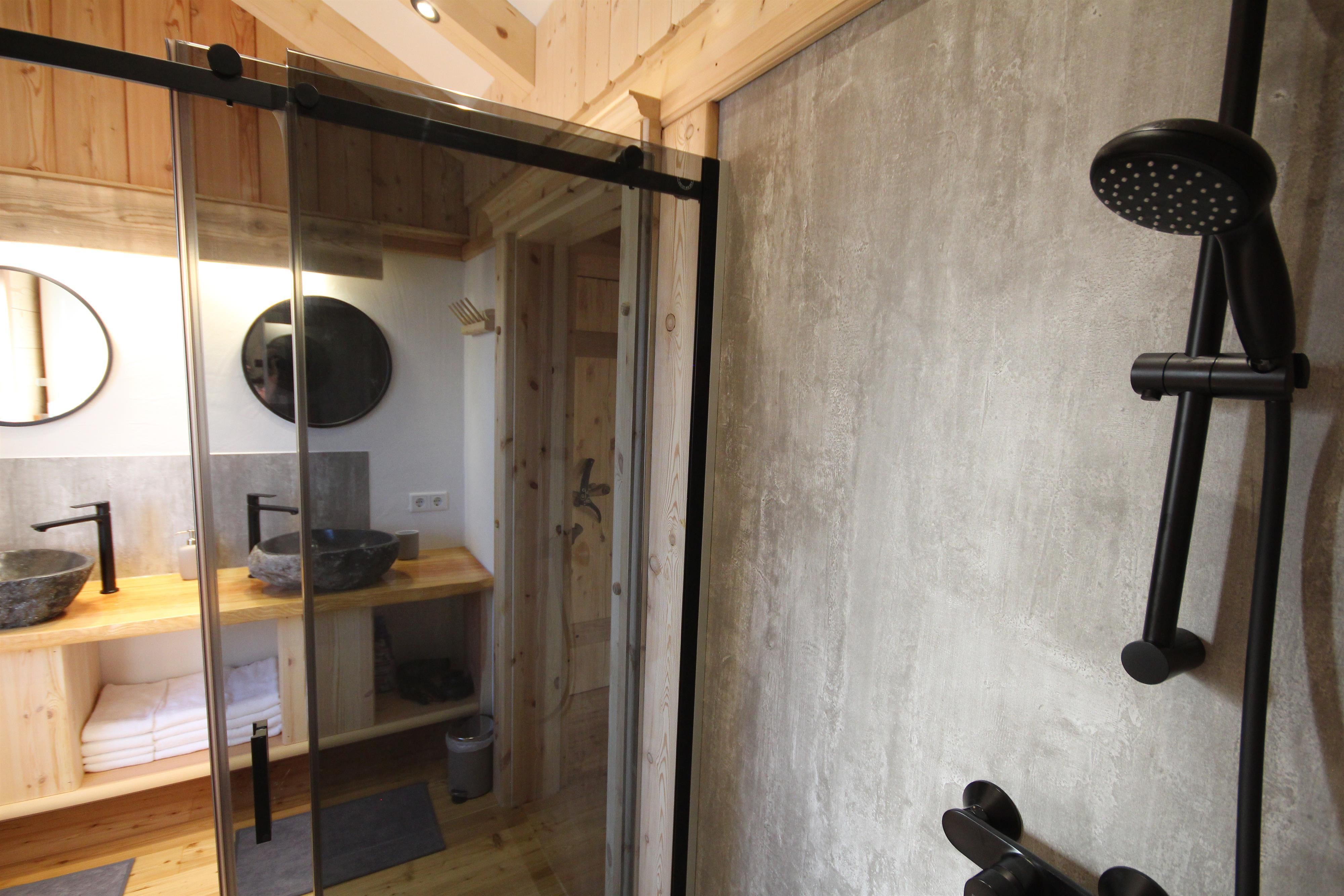 • Ein geräumiges Badezimmer mit Dusche und Waschtisch