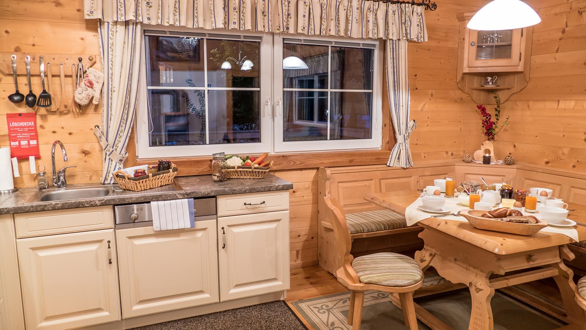 • Voll eingerichtete offene Küche mit Sitzecke und großem Jogeltisch im Landhausstil