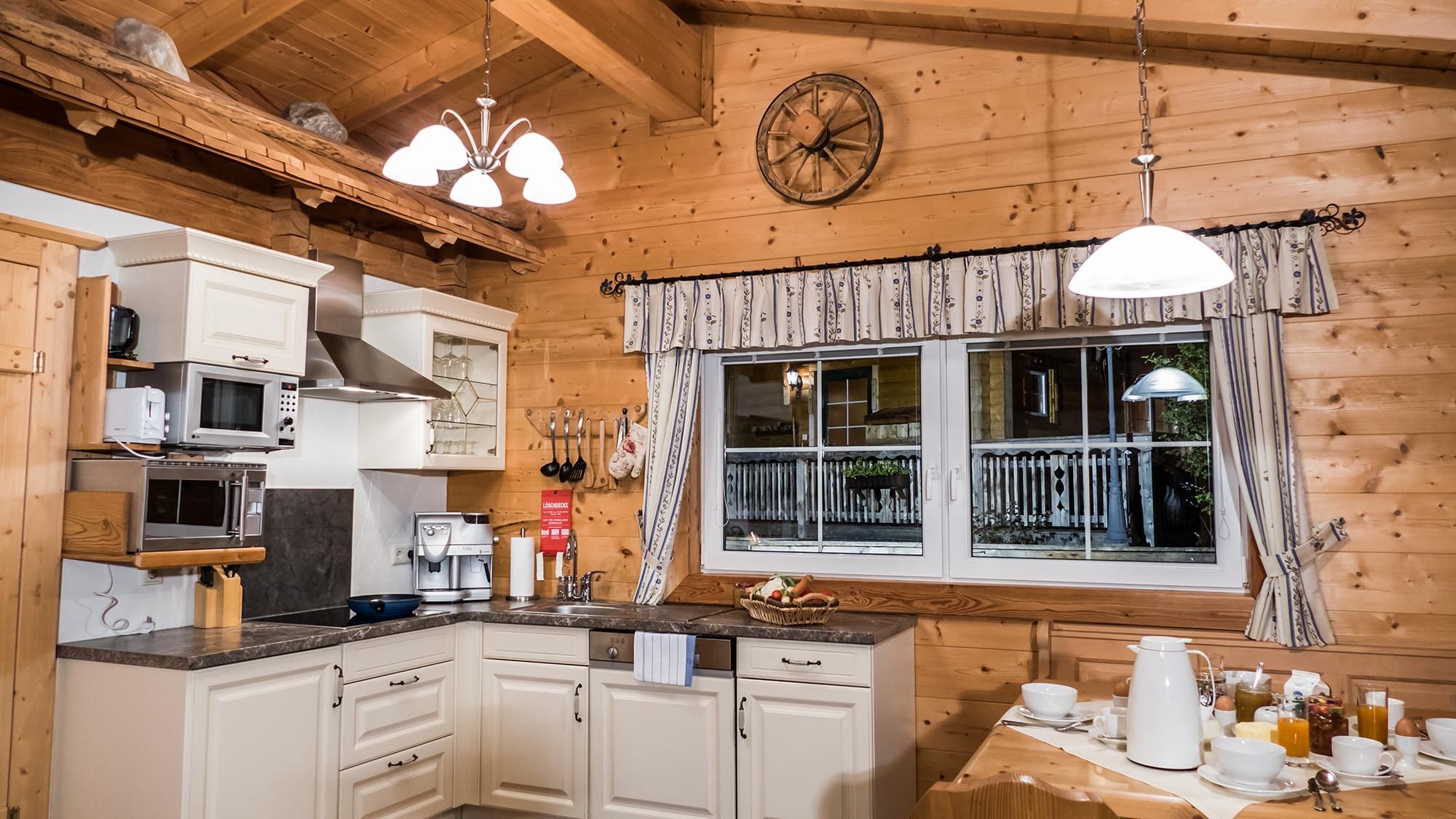 • Voll eingerichtete offene Küche mit Sitzecke und großem Jogeltisch im Landhausstil