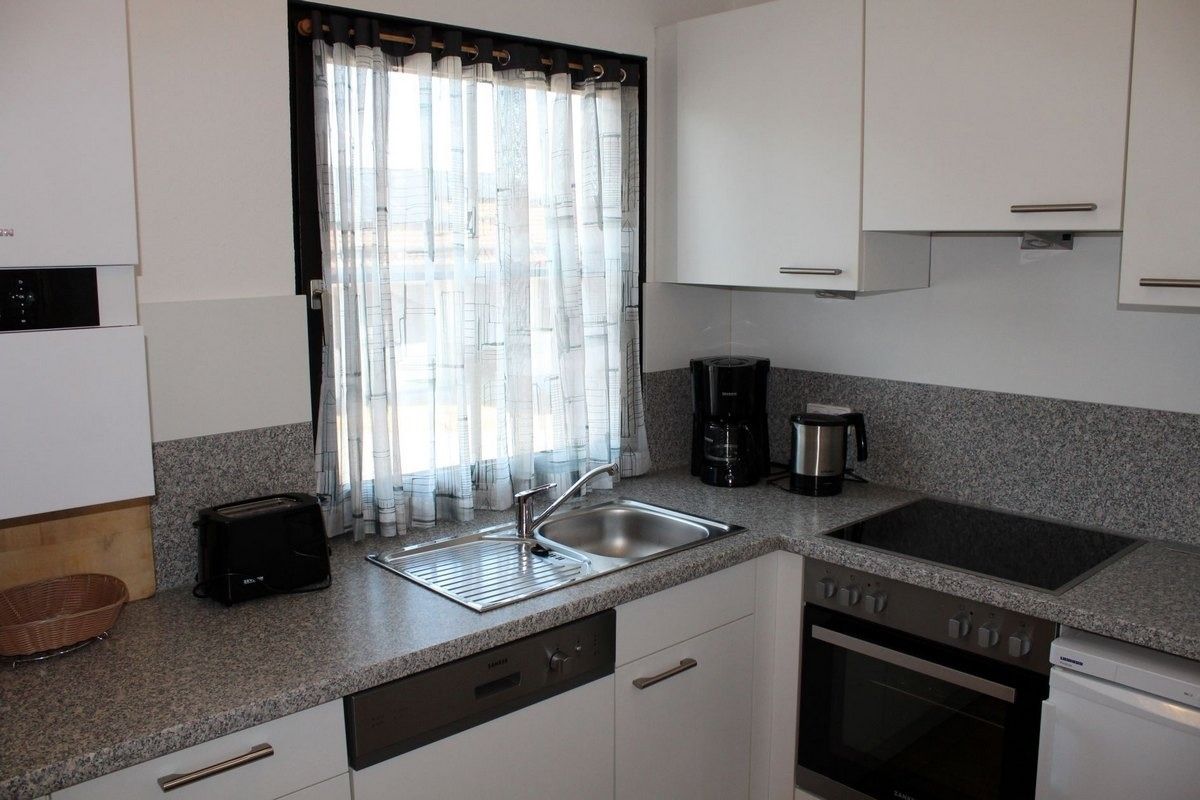 Voll ausgestattete Küche: Kühlschrank mit Gefrierfach, Herd (Ceranfeld), Dunstabzug, Geschirrspüler, Backofen, Wasserkocher, Toaster, Kaffeemaschine, Besteck, Geschirr, Gläser, Töpfe und alle gebräuchlichen Küchenutensilien.