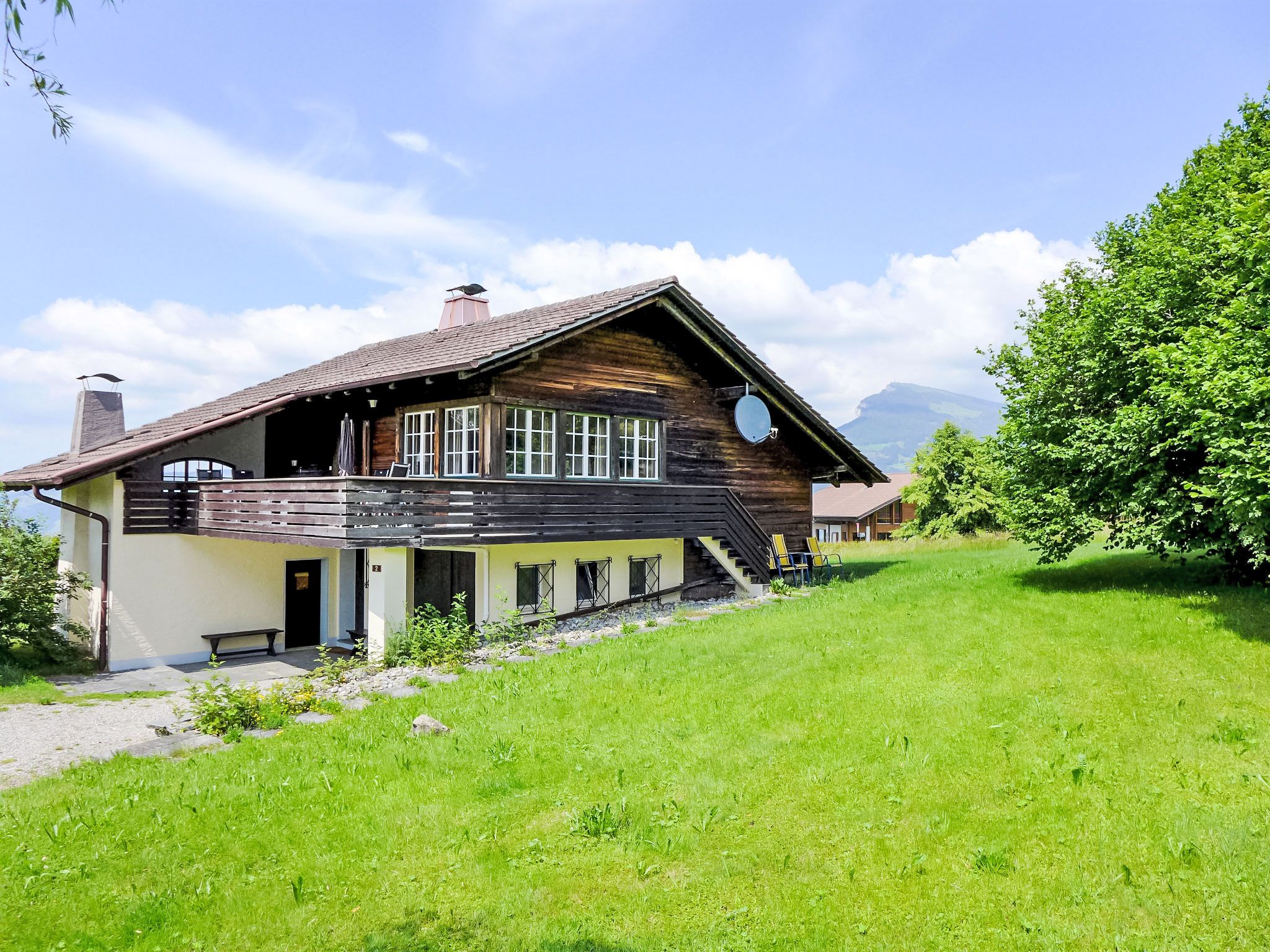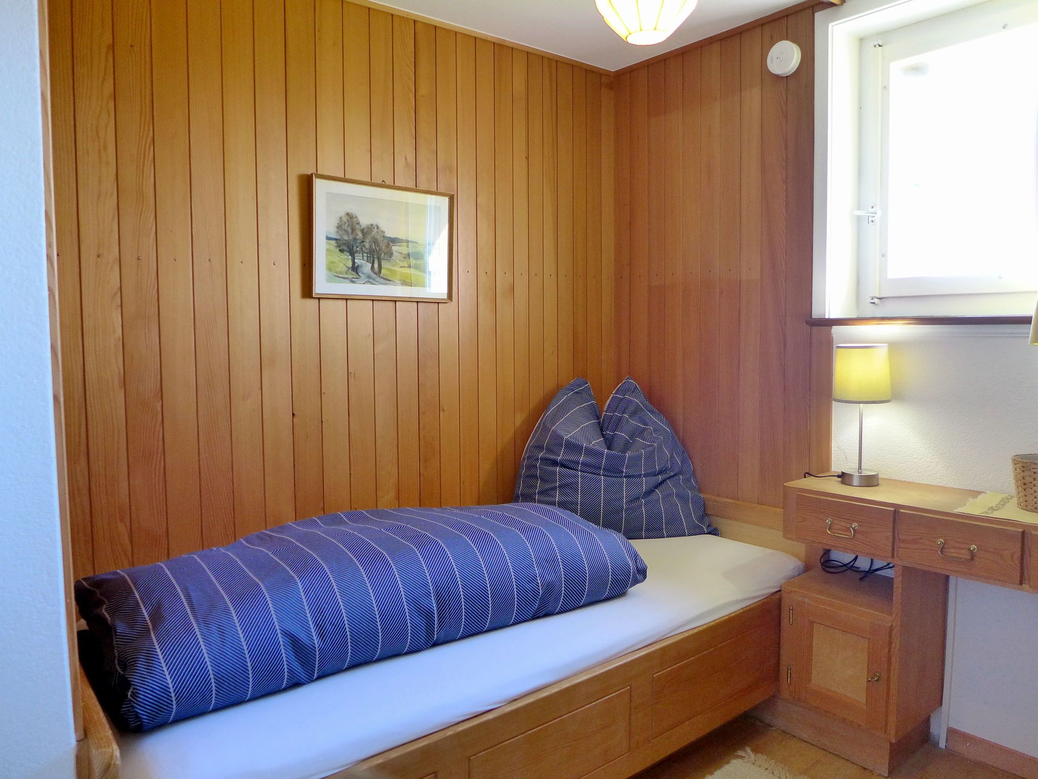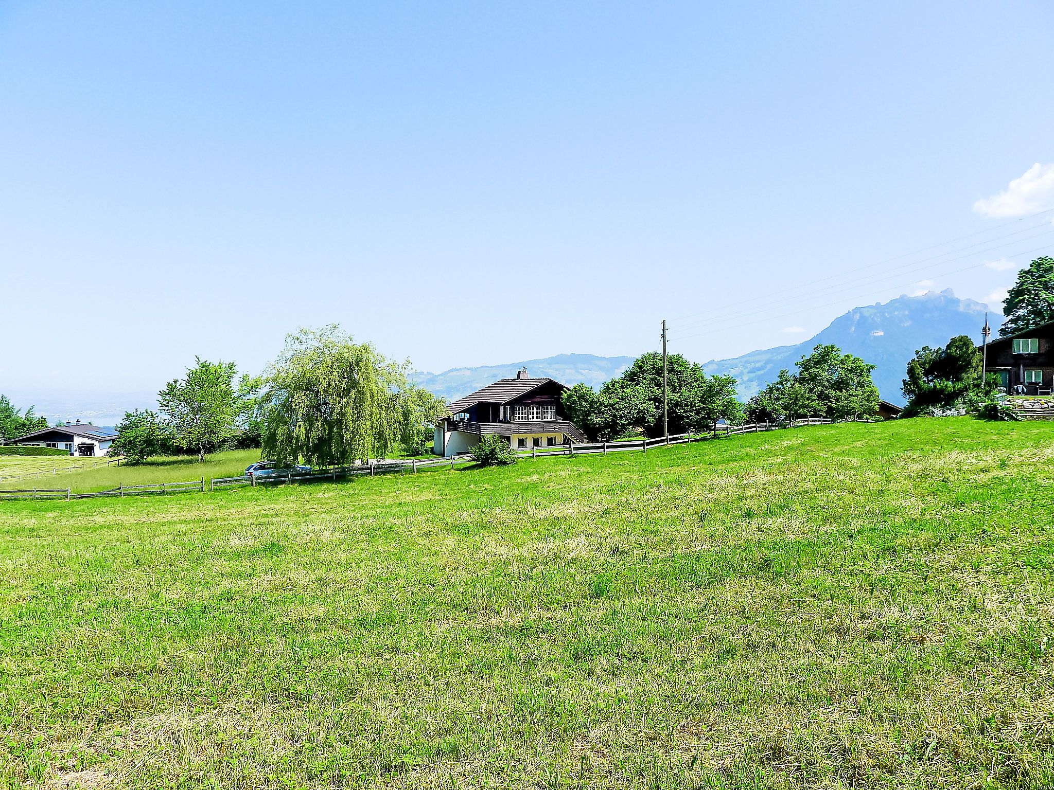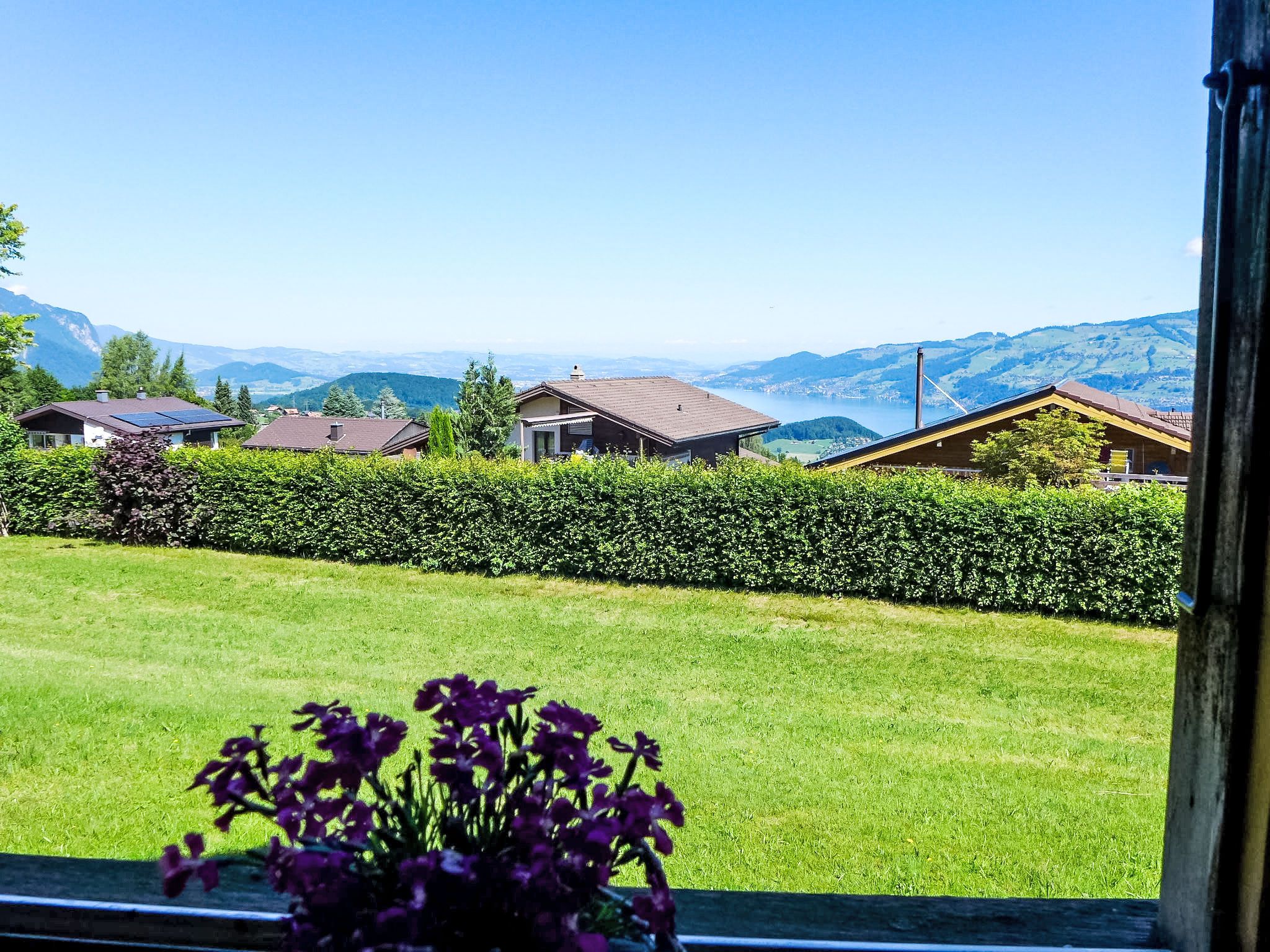 4-Zimmer-Haus 120 m2 auf 2 Stockwerken. Geräumig, rustikal und geschmackvoll eingerichtet: Wohn-/Esszimmer mit Panoramafenster mit Essecke, Sat-TV, Flachbildschirm, Radio, CD und Kachelofen. Ausgang zur Terrasse. Küche (Backofen, Geschirrspüler, 4 Glaskeramikplatten, Toaster, Wasserkocher, Mikrowelle, Tiefkühler, elektrische Kaffeemaschine) mit Durchreiche. Unteres Geschoss: 1 kleines Zimmer mit 1 Bett (90 cm, Länge 200 cm). Dusche/WC. Obergeschoss: 1 Zimmer mit 2 Betten (90 cm, Länge 200 cm). 1 kleines Zimmer mit 1 x 2 Etagenbetten (90 cm, Länge 200 cm). Bad/WC. E-Heizung. Grosse Terrasse, Südwestlage. Terrassenmöbel, Gartengrill, Liegestühle (3). Herrliche Panoramasicht auf den See, die Berge und die Landschaft. Zur Verfügung: Waschmaschine, Wäschetrockner. Internet (Wireless LAN, gratis). Parkplatz (2 Autos). Bitte beachten: geeignet für Familien. Rauchmelder, Feuerlöscher.