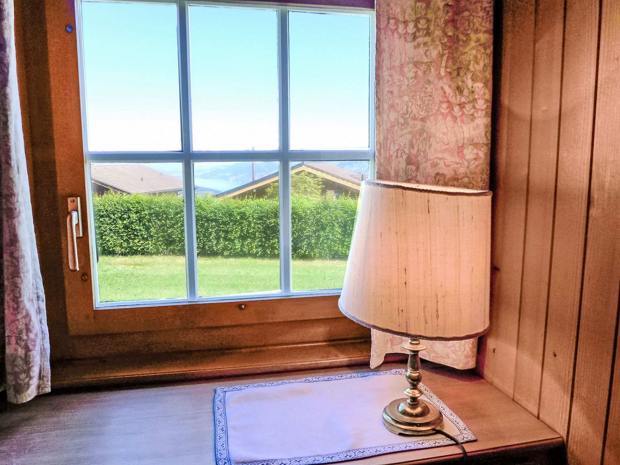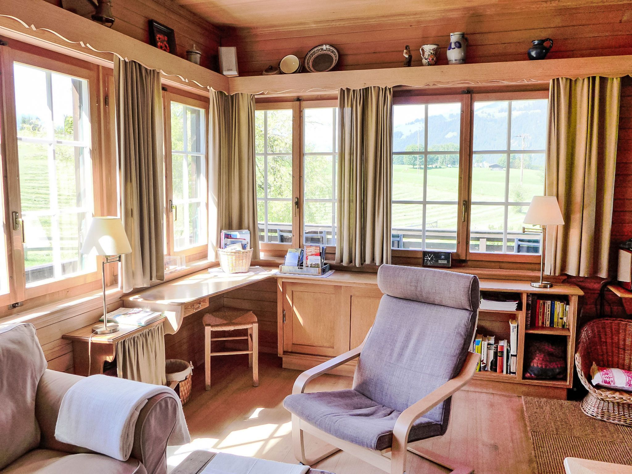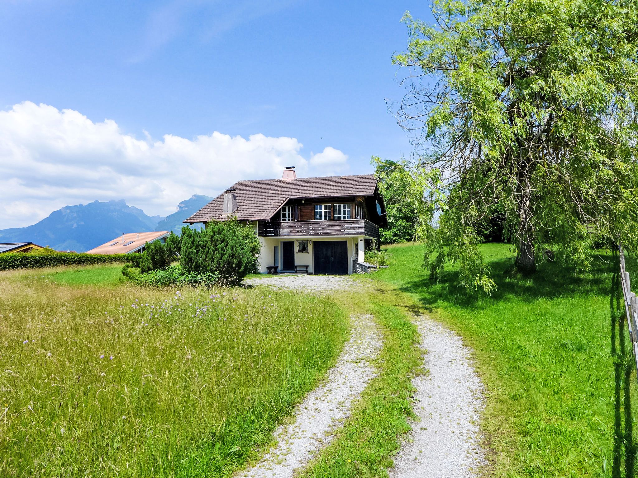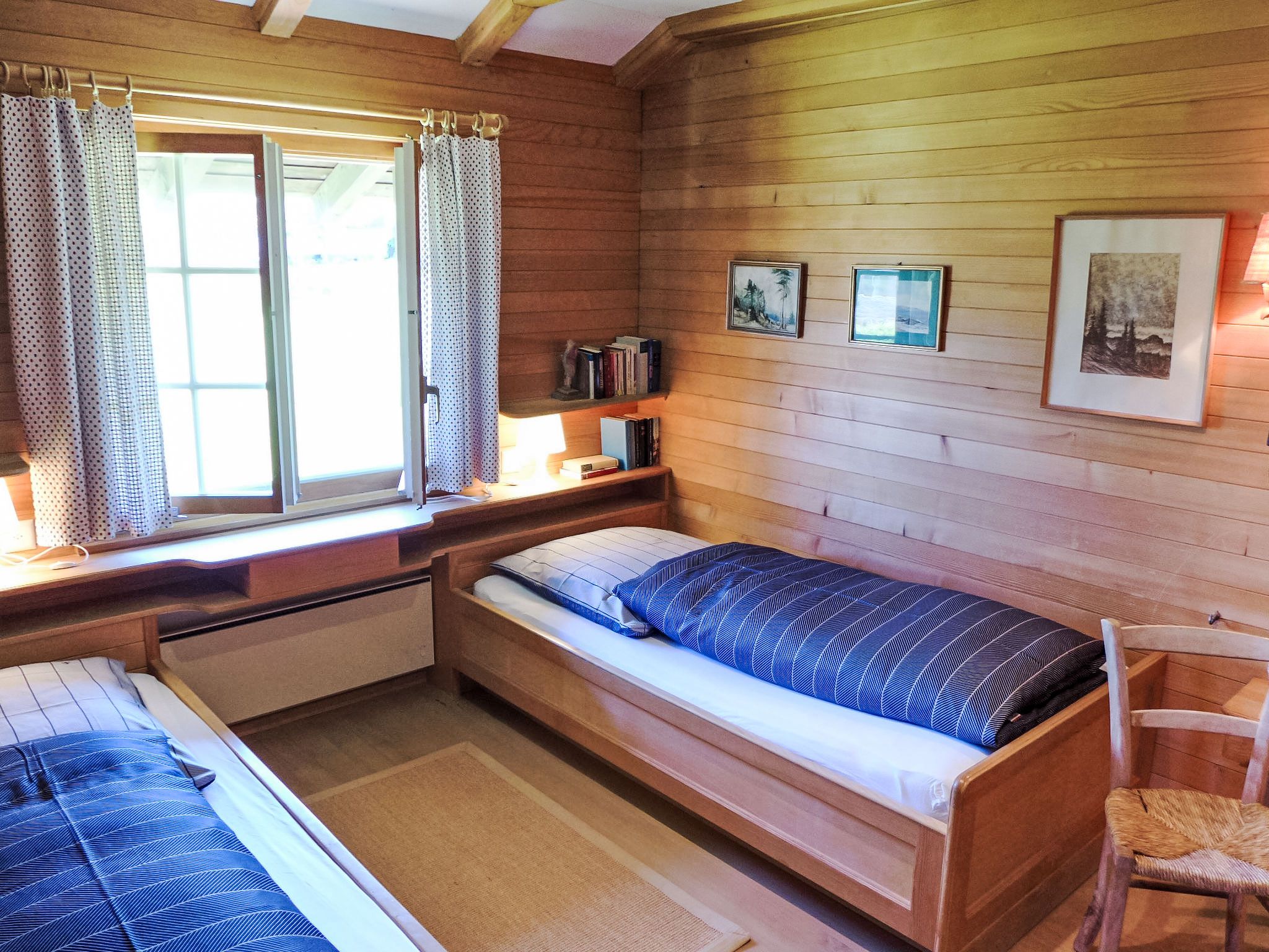 4-Zimmer-Haus 120 m2 auf 2 Stockwerken. Geräumig, rustikal und geschmackvoll eingerichtet: Wohn-/Esszimmer mit Panoramafenster mit Essecke, Sat-TV, Flachbildschirm, Radio, CD und Kachelofen. Ausgang zur Terrasse. Küche (Backofen, Geschirrspüler, 4 Glaskeramikplatten, Toaster, Wasserkocher, Mikrowelle, Tiefkühler, elektrische Kaffeemaschine) mit Durchreiche. Unteres Geschoss: 1 kleines Zimmer mit 1 Bett (90 cm, Länge 200 cm). Dusche/WC. Obergeschoss: 1 Zimmer mit 2 Betten (90 cm, Länge 200 cm). 1 kleines Zimmer mit 1 x 2 Etagenbetten (90 cm, Länge 200 cm). Bad/WC. E-Heizung. Grosse Terrasse, Südwestlage. Terrassenmöbel, Gartengrill, Liegestühle (3). Herrliche Panoramasicht auf den See, die Berge und die Landschaft. Zur Verfügung: Waschmaschine, Wäschetrockner. Internet (Wireless LAN, gratis). Parkplatz (2 Autos). Bitte beachten: geeignet für Familien. Rauchmelder, Feuerlöscher.