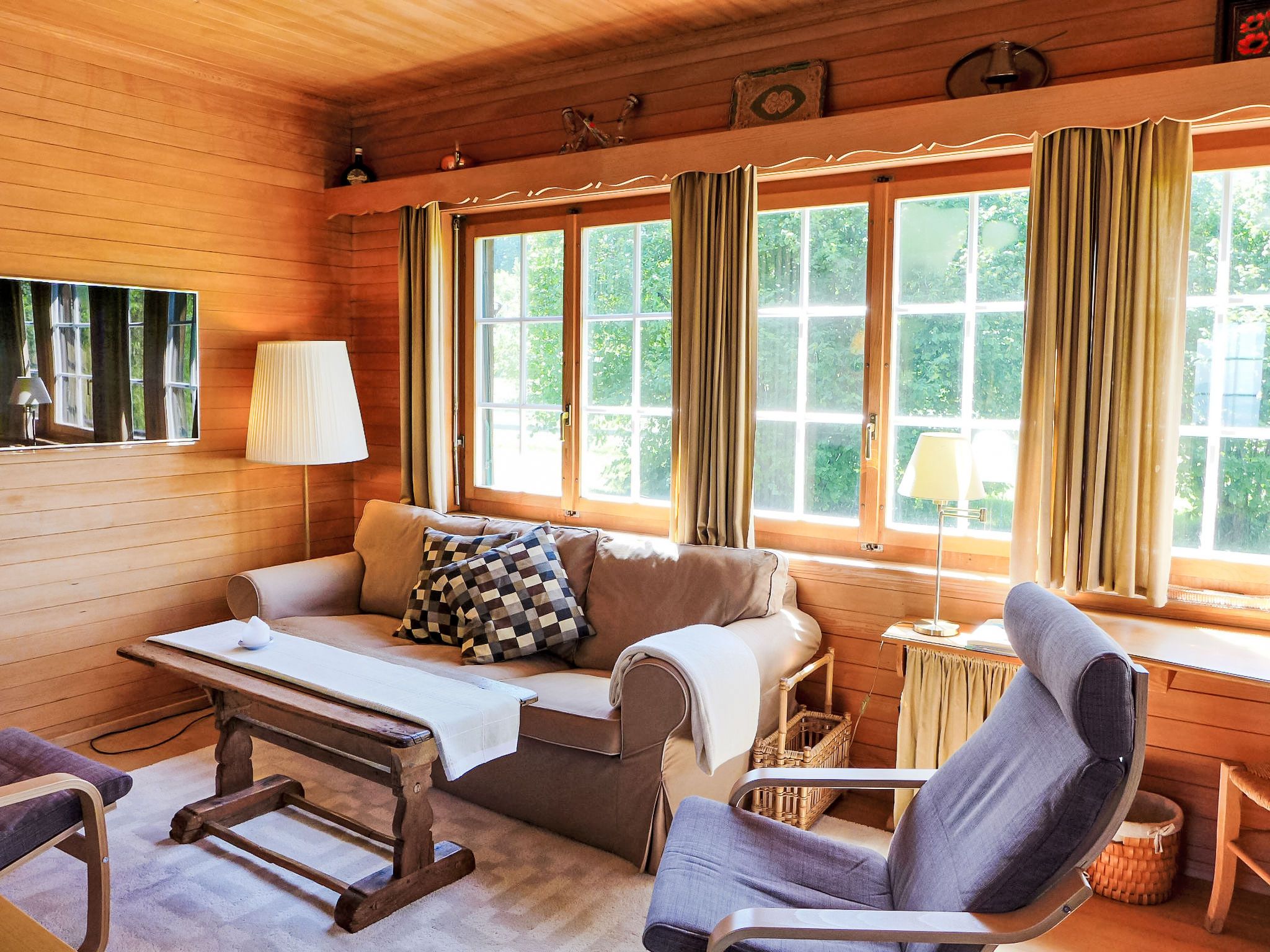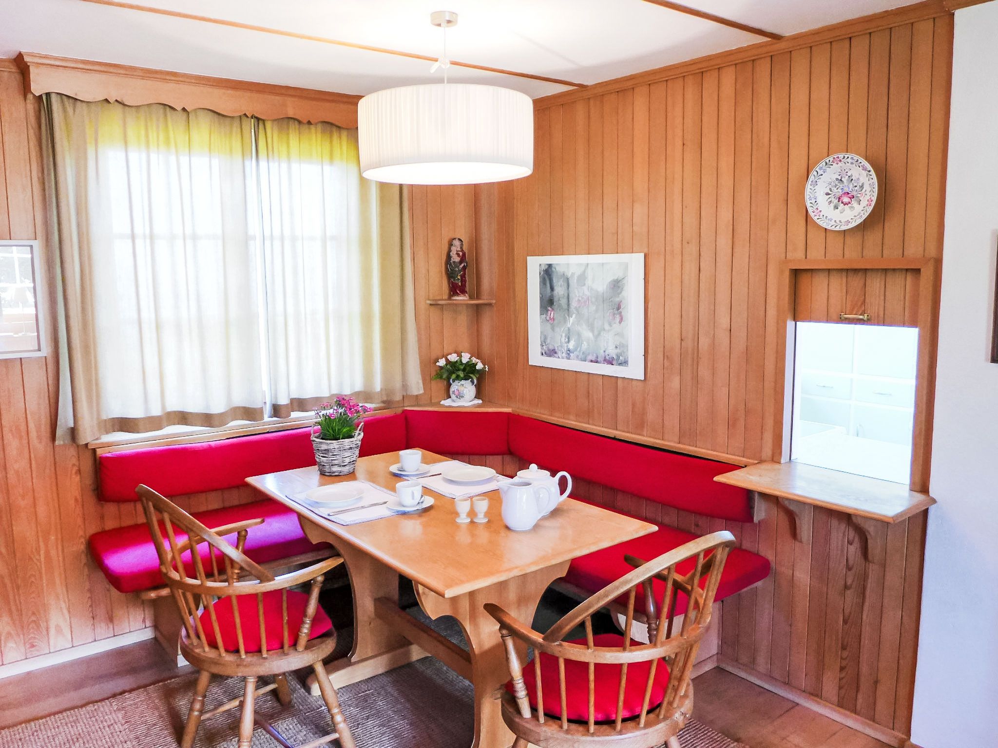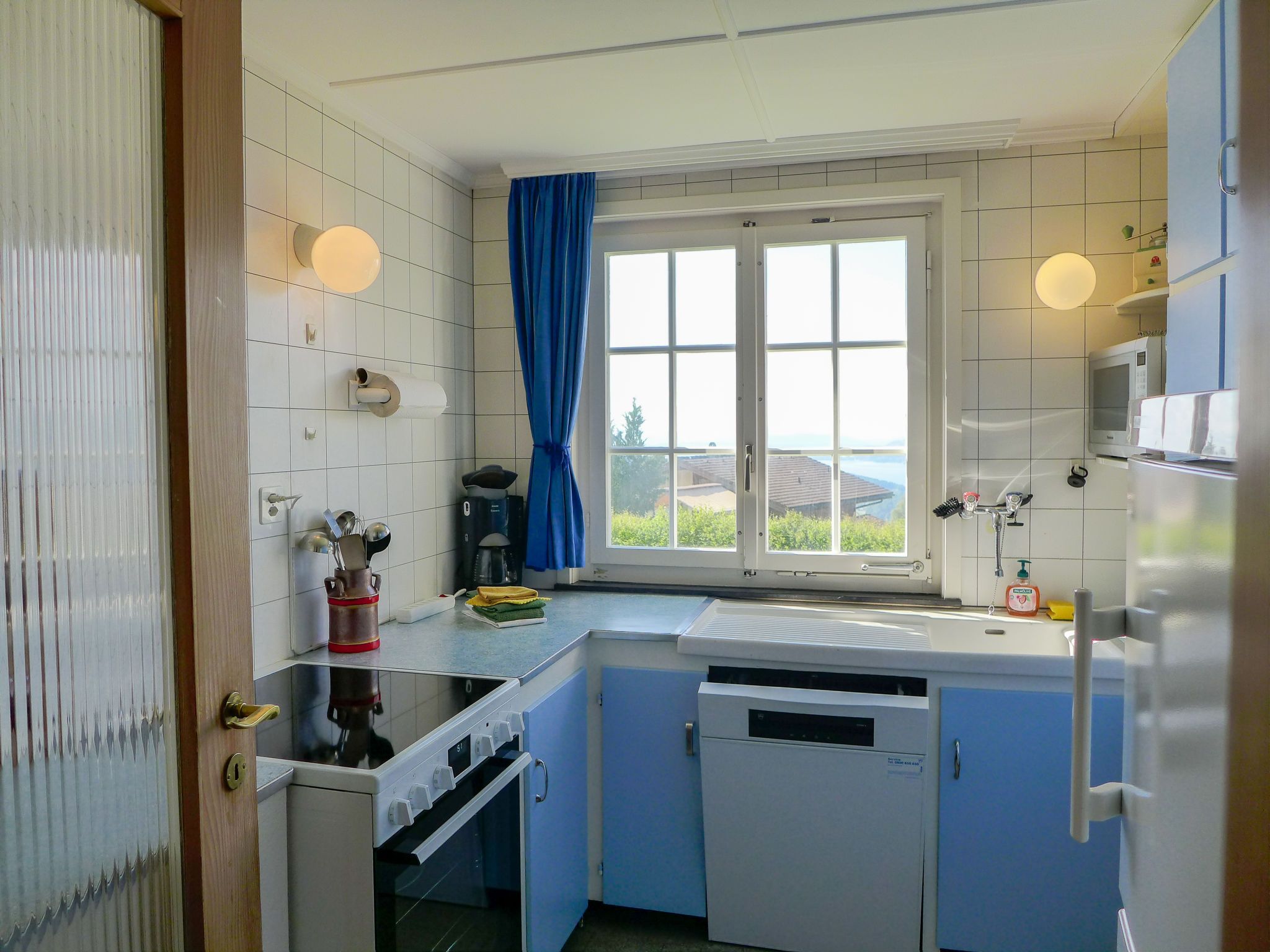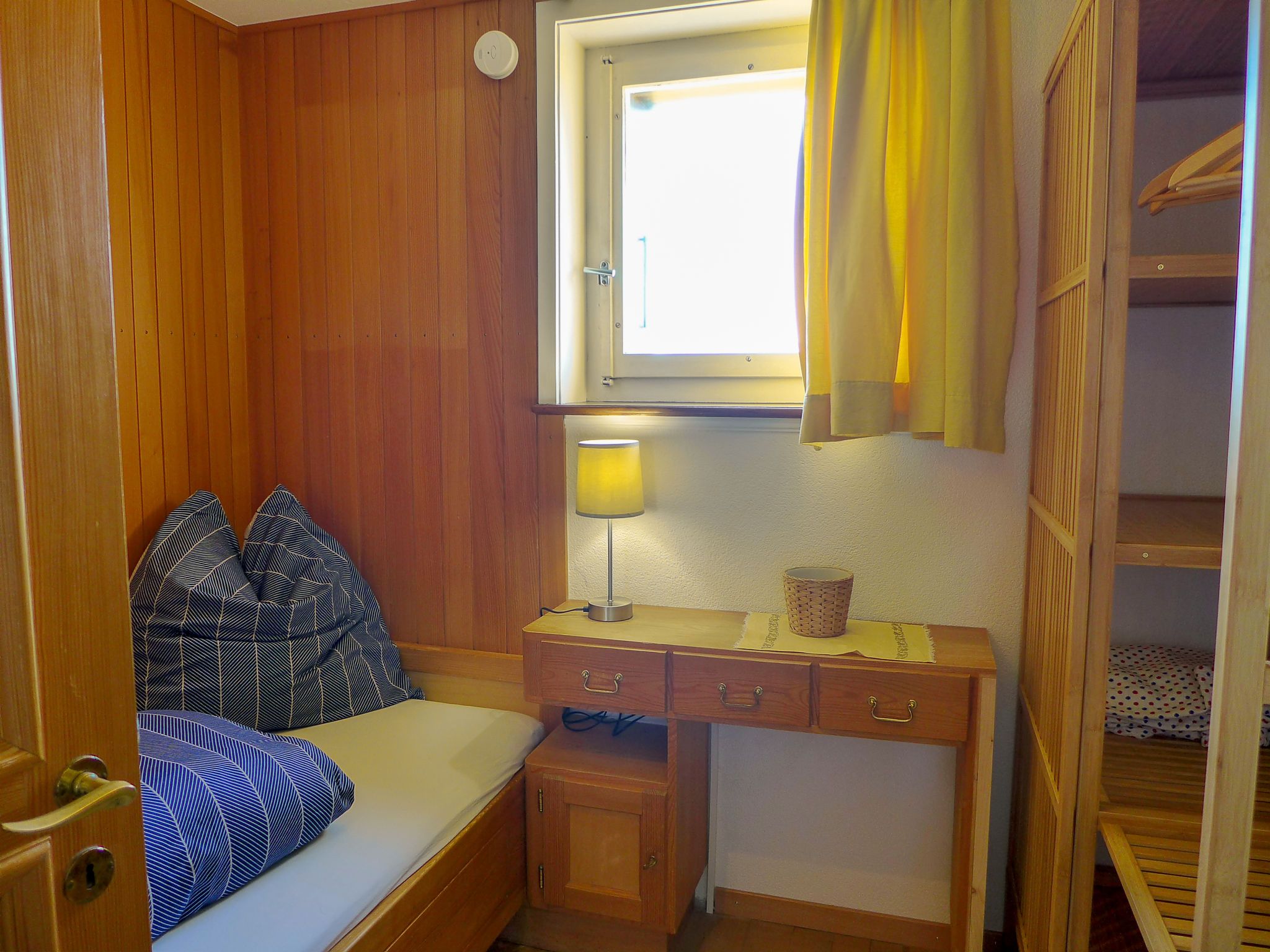 4-Zimmer-Haus 120 m2 auf 2 Stockwerken. Geräumig, rustikal und geschmackvoll eingerichtet: Wohn-/Esszimmer mit Panoramafenster mit Essecke, Sat-TV, Flachbildschirm, Radio, CD und Kachelofen. Ausgang zur Terrasse. Küche (Backofen, Geschirrspüler, 4 Glaskeramikplatten, Toaster, Wasserkocher, Mikrowelle, Tiefkühler, elektrische Kaffeemaschine) mit Durchreiche. Unteres Geschoss: 1 kleines Zimmer mit 1 Bett (90 cm, Länge 200 cm). Dusche/WC. Obergeschoss: 1 Zimmer mit 2 Betten (90 cm, Länge 200 cm). 1 kleines Zimmer mit 1 x 2 Etagenbetten (90 cm, Länge 200 cm). Bad/WC. E-Heizung. Grosse Terrasse, Südwestlage. Terrassenmöbel, Gartengrill, Liegestühle (3). Herrliche Panoramasicht auf den See, die Berge und die Landschaft. Zur Verfügung: Waschmaschine, Wäschetrockner. Internet (Wireless LAN, gratis). Parkplatz (2 Autos). Bitte beachten: geeignet für Familien. Rauchmelder, Feuerlöscher.