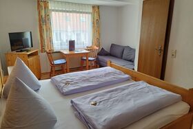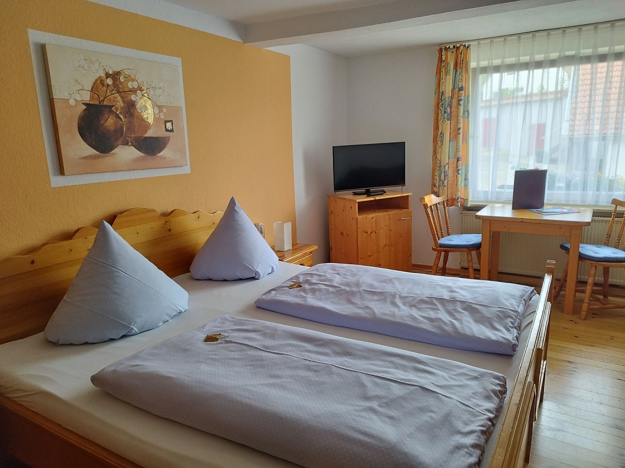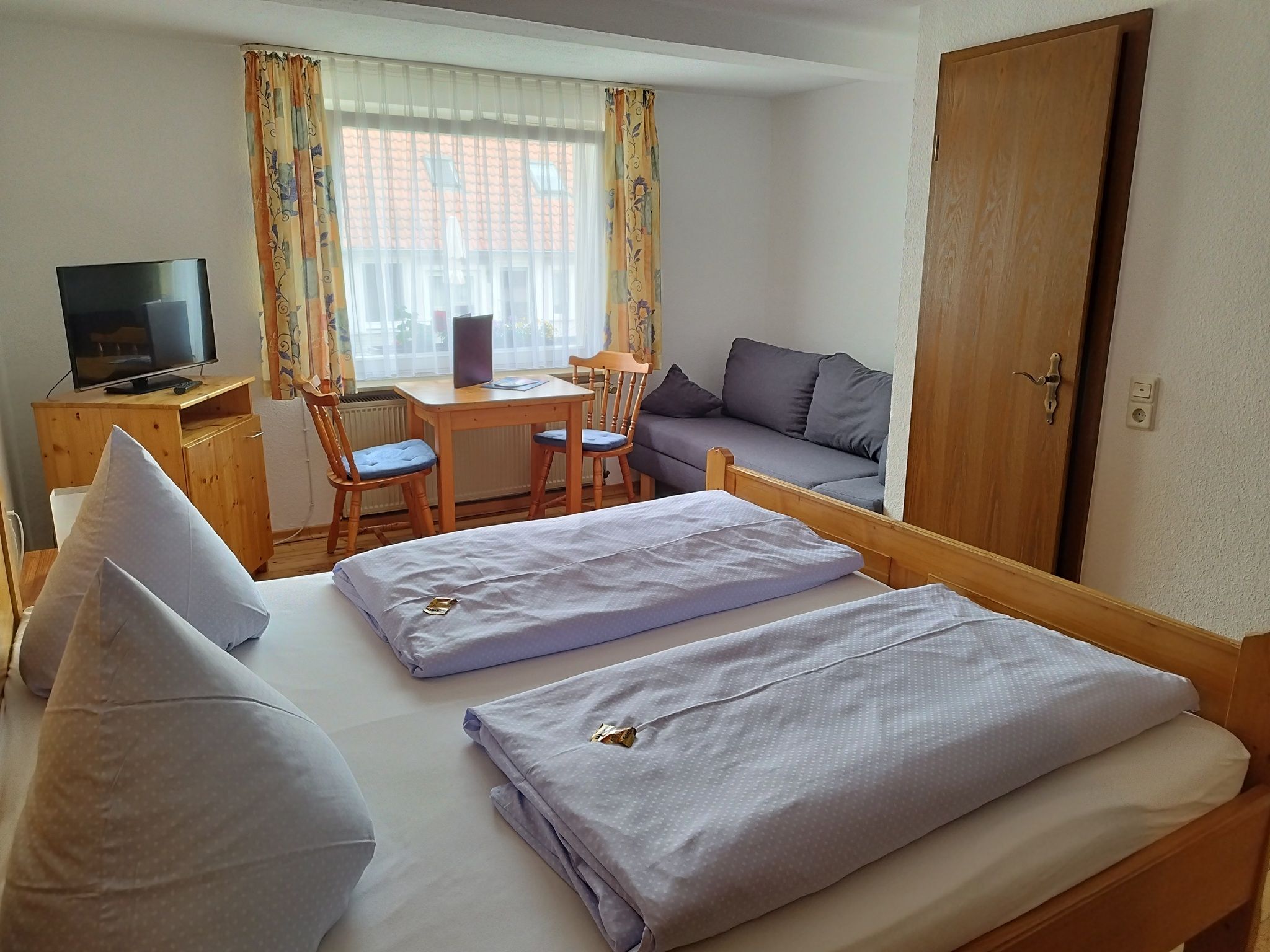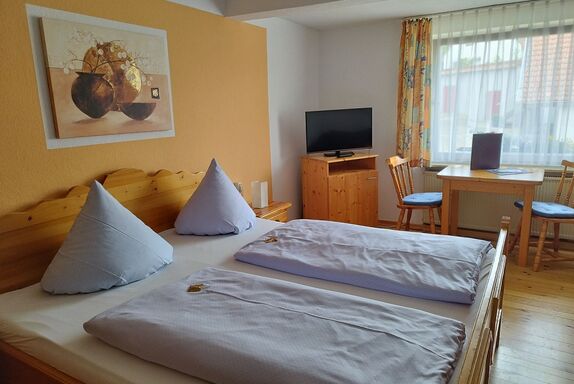 Das gemütlich eingerichtete Zimmer befindet sich in der ersten Etage mit Flachbildfernseher und Kühlschrank.
