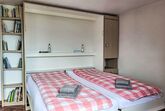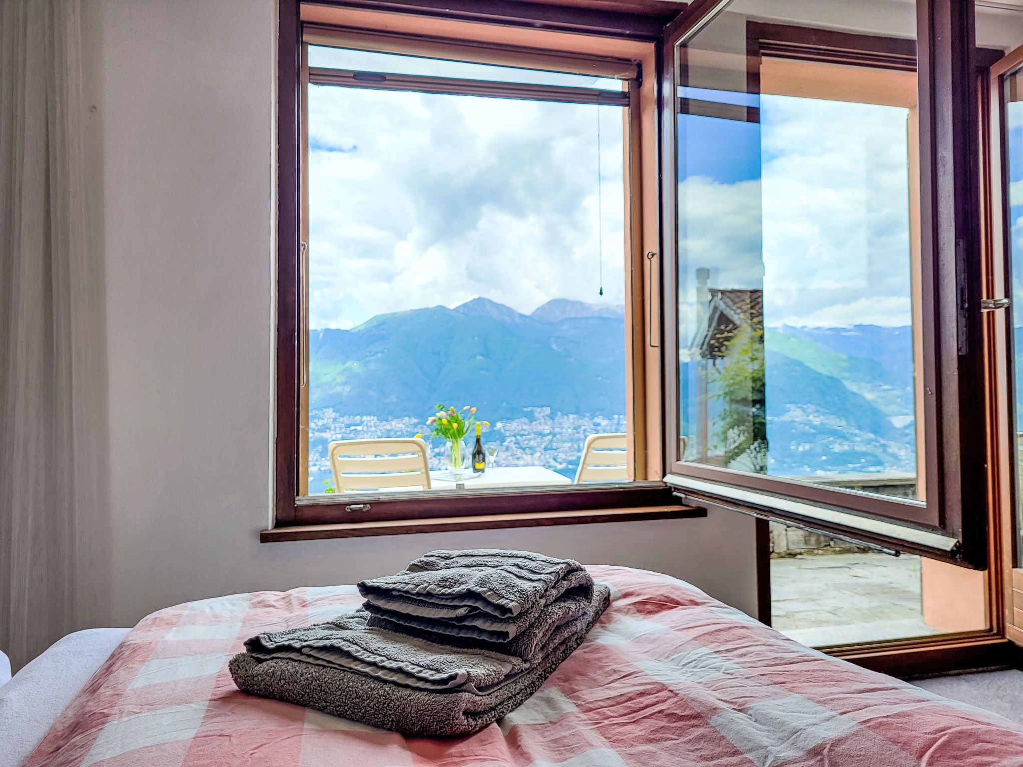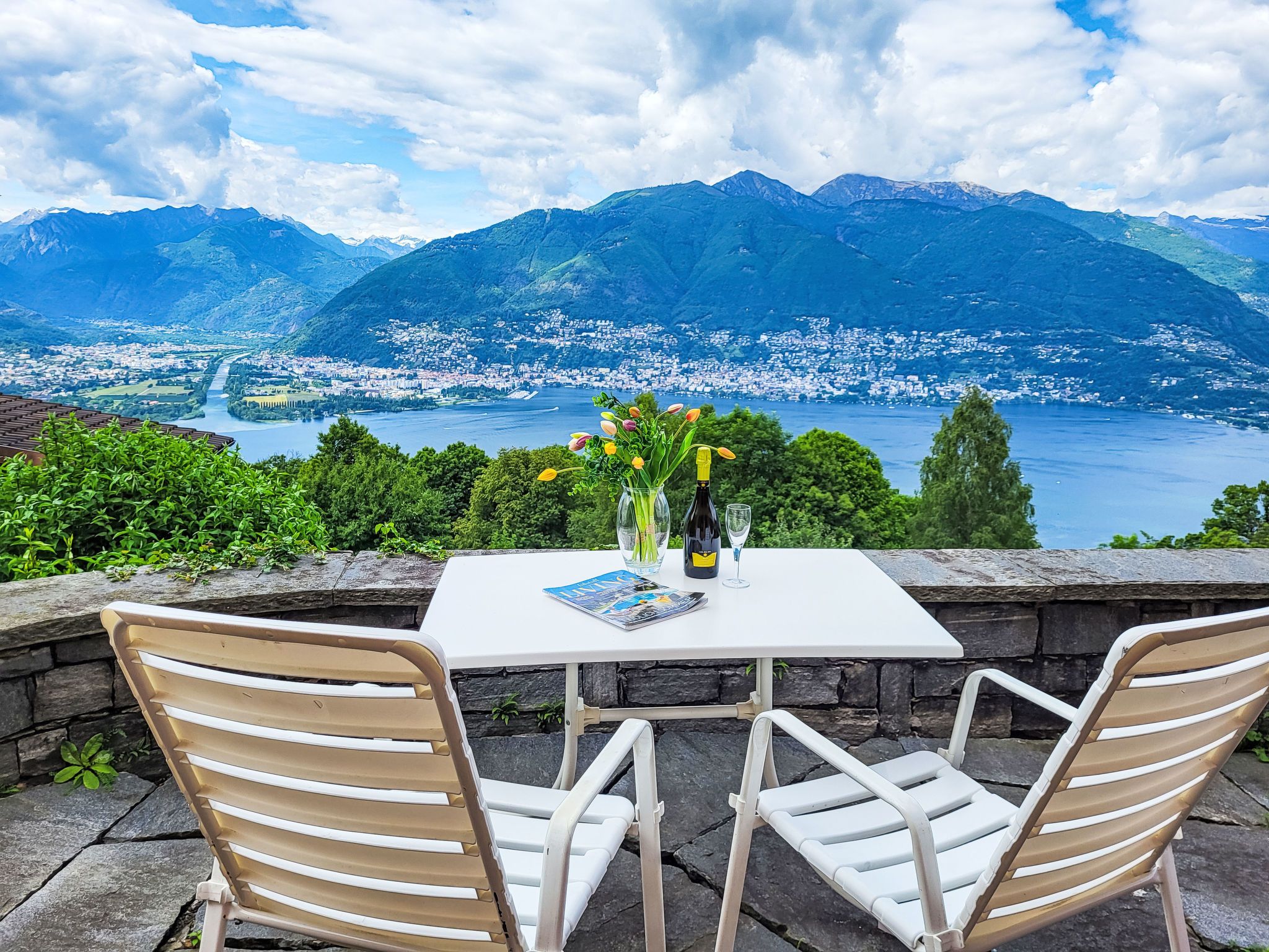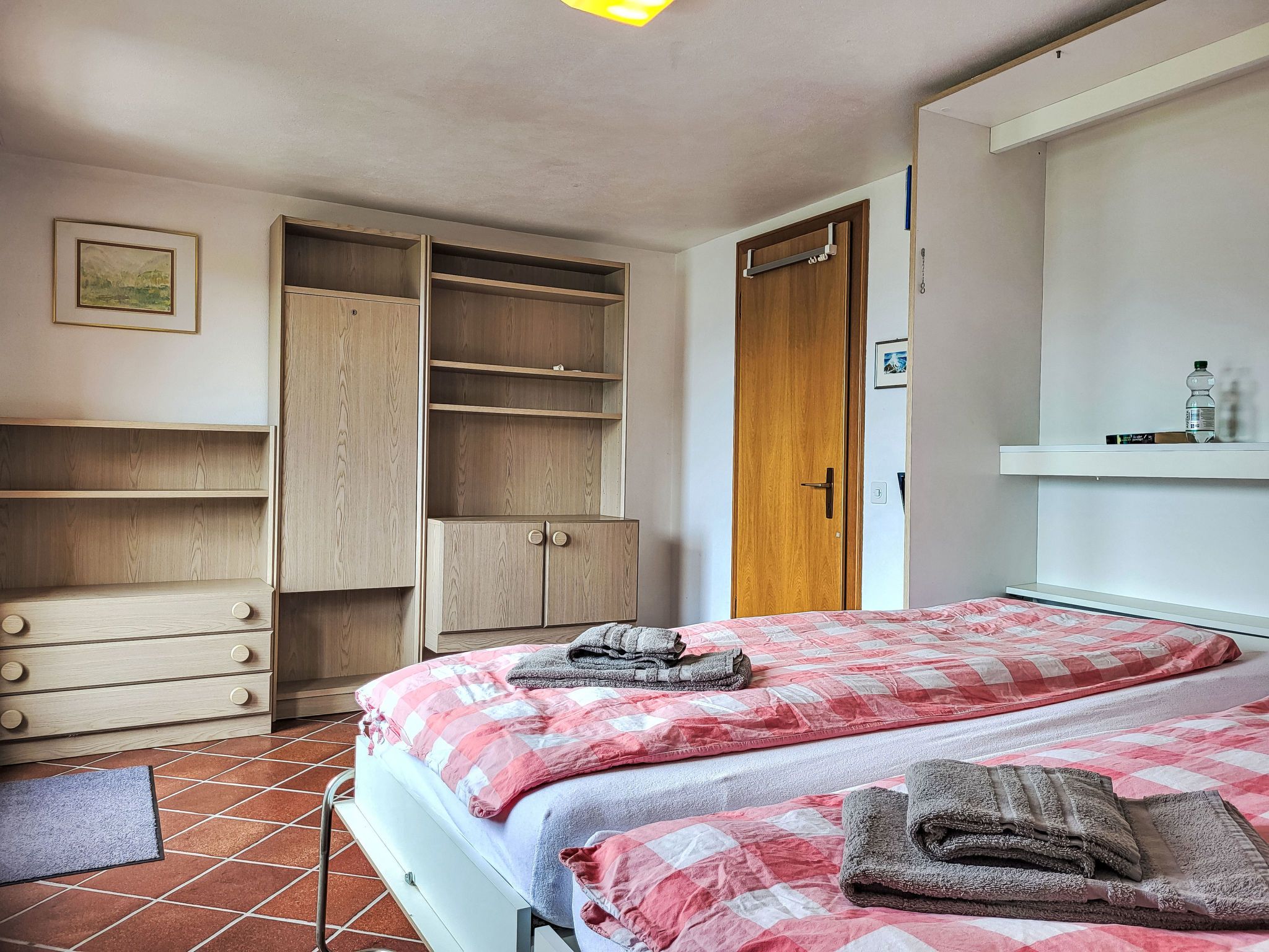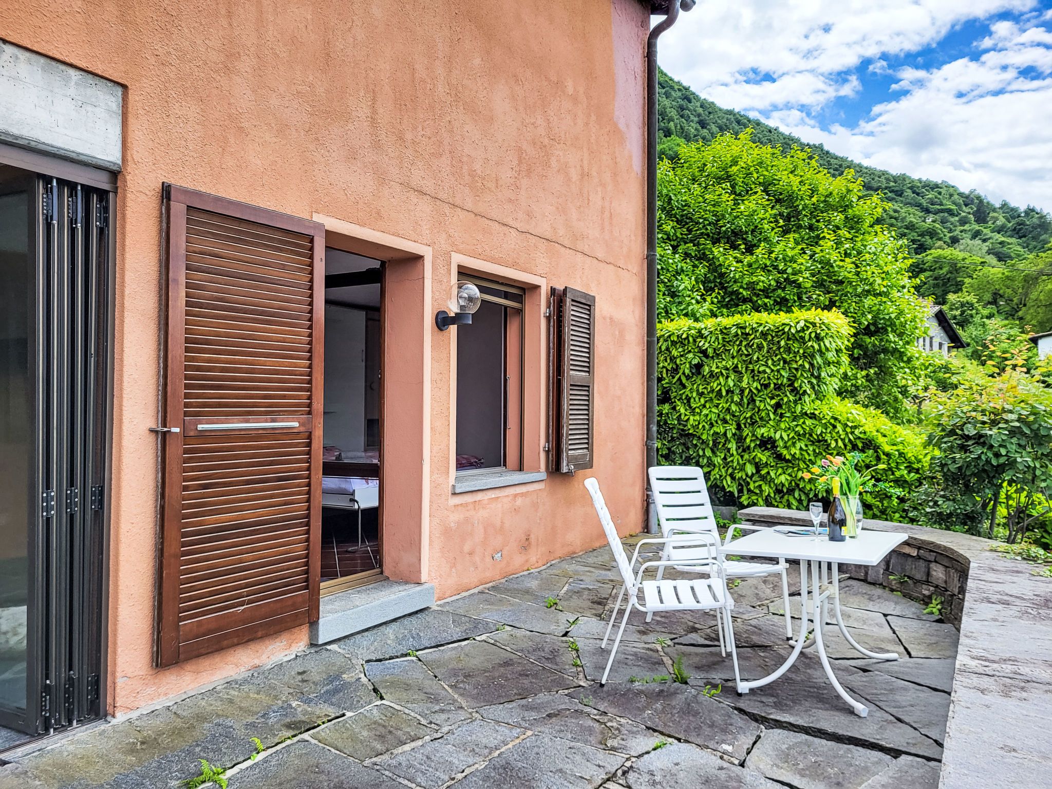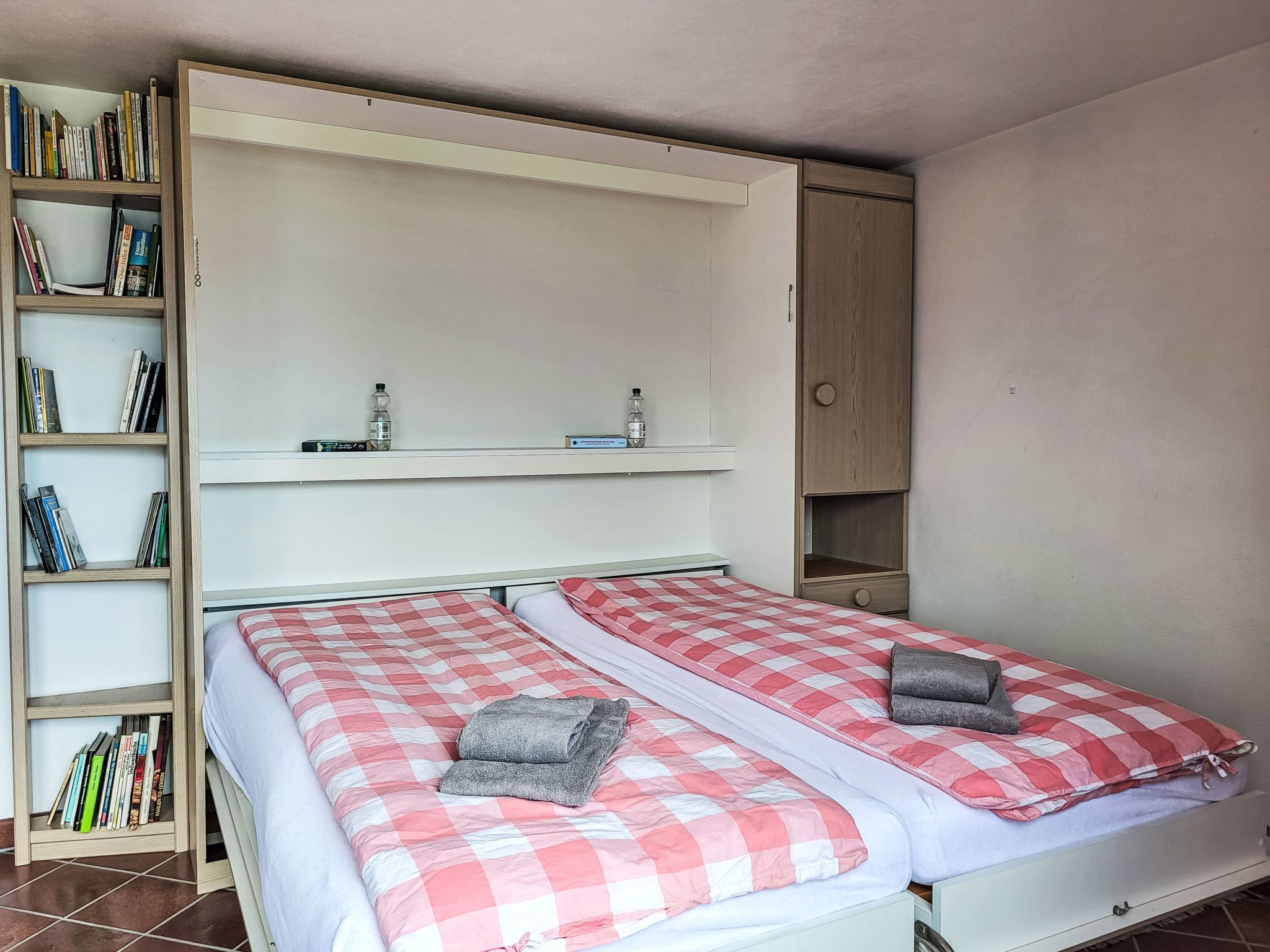 Studio Indèman, 2-Zimmer-Studio 35 m2. Objekt geeignet für 2 Erwachsene. Einfach und zweckmässig eingerichtet: 1 Doppelzimmer mit 2 Wandschrankbetten (90 cm, Länge 200 cm), Radio. Ausgang zur Terrasse. Kleine Küche (4 Kochplatten, Geschirrspüler, Toaster, elektrische Kaffeemaschine, Kapseln für die Kaffeemaschine (Delizio) extra). Dusche/WC. Ölheizung. Natursteinboden. Grosse Terrasse 25 m2, grosser Gartensitzplatz, grosser Garten. Terrassenmöbel, Balkonmöbel, Wintergarten. Herrliche Panoramasicht auf den See, die Berge, die Landschaft und die Ortschaft. Bitte beachten: Nichtraucher-Unterkunft. Maximal 1 Haustier/Hund erlaubt. NL-