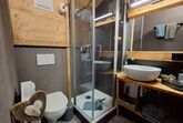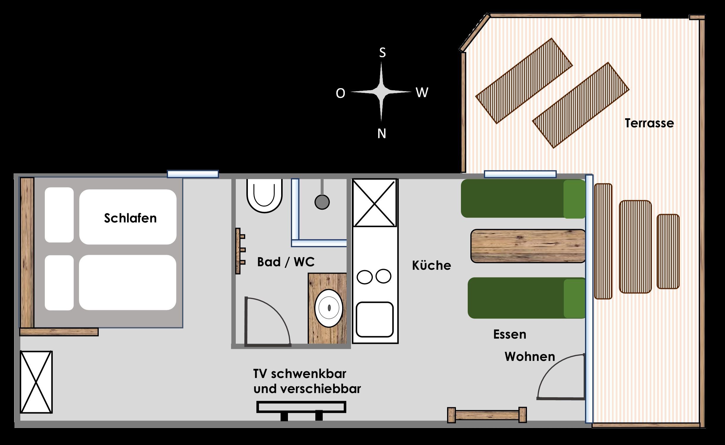 In diesem Chalet befinden sich Wohnküche und Schlafen in einem Raum, sowie ein kleines Bad. Dieses Chalet ist mit Zentralheizung ausgestattet.