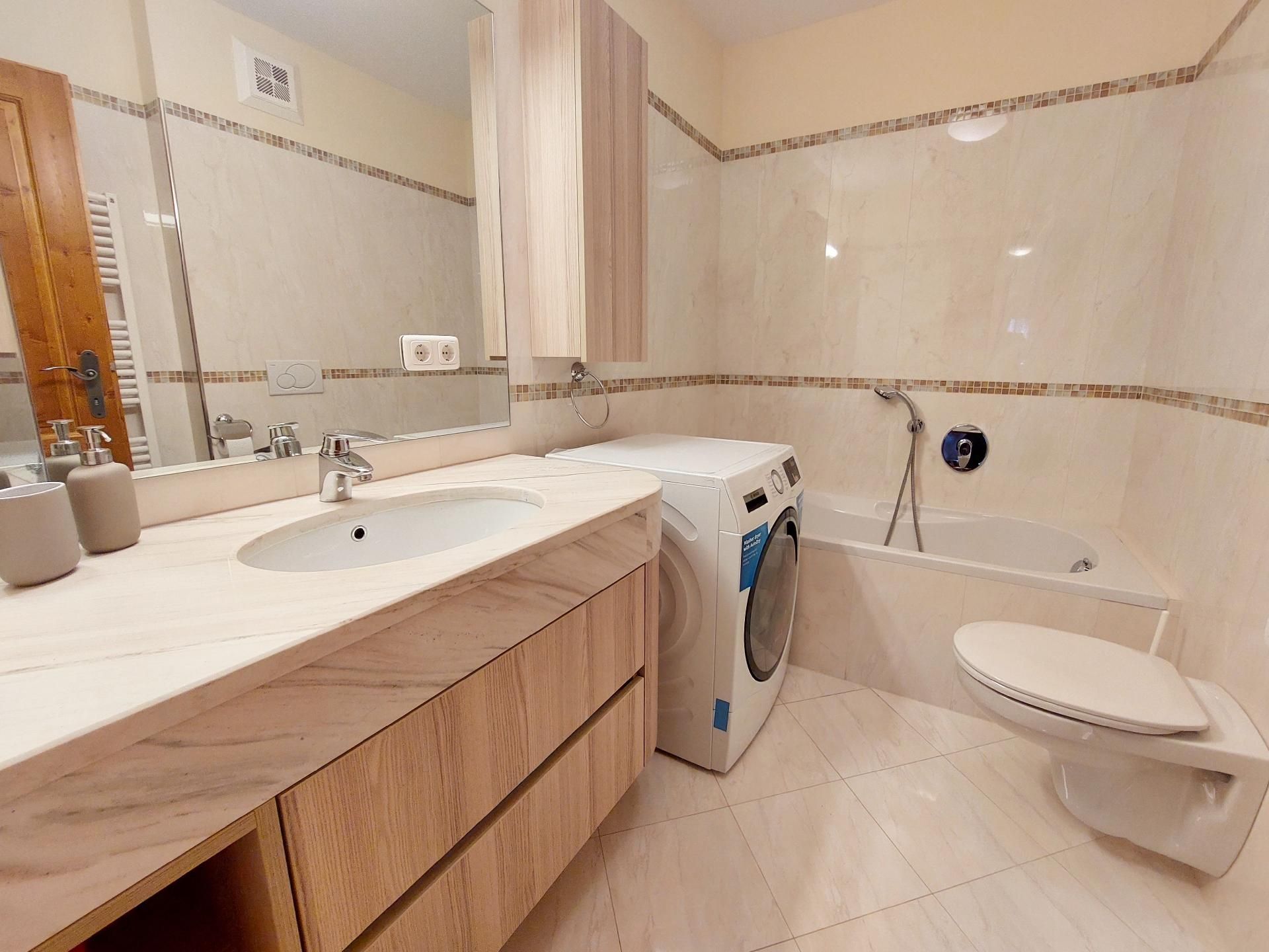 Im Inneren der Wohnung finden Sie zwei Schlafzimmer und zwei Badezimmer vor, eines ausgestattet mit einer Dusche und das andere mit einer Badewanne, was ausreichend Privatsphäre und Komfort für alle Gäste gewährleistet. Eine Fußbodenheizung verbreitet an kälteren Tagen eine angenehme Wärme in der gesamten Wohnung. Die praktische Ausstattung umfasst zudem eine eigene Waschmaschine, eine voll ausgerüstete Küche mit Cerankochfeld, einer Filter-Kaffeemaschine, einem Wasserkocher und einer Spülmaschine, die die Selbstversorgung zum Genuss werden lässt.