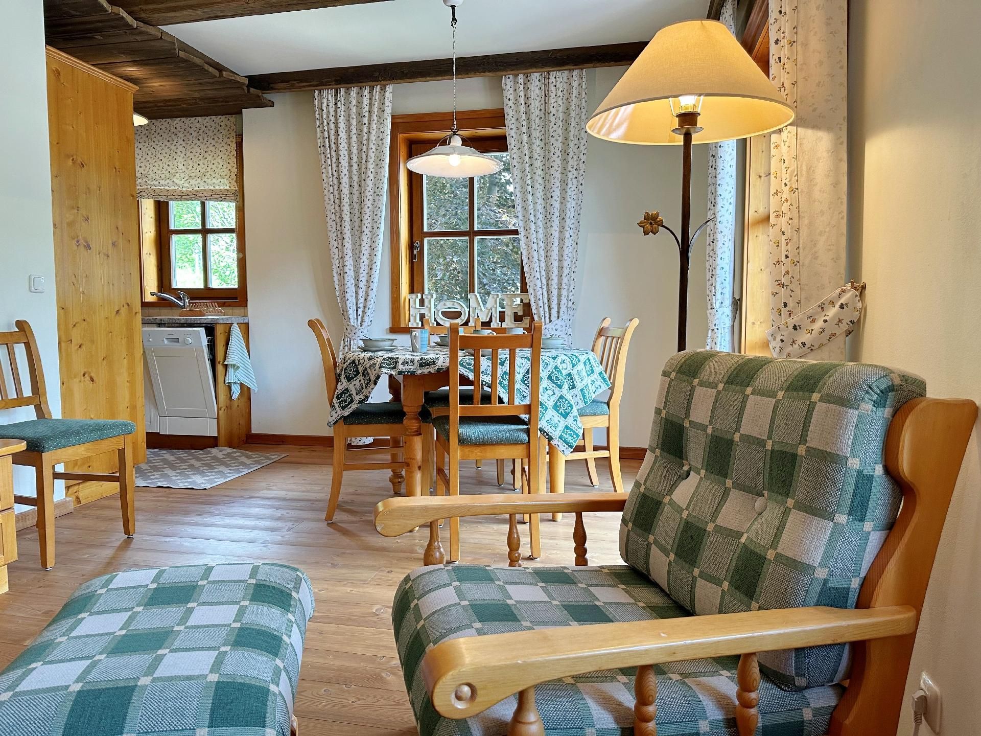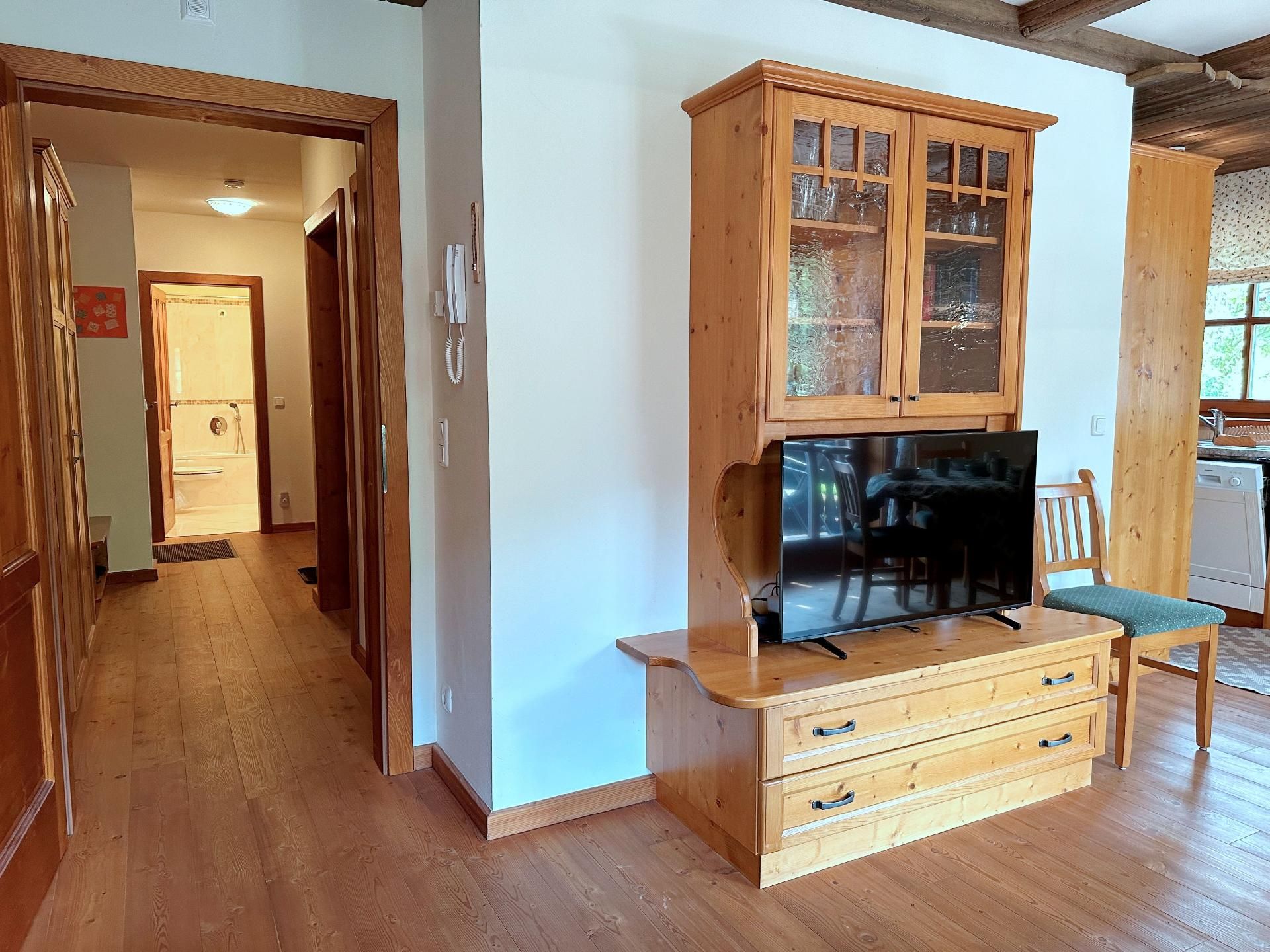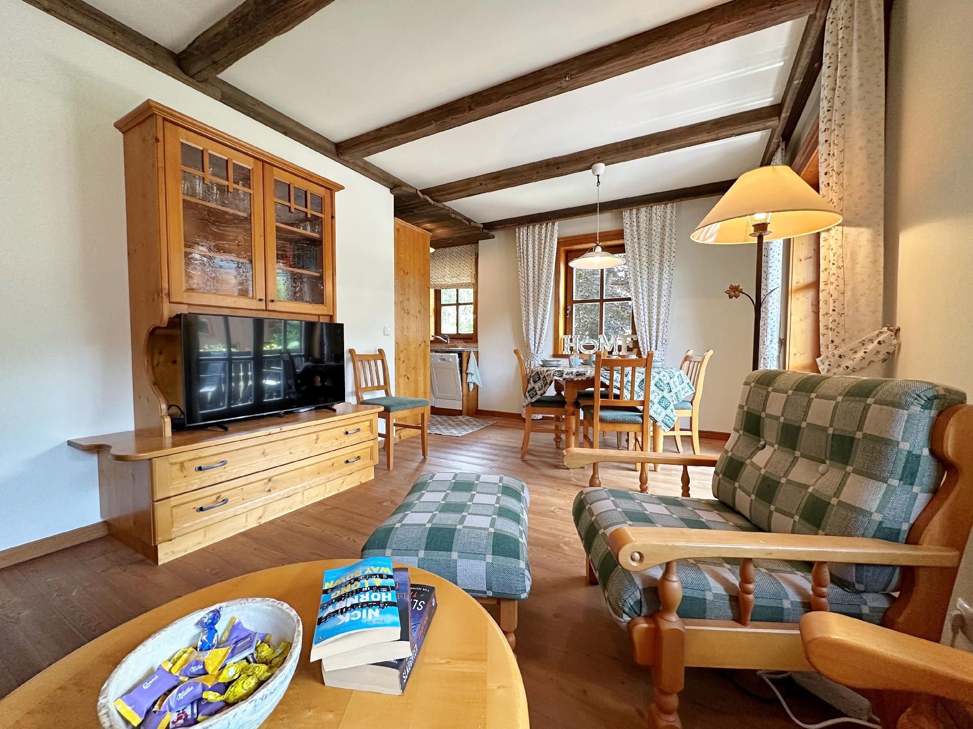 Die Wohnung ist mit zwei Schlafzimmern und zwei Badezimmern ausgestattet, was ausreichend Komfort und Privatsphäre für alle Gäste während ihres Aufenthaltes garantiert. Die Fußbodenheizung in sämtlichen Räumen sorgt zudem für eine angenehme Wärme nach einem erlebnisreichen Tag in der Winterlandschaft.