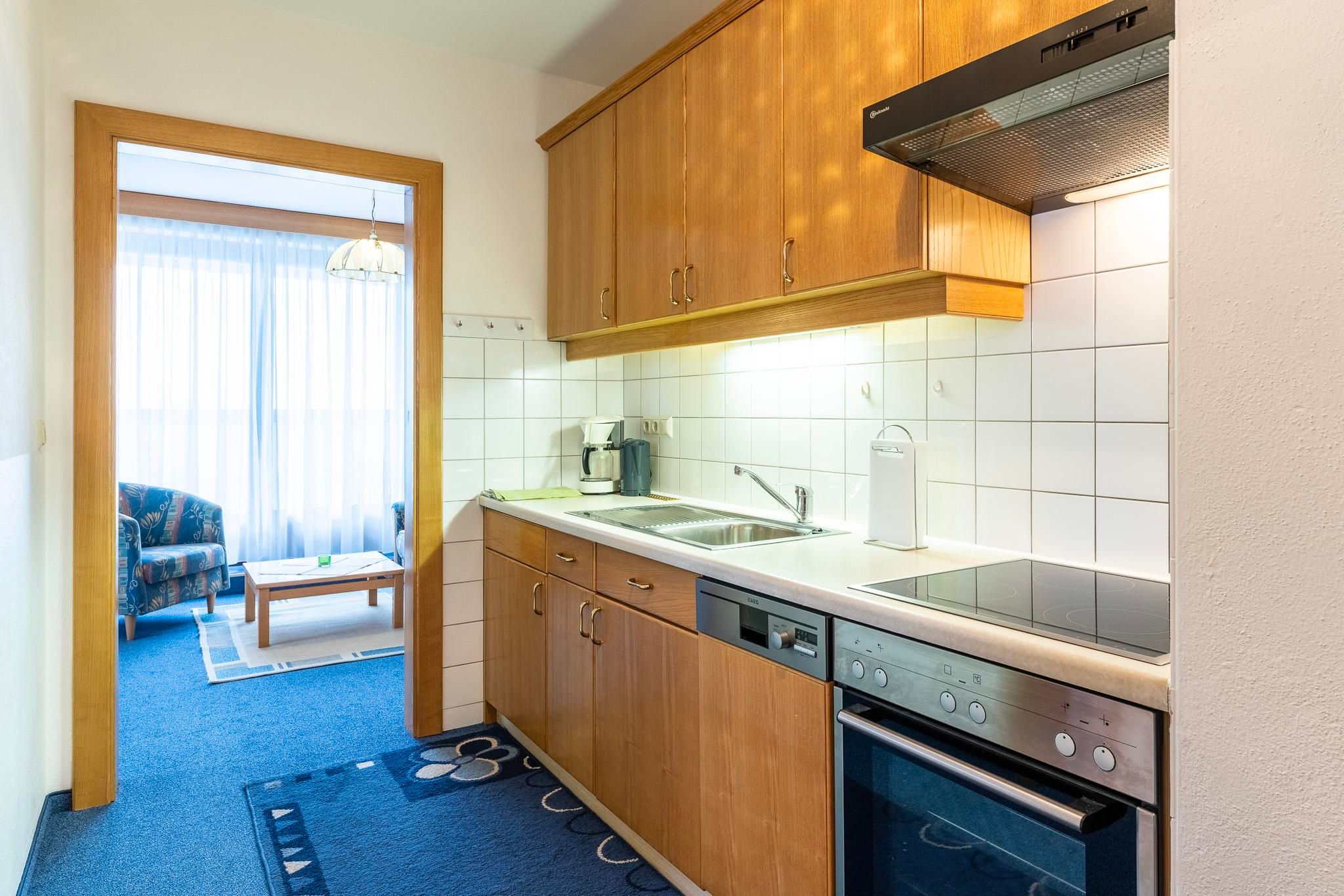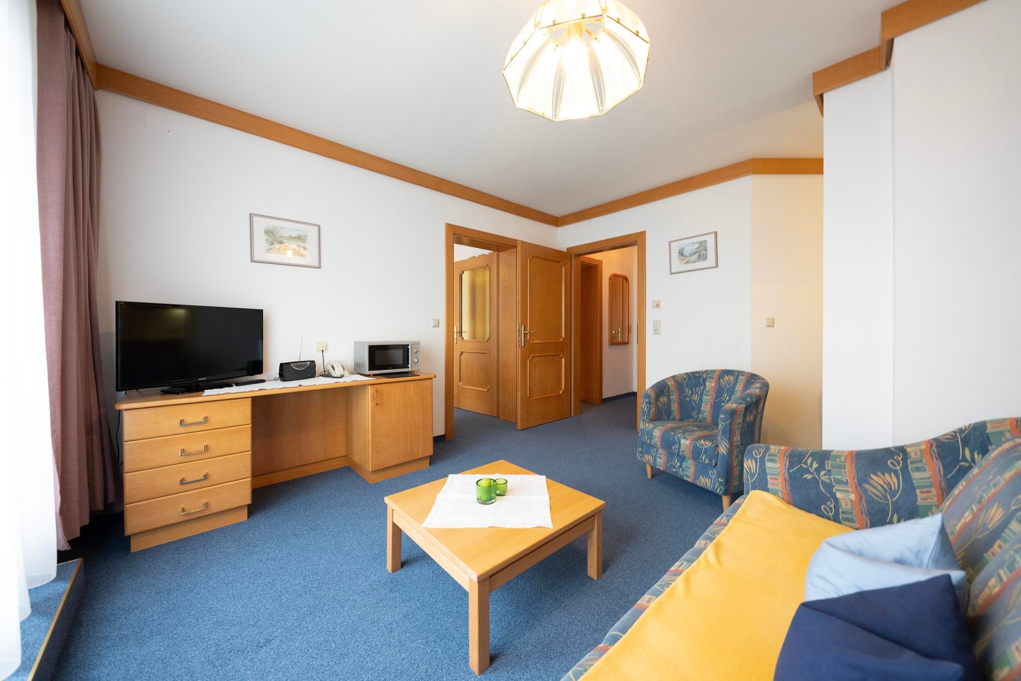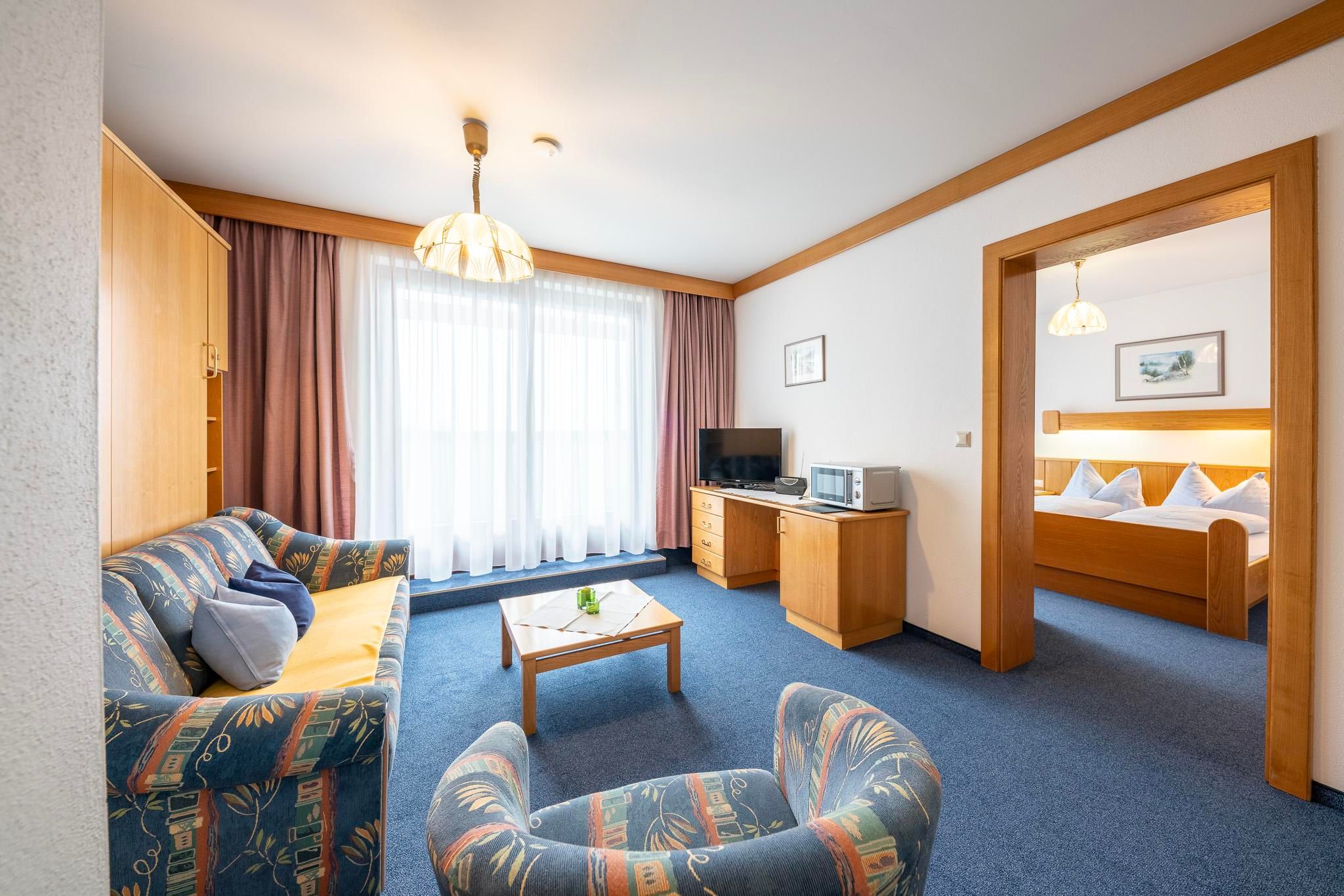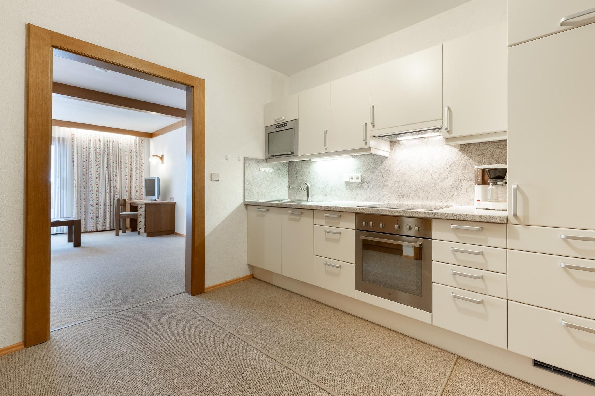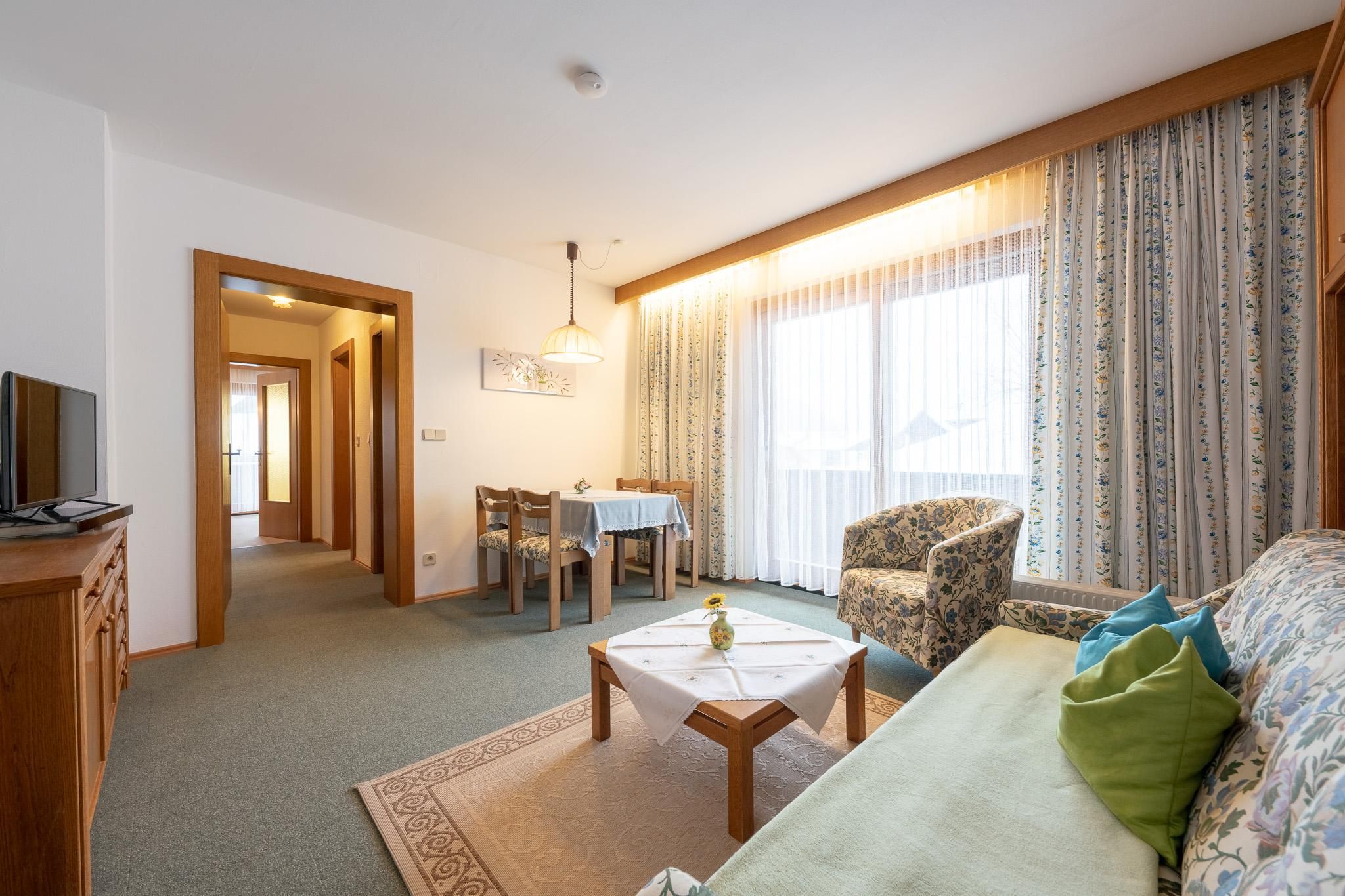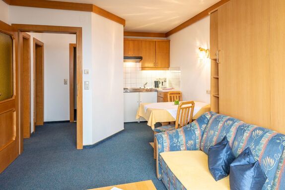 Appartement mit 46 m2, 1 Schlafzimmer, 1 Wohn-Schlafzimmer mit Essecke, kl. Küche mit 2 Plattenherd, Kühlschrank mit Gefrierfach, Töpfen und Essbesteck, SAT-TV, Radio, Telefon, Safe, Bad ( Eckbadewanne ), Doppelwaschtisch, Föhn, seperates WC, Vorraum und überdachter Südbalkon. W-Lan kostenlos.