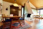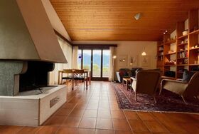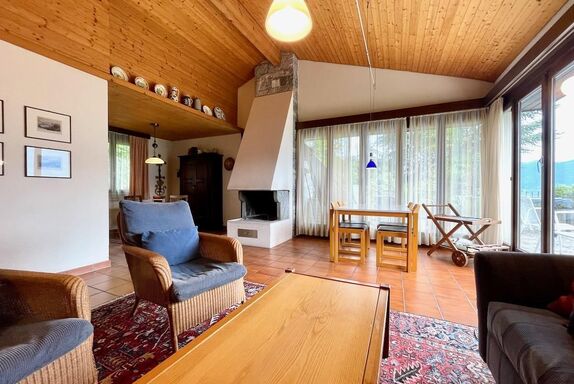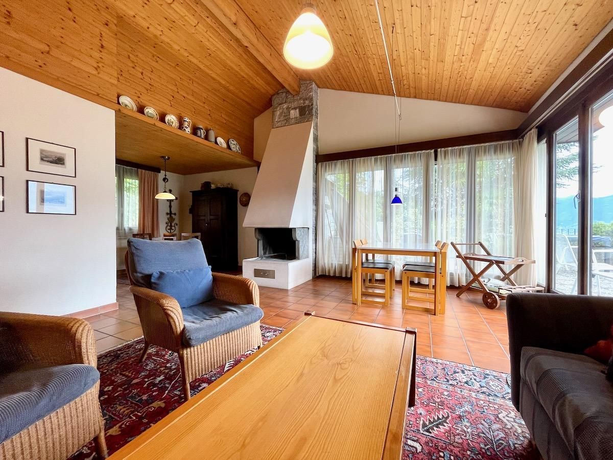 Die Wohnung verfügt über ein großes Wohn- Esszimmer mit offenem Kamin und Ausgang auf die Terrasse mit Blick auf den Lago Maggiore, Minusio, Ascona, Locarno, die Magadinoebene und nach Italien.