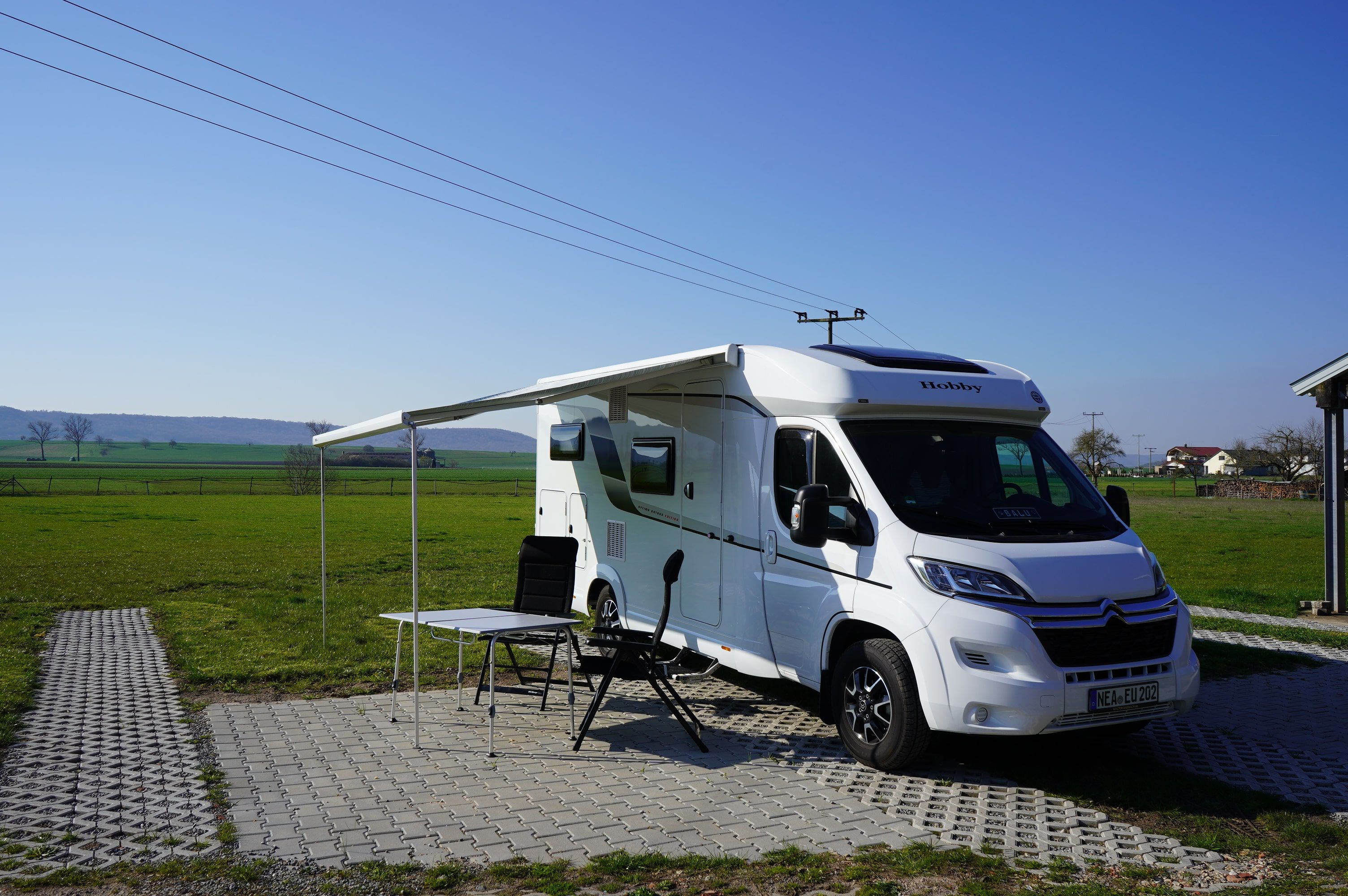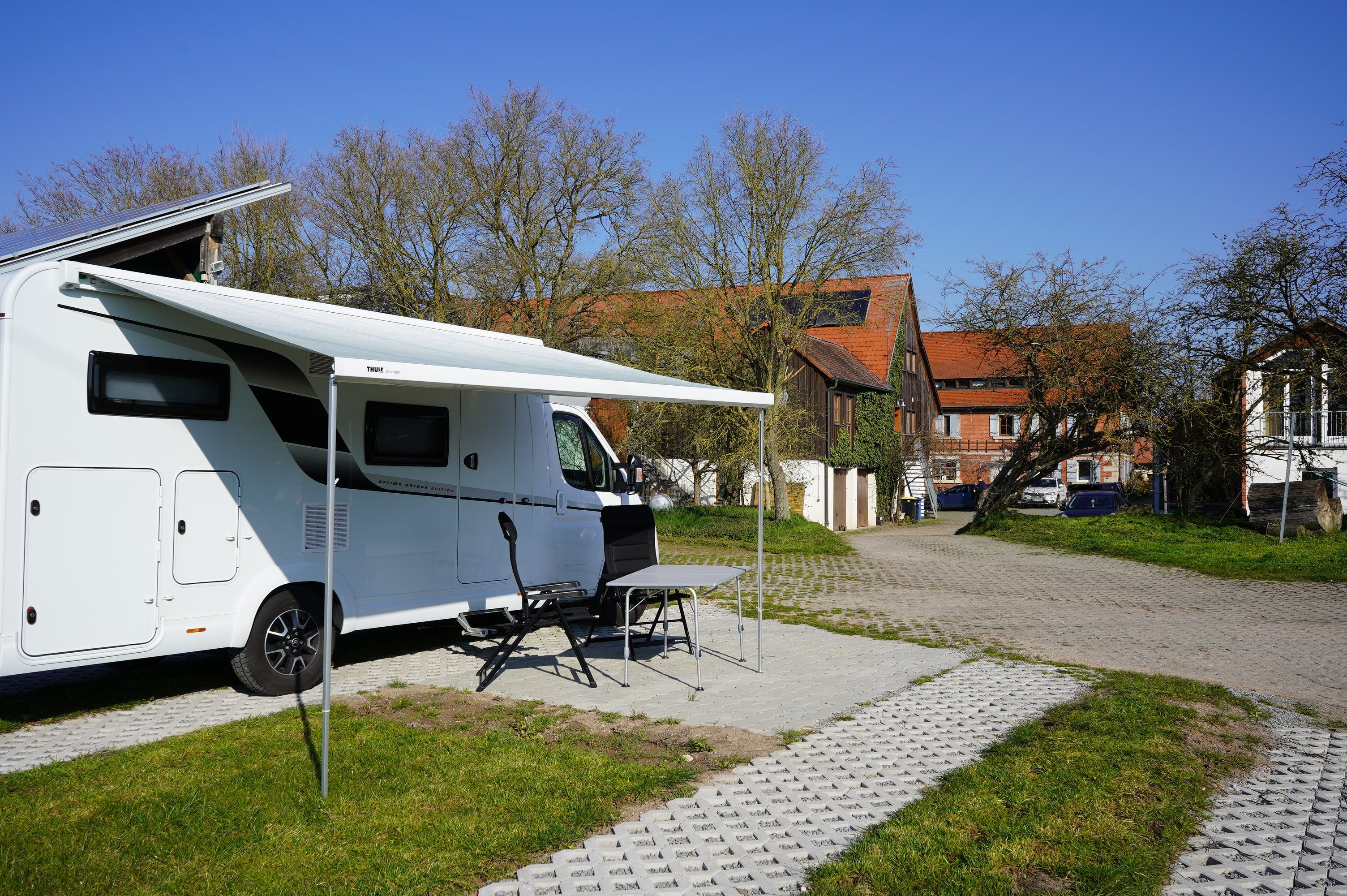 Unsere 3 Wohnmobilstellplätze befinden sich auf der Wiese hinter dem Hof. Der Untergrund ist befestigt und ein Stromanschluss ist vorhanden. Sie können gerne die öffentlichen WC`s am Hof benutzen.