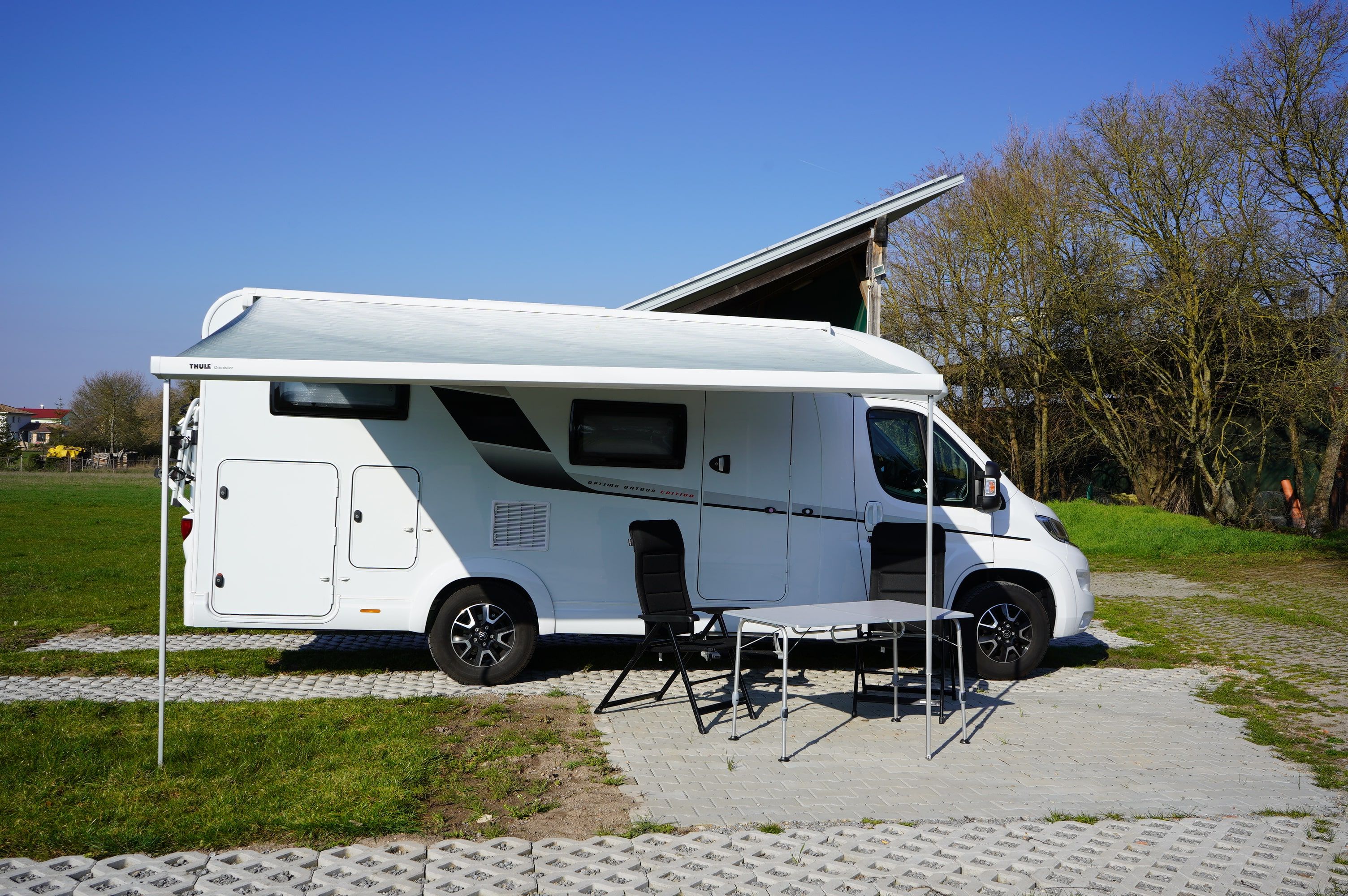 Unsere 3 Wohnmobilstellplätze befinden sich auf der Wiese hinter dem Hof. Der Untergrund ist befestigt und ein Stromanschluss ist vorhanden. Sie können gerne die öffentlichen WC`s am Hof benutzen.