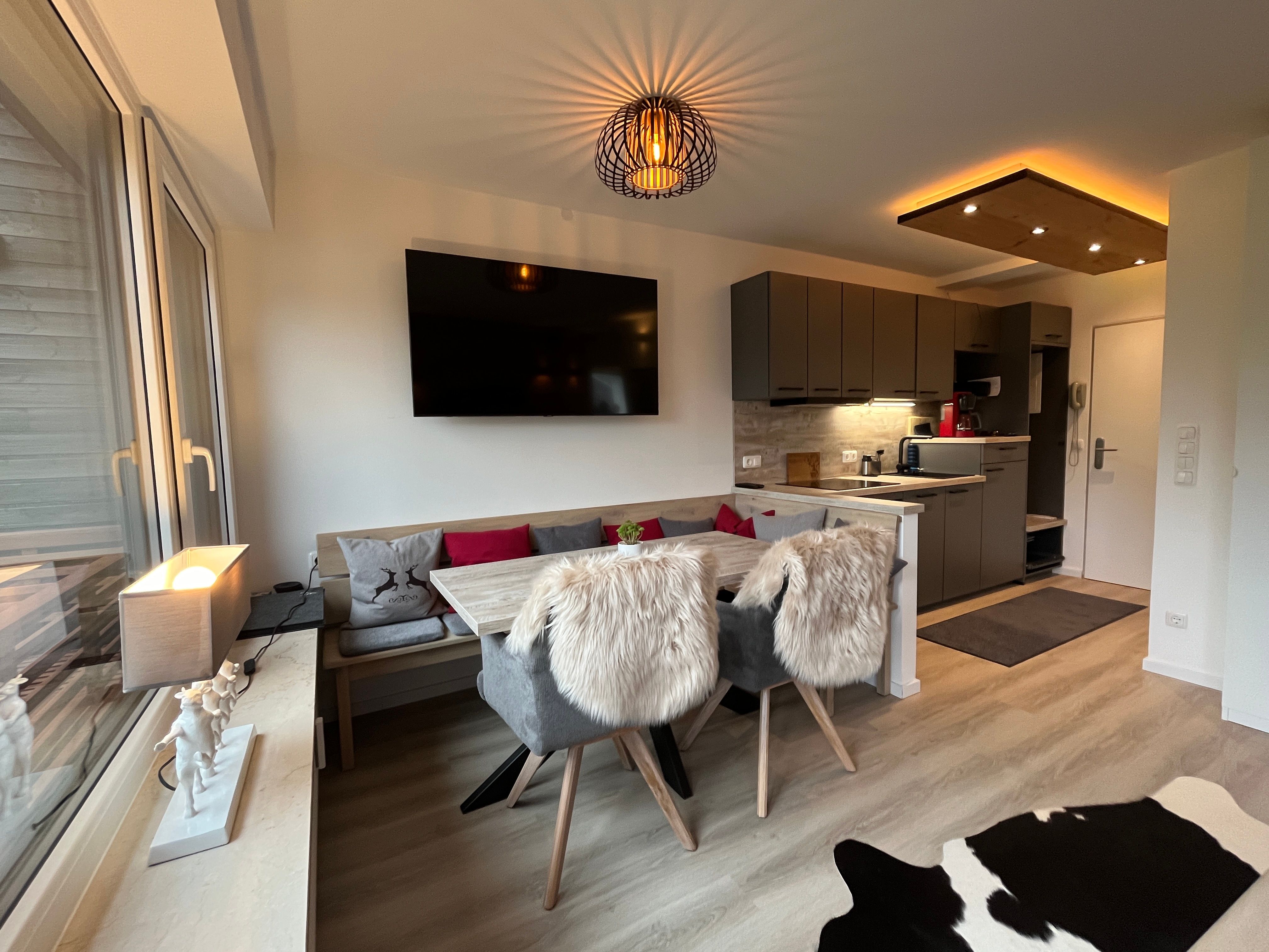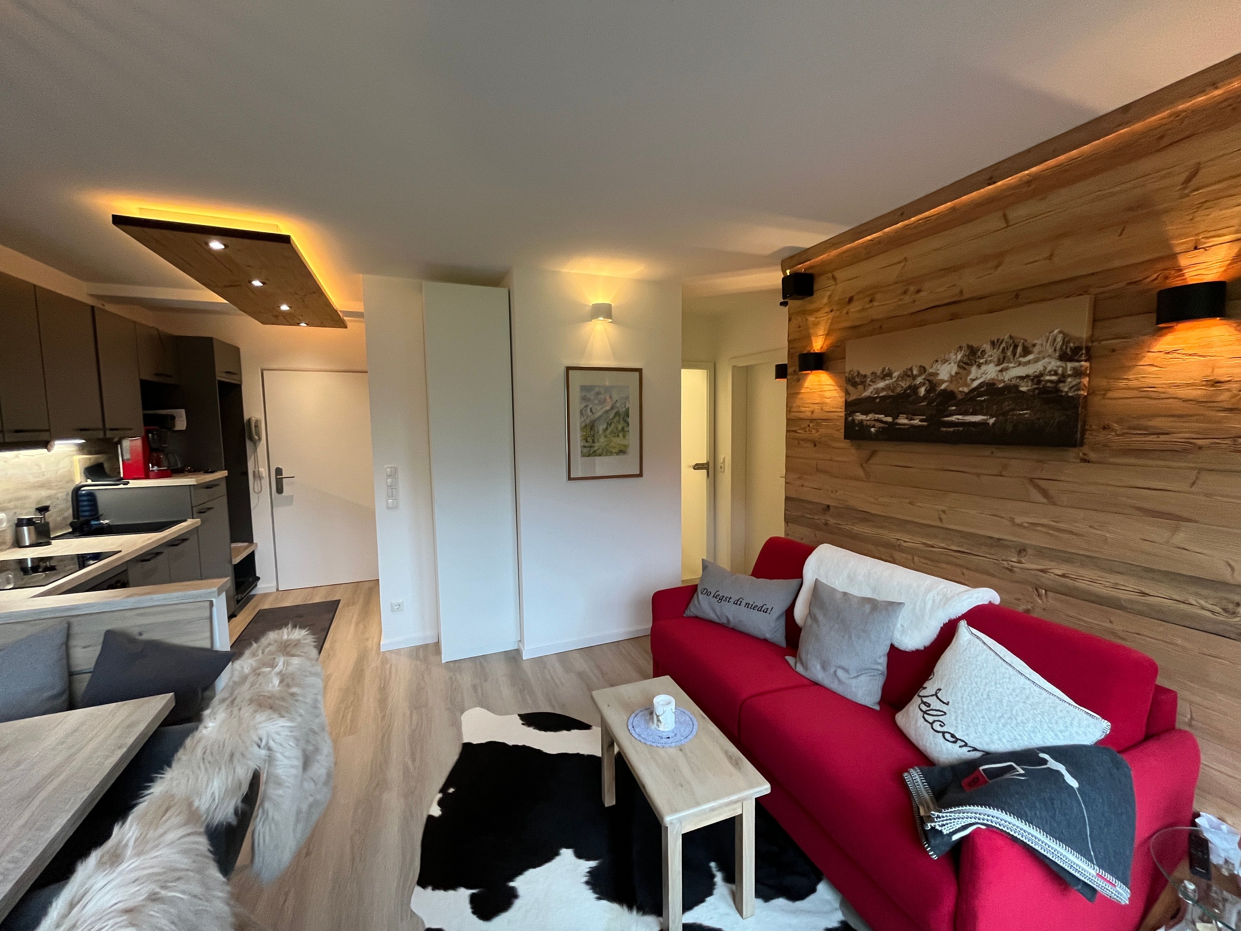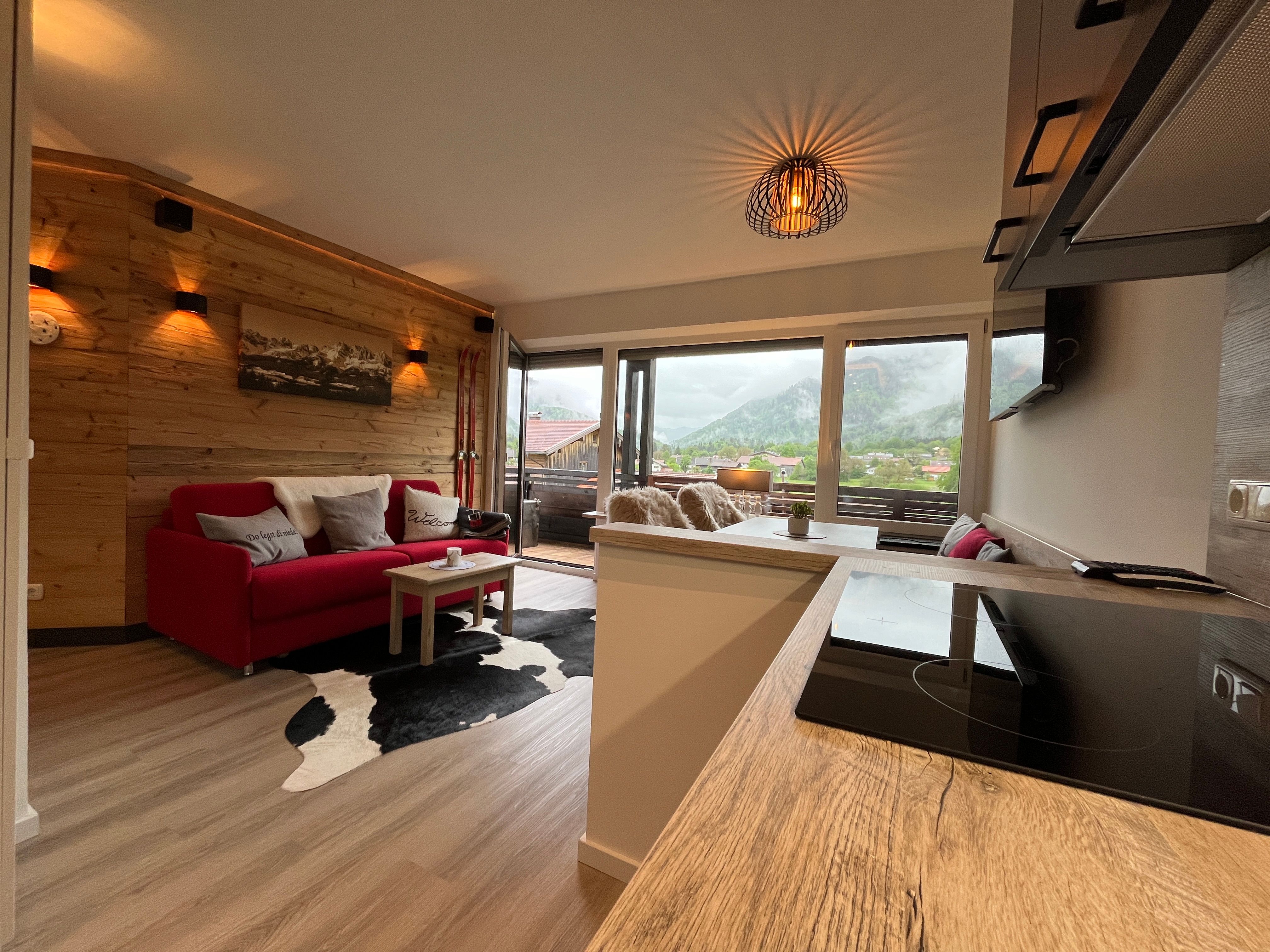 Neuwertige Ferienwohnung mit Traumpanorama Aussicht gen Süden Richtung Kössen.Unterberg /Breitenstein / Streichen. Die Wohnung verfügt über ein separates Schlaf/Kinderzimmer sowie WLAN in allen Räumen. Das Wohnzimmer mit integrierter hochwertiger Einbauküche und Ecksitzbank-Essgruppe verfügt über ein exzellentes Schlafsofa mit Lattenrost und auch TV/DVD/Hi-Fi. Ein modernes Bad Dusche, Ambi-Light und Handtuchtrockner lässt keine Wünsche offen. Vom sonnigen Süd- Balkon mit Ecksitzbank genießen Sie eine atemberaubende, unverbaute Fernsicht auf die Bergwelt sowie die Skipiste von Hoch-Kössen. Ein absoluter Ruhepol.