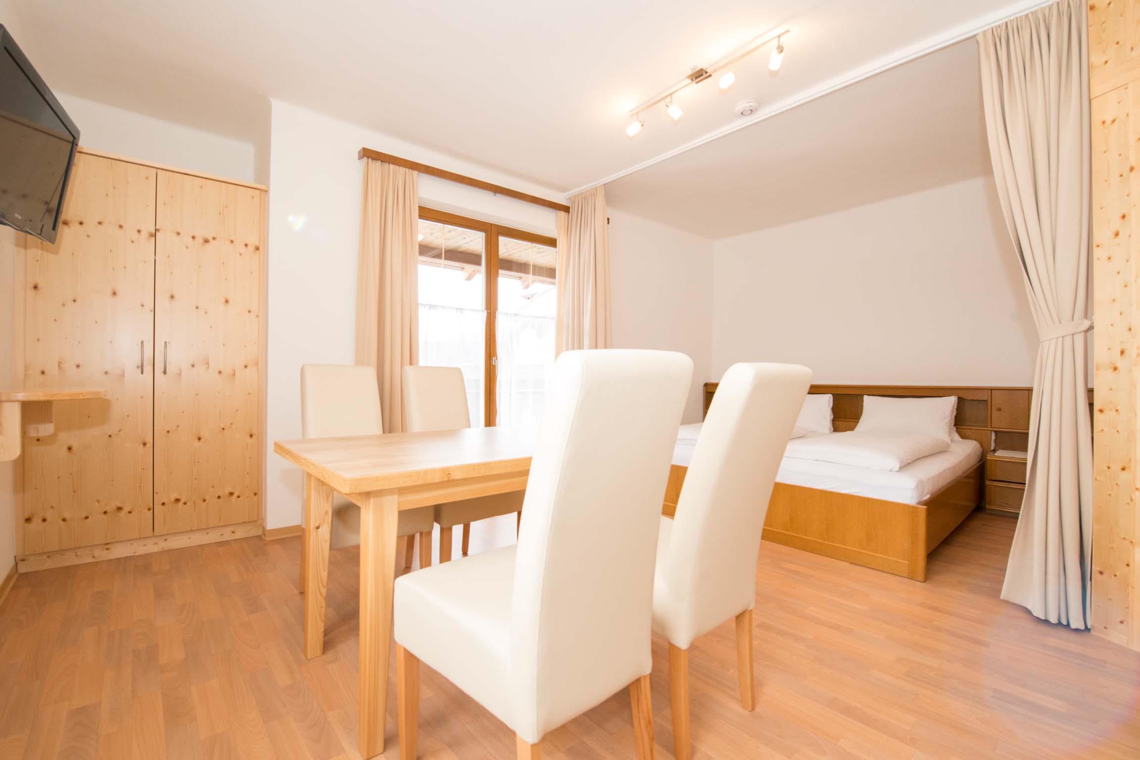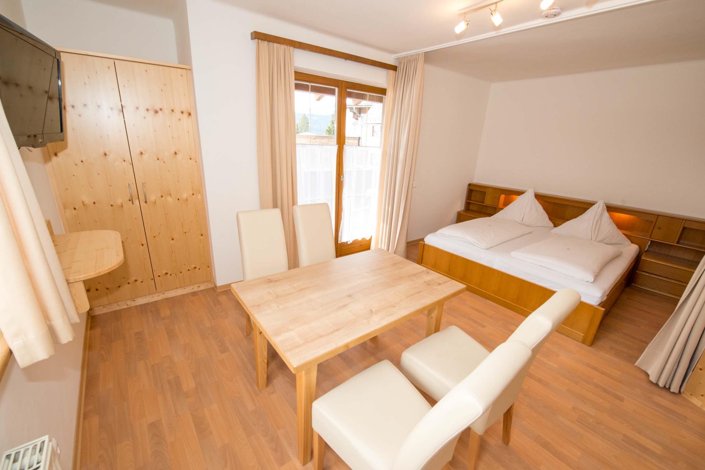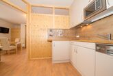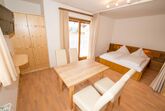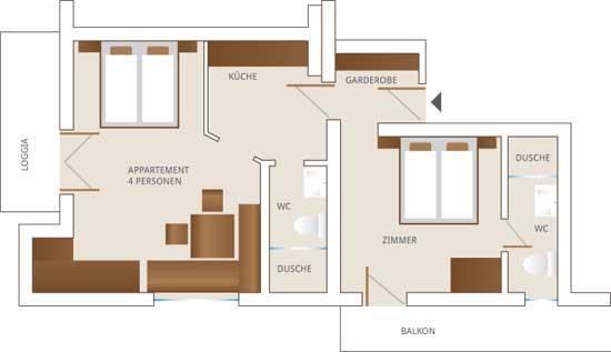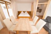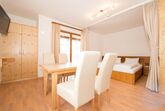 bis 2 Personen: Wohnung mit ca. 40 m², 1 Wohn-Schlafraum, 1 Doppelbett, 1 Badezimmer mit WC, Küchenzeile, Esstisch, Sofa. Südbalkon mit Seeblick.
