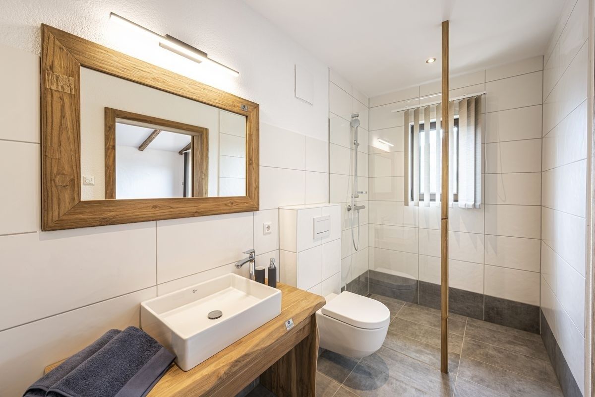 Nach einem erlebnisreichen Urlaubstag finden die Gäste im Wellnessbadezimmer die nötige Erholung. Aus der Sauna bietet sich ebenfalls ein toller Blick auf die Berge Österreichs. Die Sauna kann als klassische finnische Sauna genutzt werden oder auch als Bio-Sauna. Eine Wellness-Dusche (Regendusche) und eine große Eck-Badewanne sind auch vorhanden.