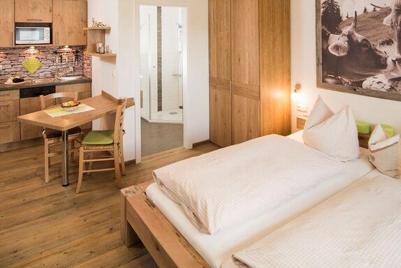Das Appartement besteht aus einem Wohn-Schlafraum für 2 Personen, Küchenzeile mit Spülmaschine u Micro, DU/WC u. Fön, DVD/CD Player, Sat-Anlage, Wlan