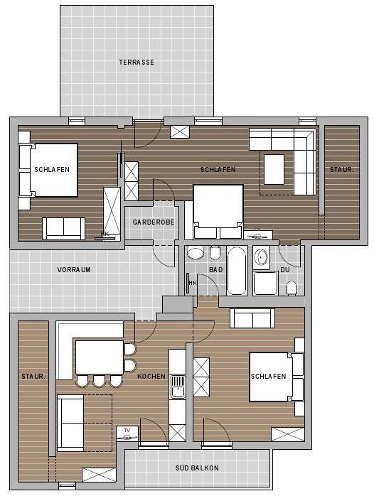 - Küche komplett ausgestattet mit grossem Tisch für 10 Personen und Zugang zum Balkon - 3 sep. Schlafzimmer mit Doppelbett - 3 Doppel-Zusatzbetten möglich - 1xBad mit Badewanne, Haartrockner und WC, Handtücher - 1xBad mit Dusche, Haartrockner und WC, Handtücher - 2x Kabel-TV - Internetanschluss frei (mit Kabel) - 1 Balkon südseitig - 1 Terrasse - eigener Zugang