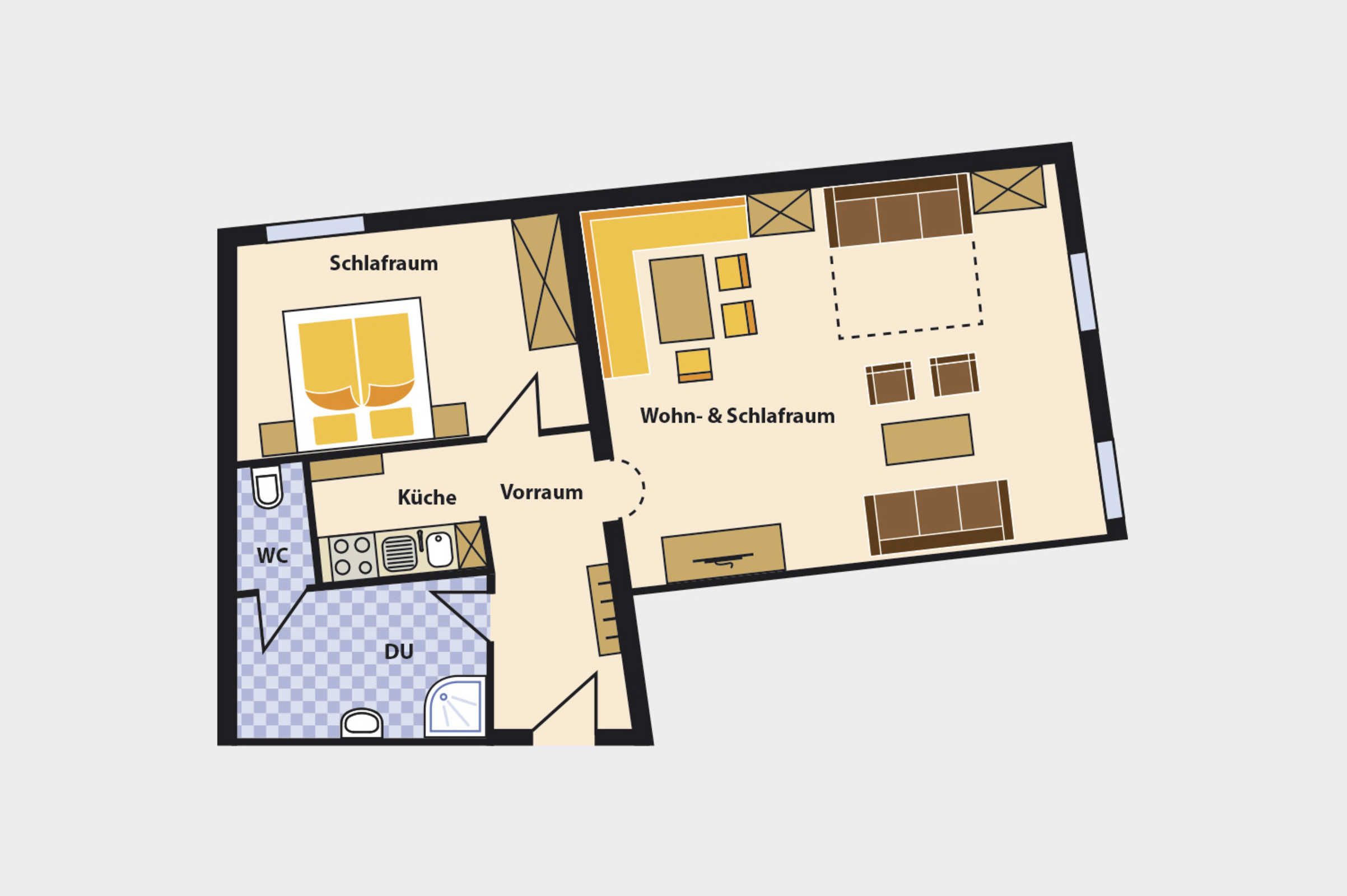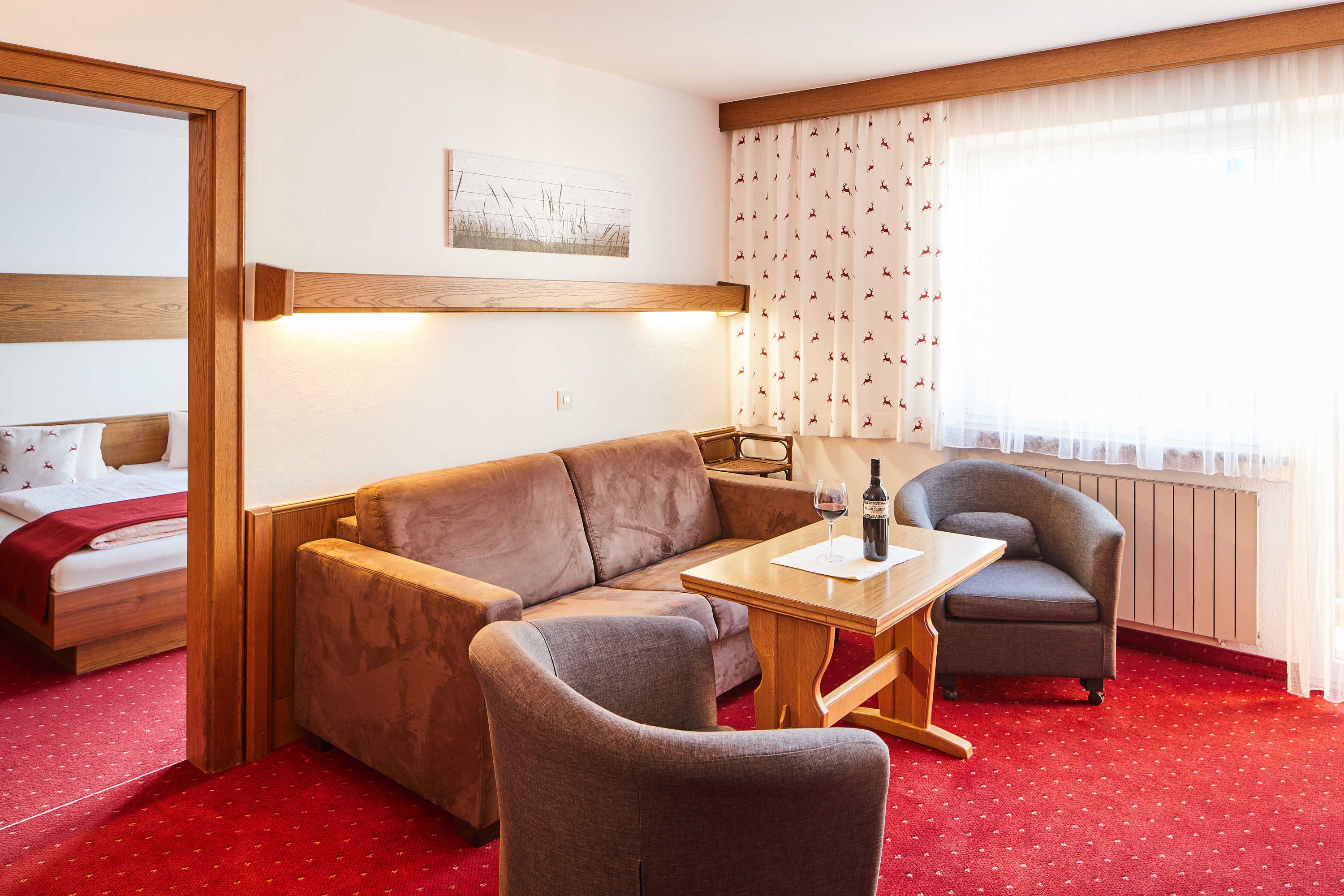 Das Wohnschlafzimmer mit Essecke und Wohngarnitur bietet viel Platz für Familien oder Gruppen, die abends gemütlich zusammensitzen wollen.