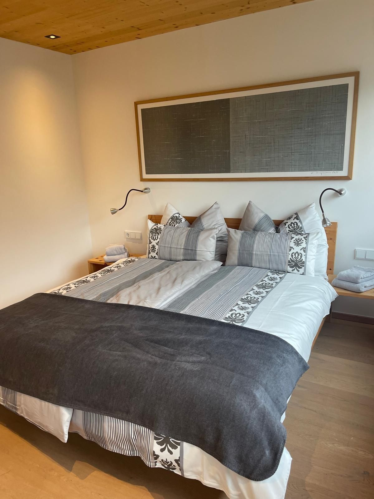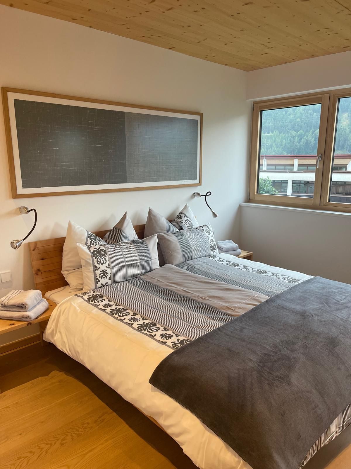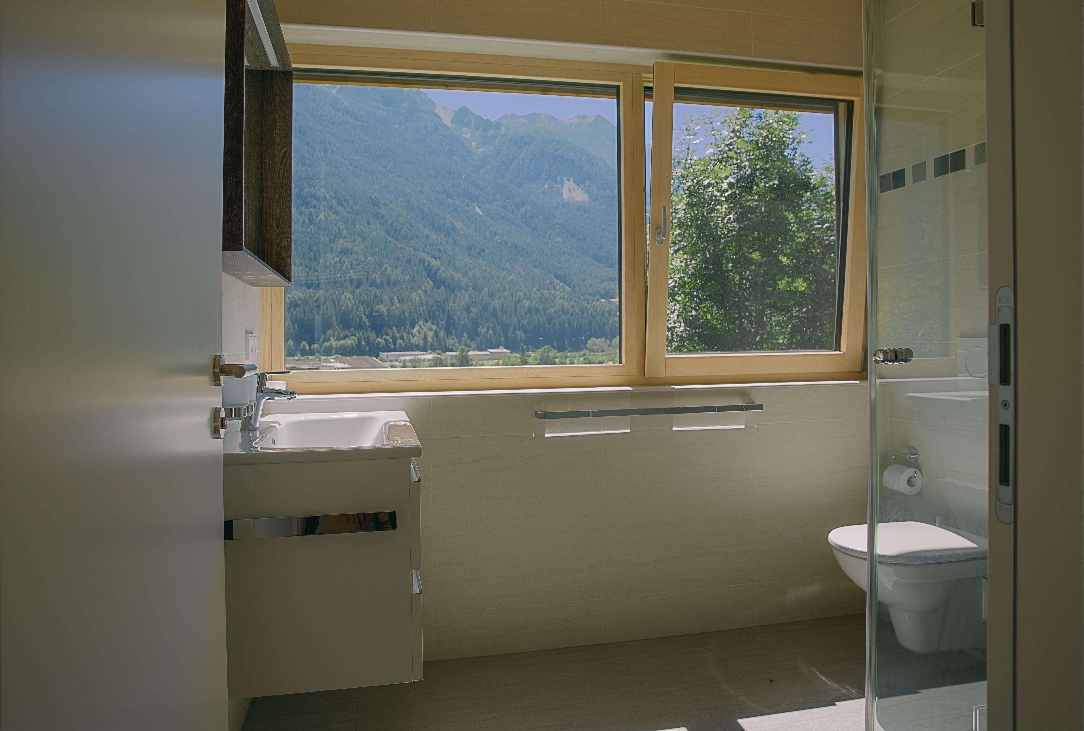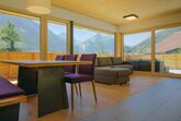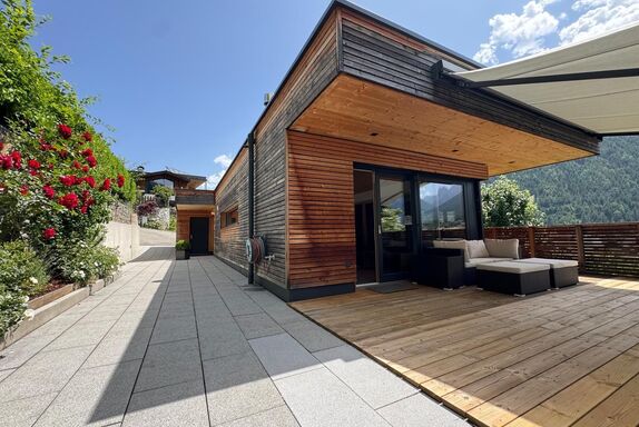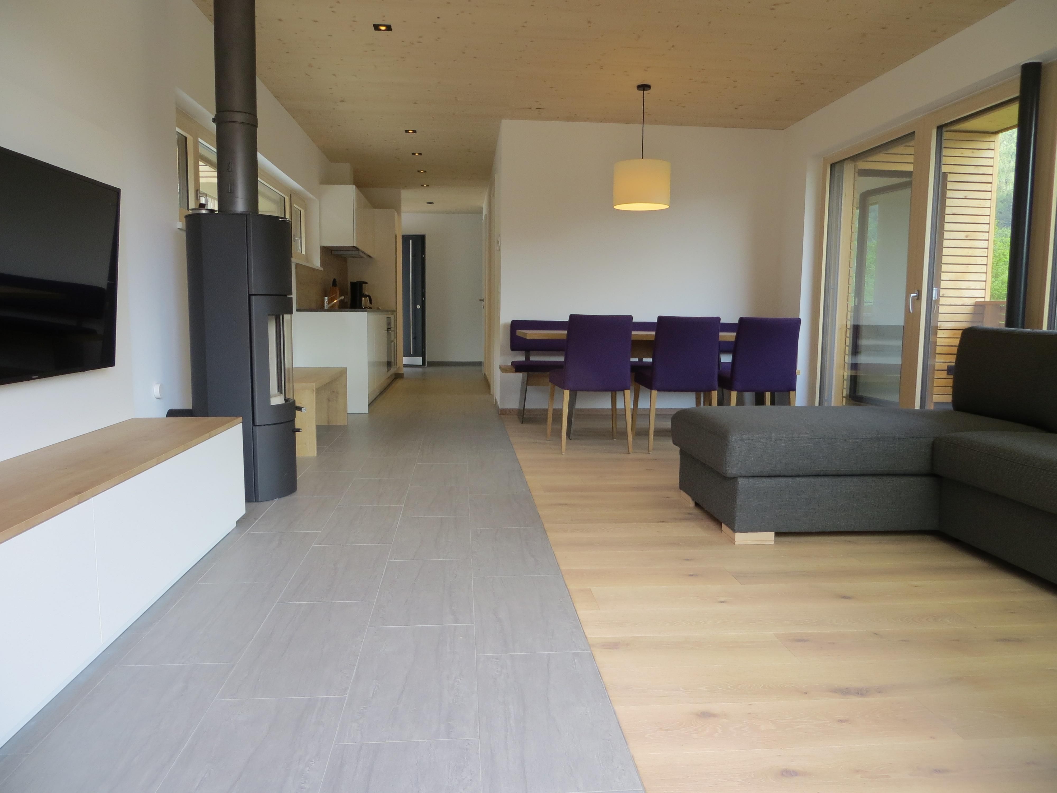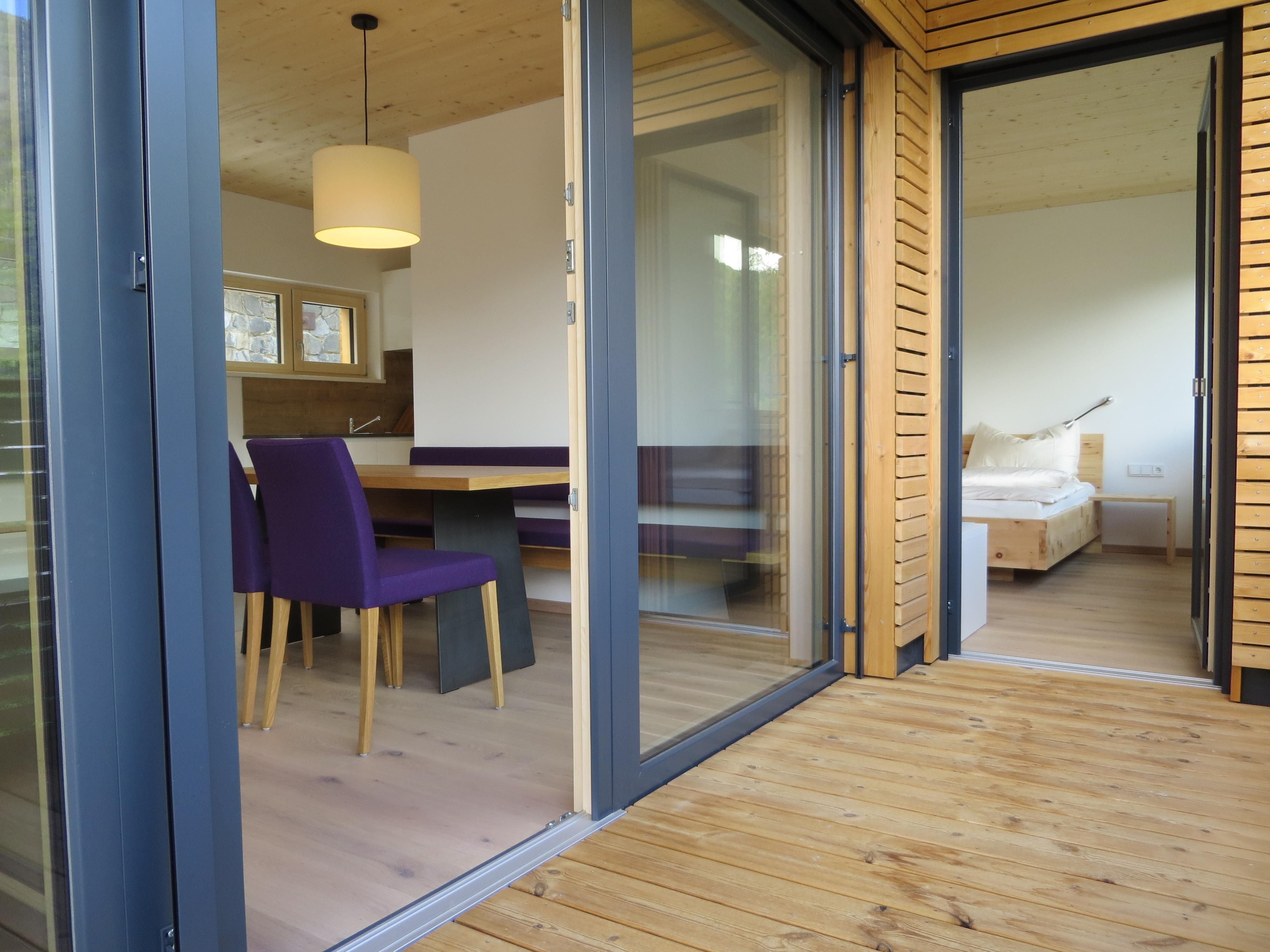 Unser Chalet kombiniert auf 75qm modernen Wohnkomfort mit natürlicher Behaglichkeit und ist mit einer Fußbodenheizung ausgestattet.Die 2 separaten Schlafräume verfügen über metallfreie Zirbenholzbetten und großzügige Einbauschränke. Das Bad is ausgestattet mit WC und ebenerdiger Dusche, ein separates Gäste-WC befindet sich im Eingangsbereich. Die Küche ist voll ausgestattet mit hochwertigen gängigen Geräten und Utensilien für bis zu 6 Personen. Der offene Wohn-/Essbereich bietet mit den bodentiefen Panoramafenstern einen unvergleichlichen Talblick und verfügt über einen großen Esstisch, eine ausziehbare Couch für die 5. und 6. Person, einen Sat-TV und einen Holzofen (Feuerholz vorhanden). Die angrenzende großzügige und barrierefrei begehbare Terrasse erweitert das offene Raumgefühl.