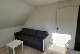 Der Wohnbereich bietet eine Schlafcouch sowie einen Fernseher mit Kabelanschluss Magenta TV und WLAN.