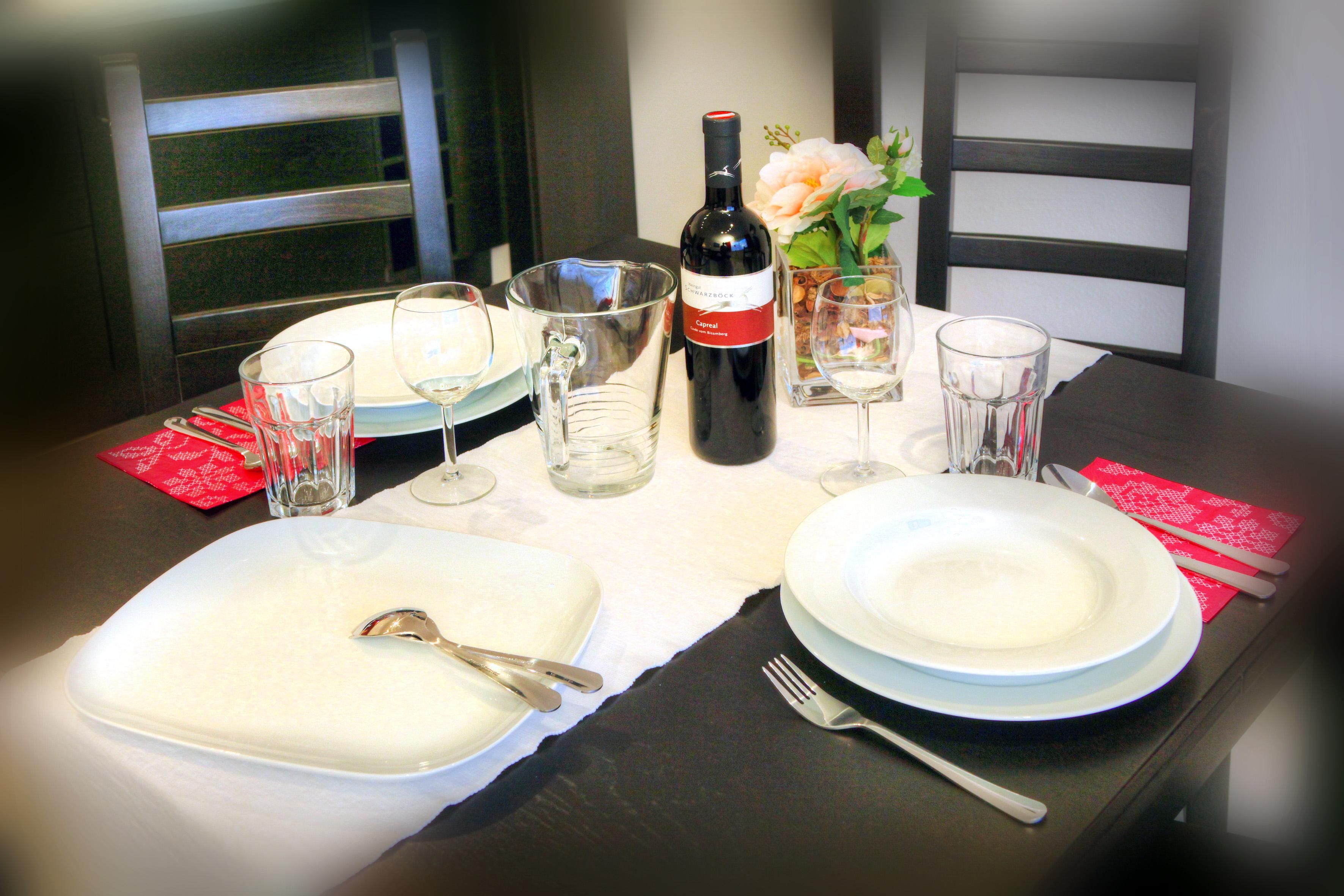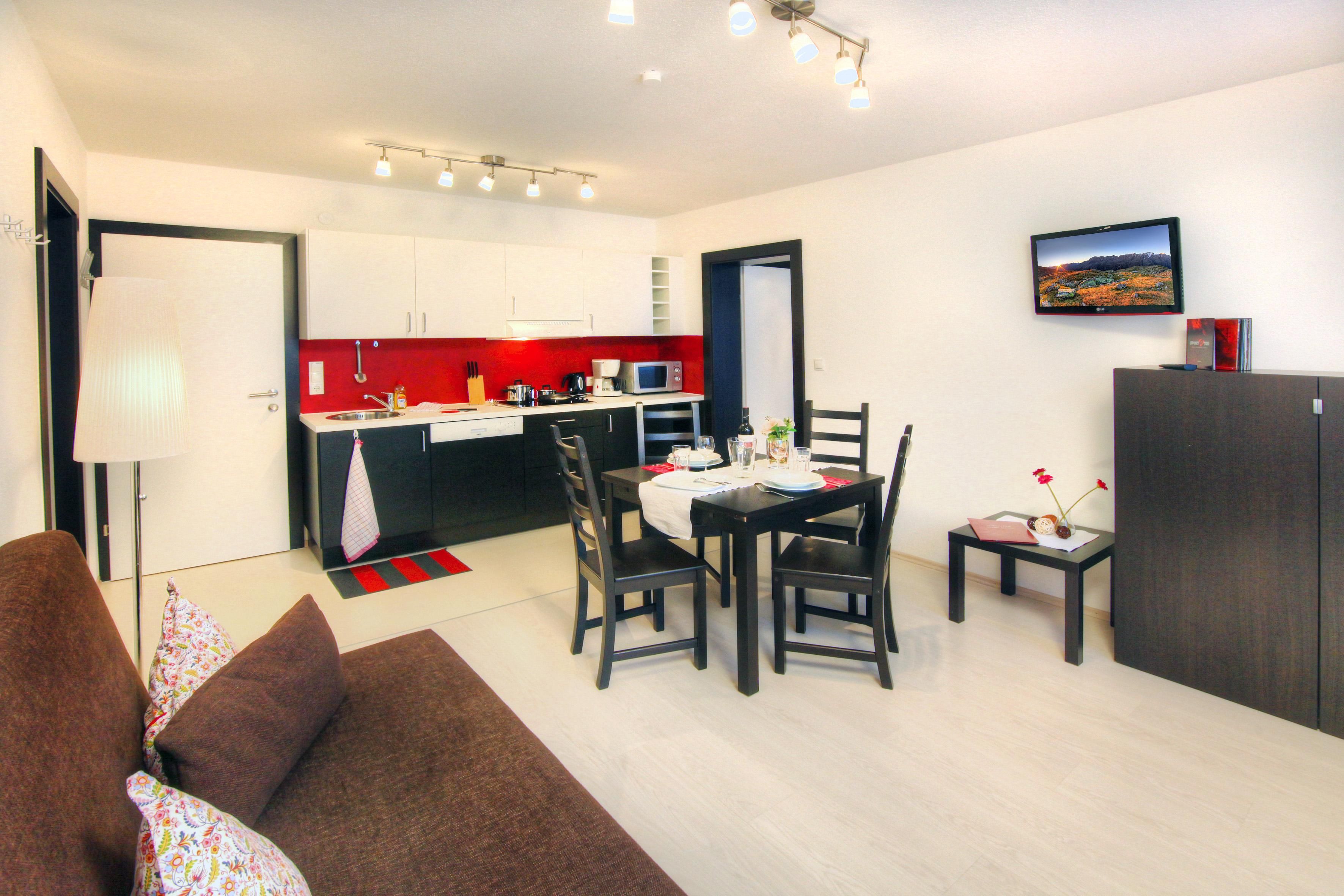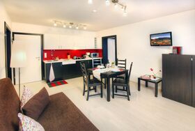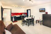 Nichtraucher-Appartemen mit ca. 56 m², komfortabler und moderner Ausstattung und Balkon: 2 Doppelzimmer mit je einem Badezimmer mit Dusche/WC, 1 vollausgestattete Wohnkücke (Caerankochfeld, Mikro, Geschirrspüler, Kaffeemaschine, Toaster, Wasserkocher, Gläser, Geschirr, Besteck und Kochutensilien) mit Schlafsofa für 1weitere Personen. Digitaler Flat-TV in jedem Schlafzimmer und Wohnraum.