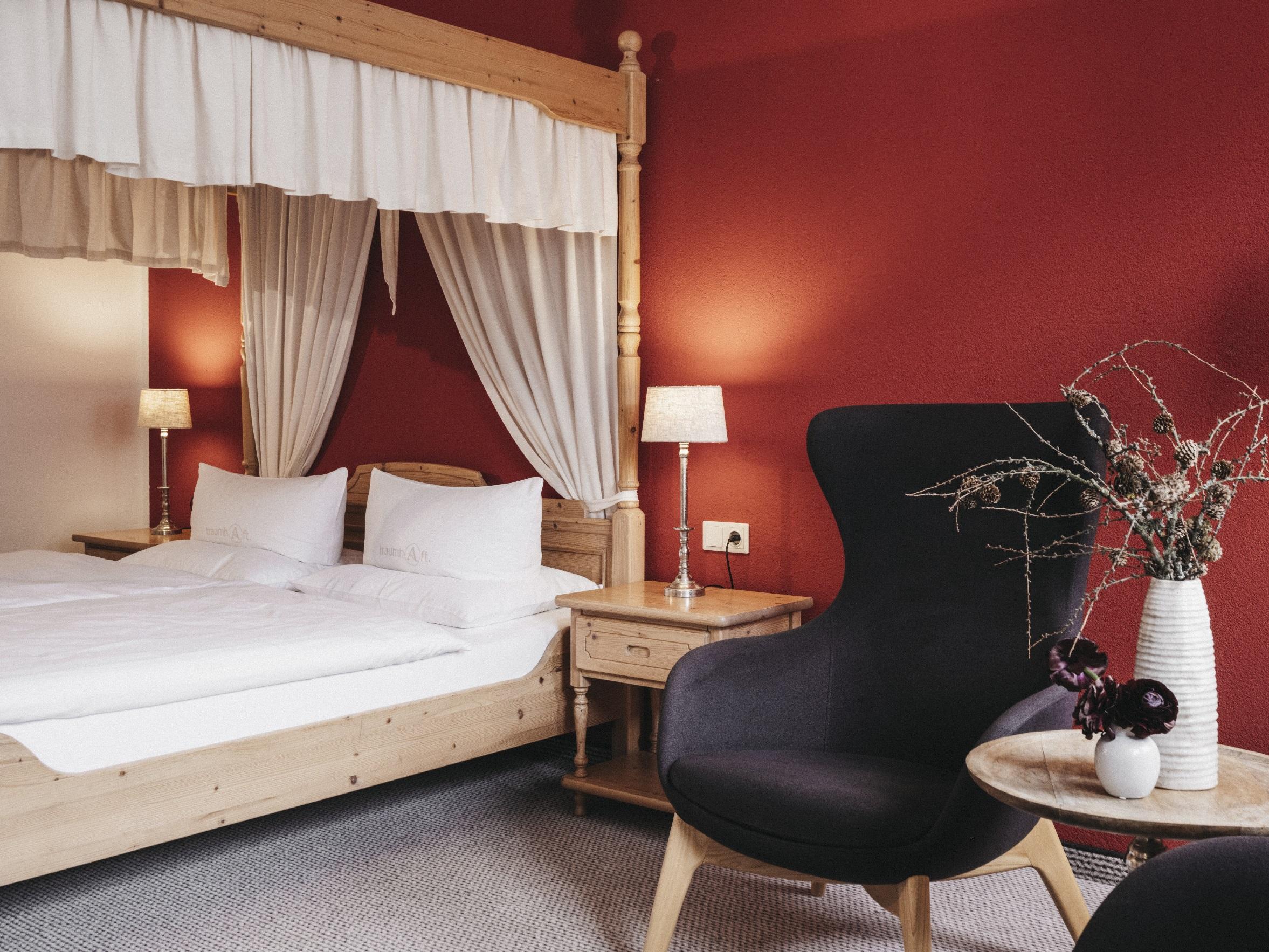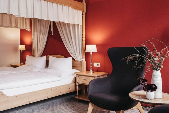 Himmelbett-Zimmer (Nichtraucher): 40 m² ohne Balkon, für 2 Personen, Sitzecke, Bad und Dusche, Doppelwaschbecken, getrenntes WC mit Bidet, Haarfön, beleuchteter Schminkspiegel, Sat-Tv, Radio-Tv, Zimmersafe, Telefon, Stromfreischaltung, Naturholzmöbel