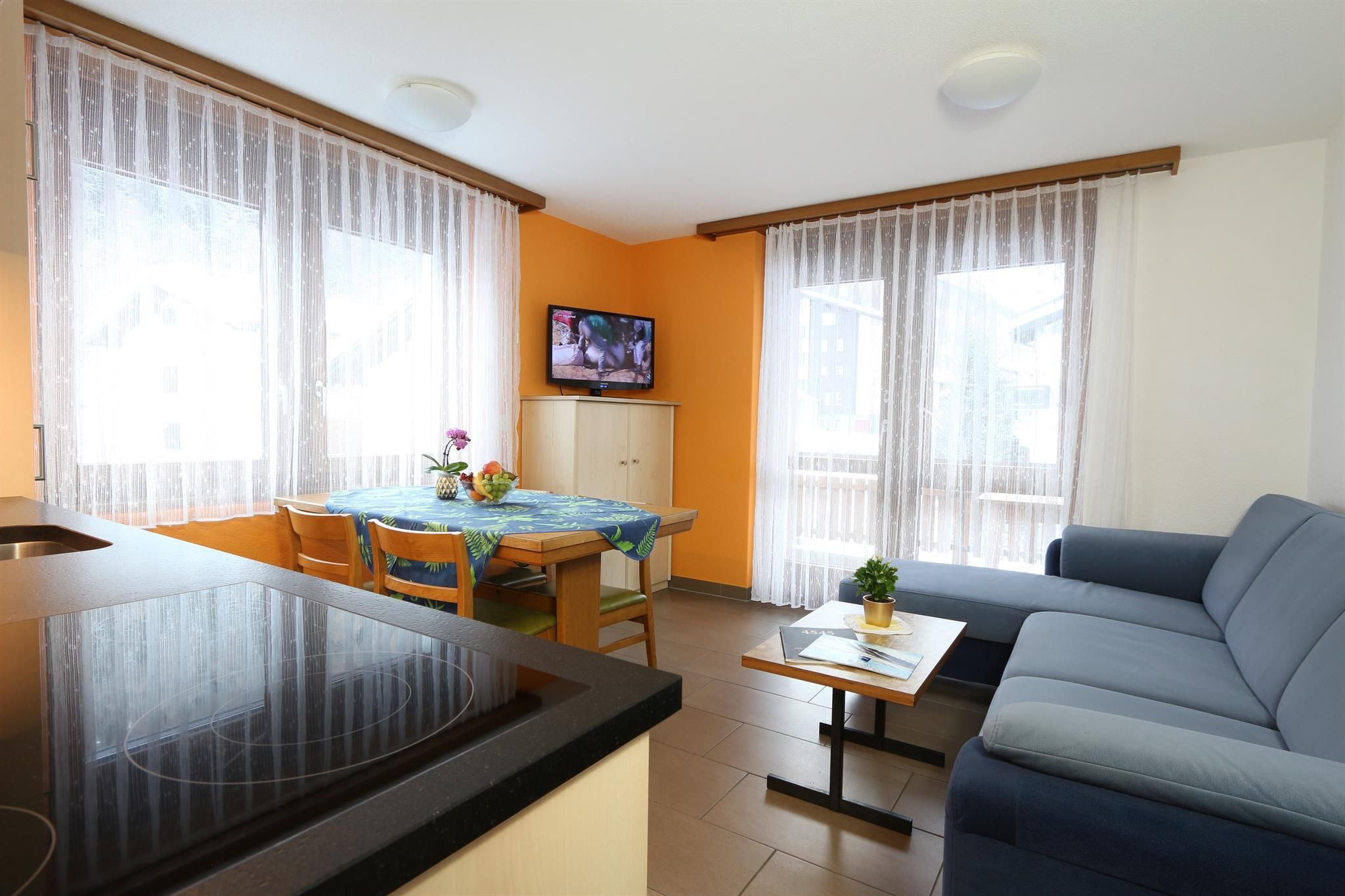 Moderne und geräumige ***s / ****Apartments für 1 – 6 Personen in einem Top-Qualitätsstandard. Je nach Wohnungsgrösse mindestens 1 Schlafzimmer mit Lavabo. Vollausgestattete Wohn-Essküche mit Ceran-Kochfeld, Backofen, Kühlschrank mit Gefrierfach, Nespresso Kapsel-Kaffeemaschine, Geschirrspüler, Wasser- & Eierkocher sowie Käse-Fondue Caquelon. (Raclette-Ofen, Tischgrill, Toaster etc. stehen auf Anfrage zur Verfügung – einfach fragen!) Radio-CD Player, TV-Flachbildschirm mit Kabel-TV und Infokanal Saas-Fee, kostenfreies W-LAN, Safe, Dusche/WC mit Haartrockner. Sonniger Südbalkon mit einzigartigem Panoramablick auf die Gletscherbergwelt und Bergspitzen der Mischabelkette.