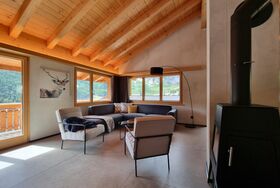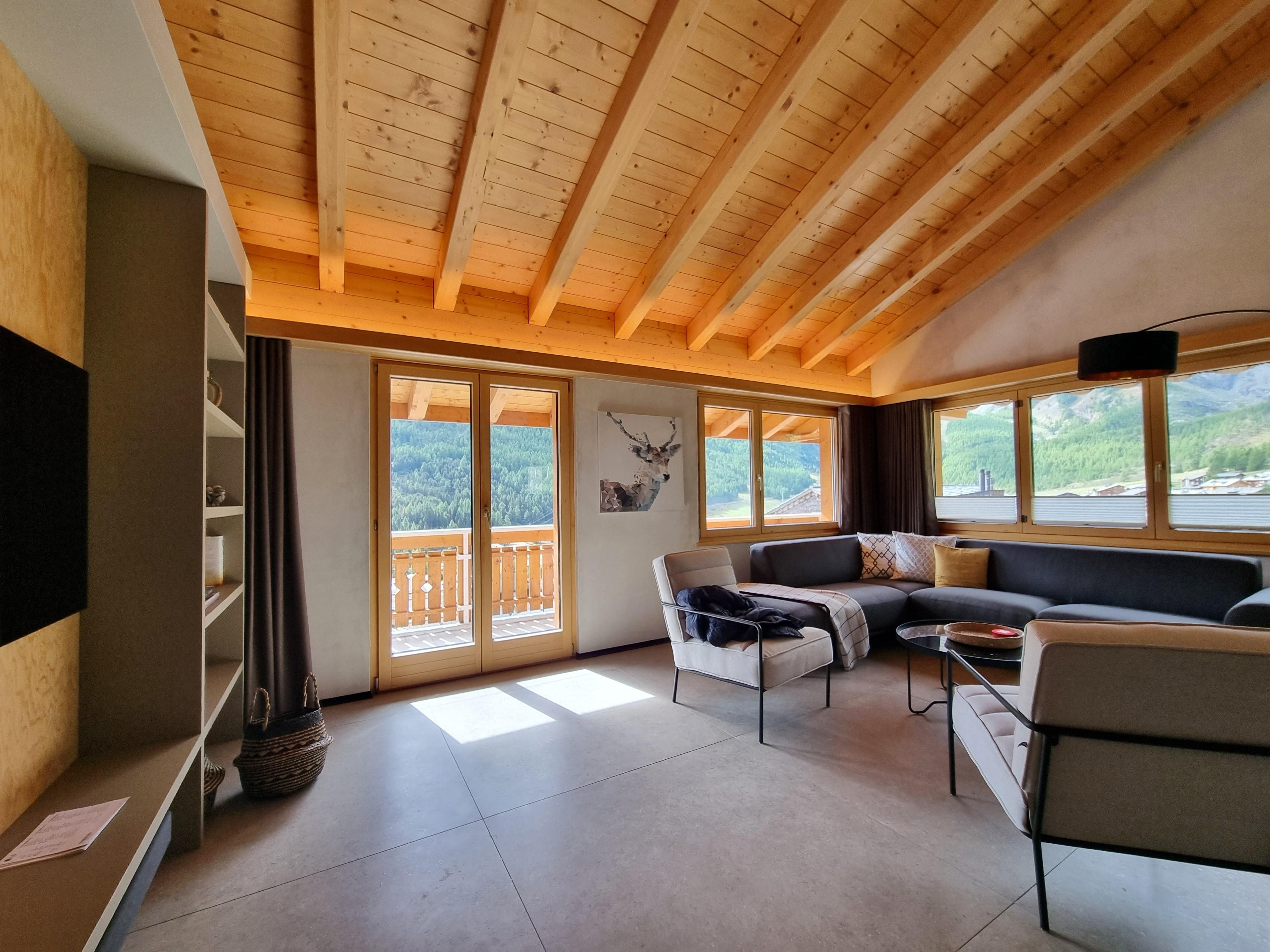 Die Dachwohnung befindet sich im 2.OG und wurde kürzlich komplett renoviert. Die Wohnung hat 4 Schlafzimmer und 2 Badezimmer. 3 Schlafzimmer sind ausgestattet mit einem Doppelbett, das vierte Schlafzimmer hat ein Kajütenbett. Die Badezimmer sind sehr modern, beide mit Dusche/Toilette & Waschbecken. Das Wohnzimmer ist hell und gross und mit einem gemütlichen Kachelofen ausgestattet. Auch die offene, moderne Küche lässt keine Wünsche offen. Highlight ist der südlich ausgerichtete Balkon mit genialer Sicht auf das Dorf & die Berge von Saas-Fee. Zusätzlich hat die Wohnung einen privaten Waschturm und gratis Wifi.