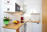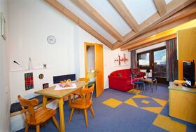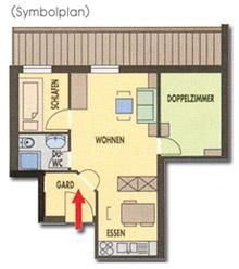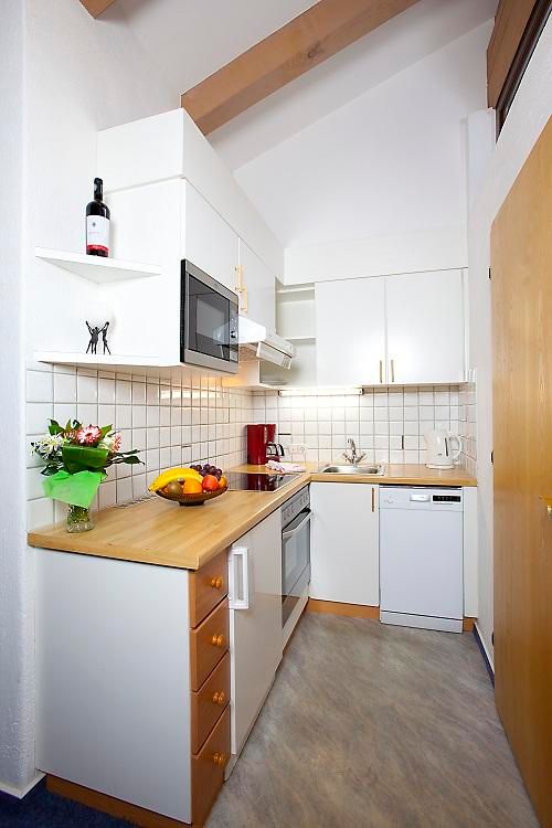3-Zimmer-Wohnung, 4-6 Personen, ca. 42 m², Küchenblock mit Geschirrspüler u. Mikrowelle, Wohn-/Schlafraum mit Esstisch, Kachelofen und Doppelbettcouch, Schlafzimmer mit Doppelbett, Schlafzimmer mit Etagenbetten, Badezimmer mit Badewanne oder Dusche und WC, Balkon, Radio, Sat-TV, Telefon, W-LAN, Safe