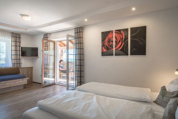 Unsere Zimmer strahlen Natürlichkeit aus – umgeben von Wiesen, Feldern und Wäldern. Auf der Frühstücksterrasse genießt du den Tag mit hausgemachtem Kuchen und Blick ins Grüne.
