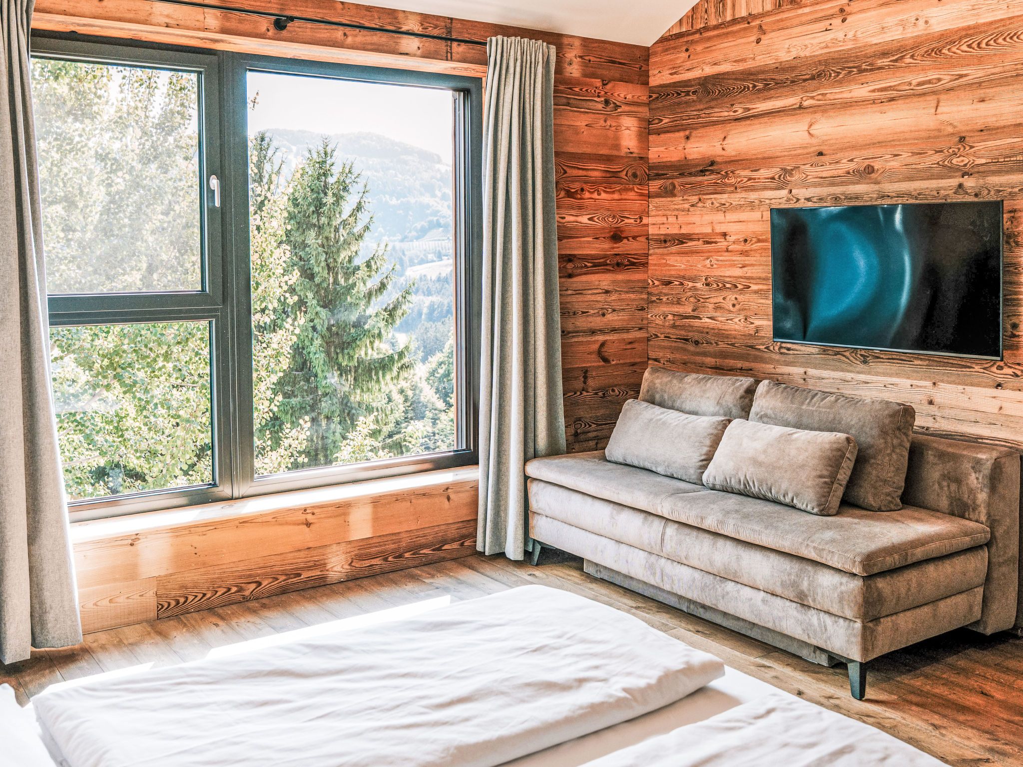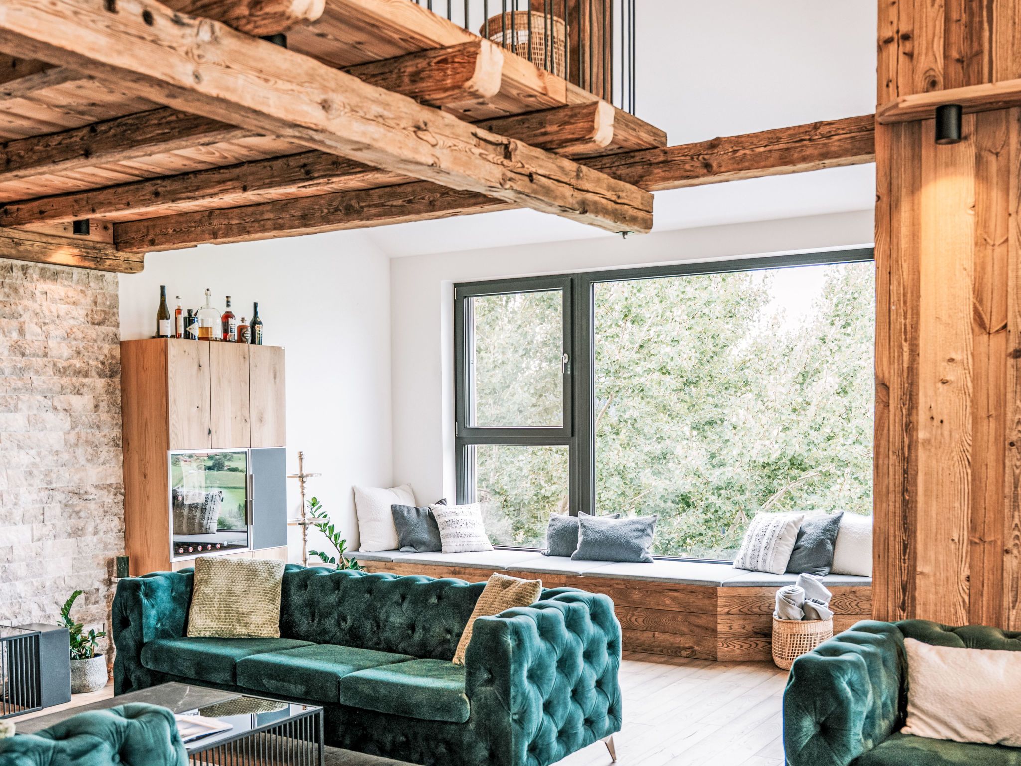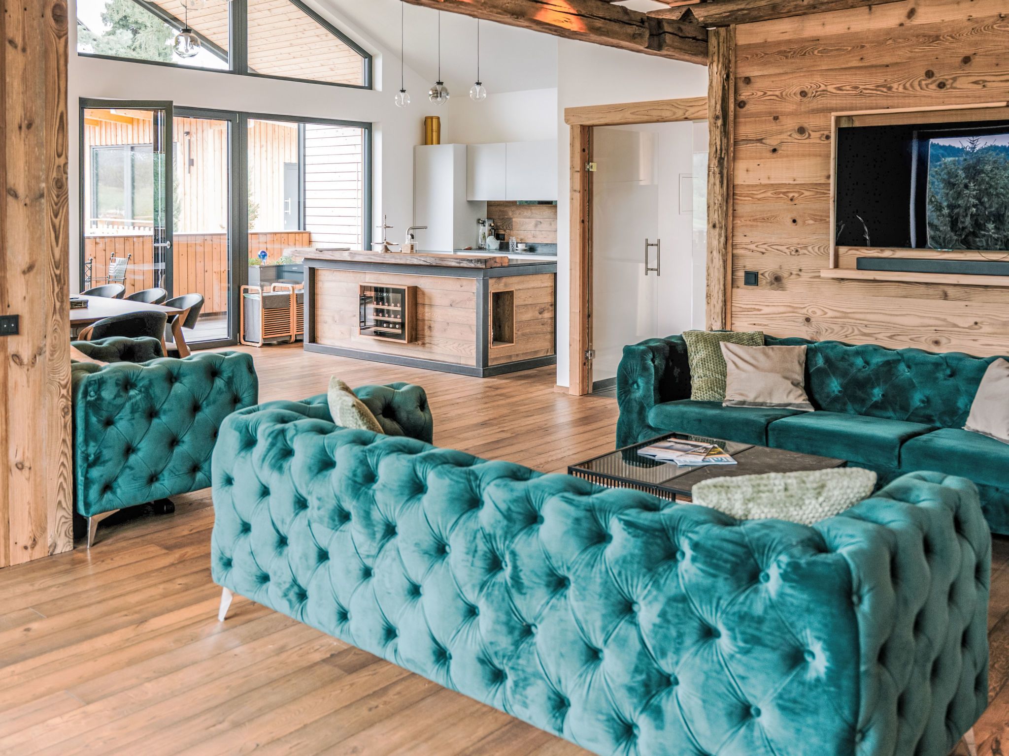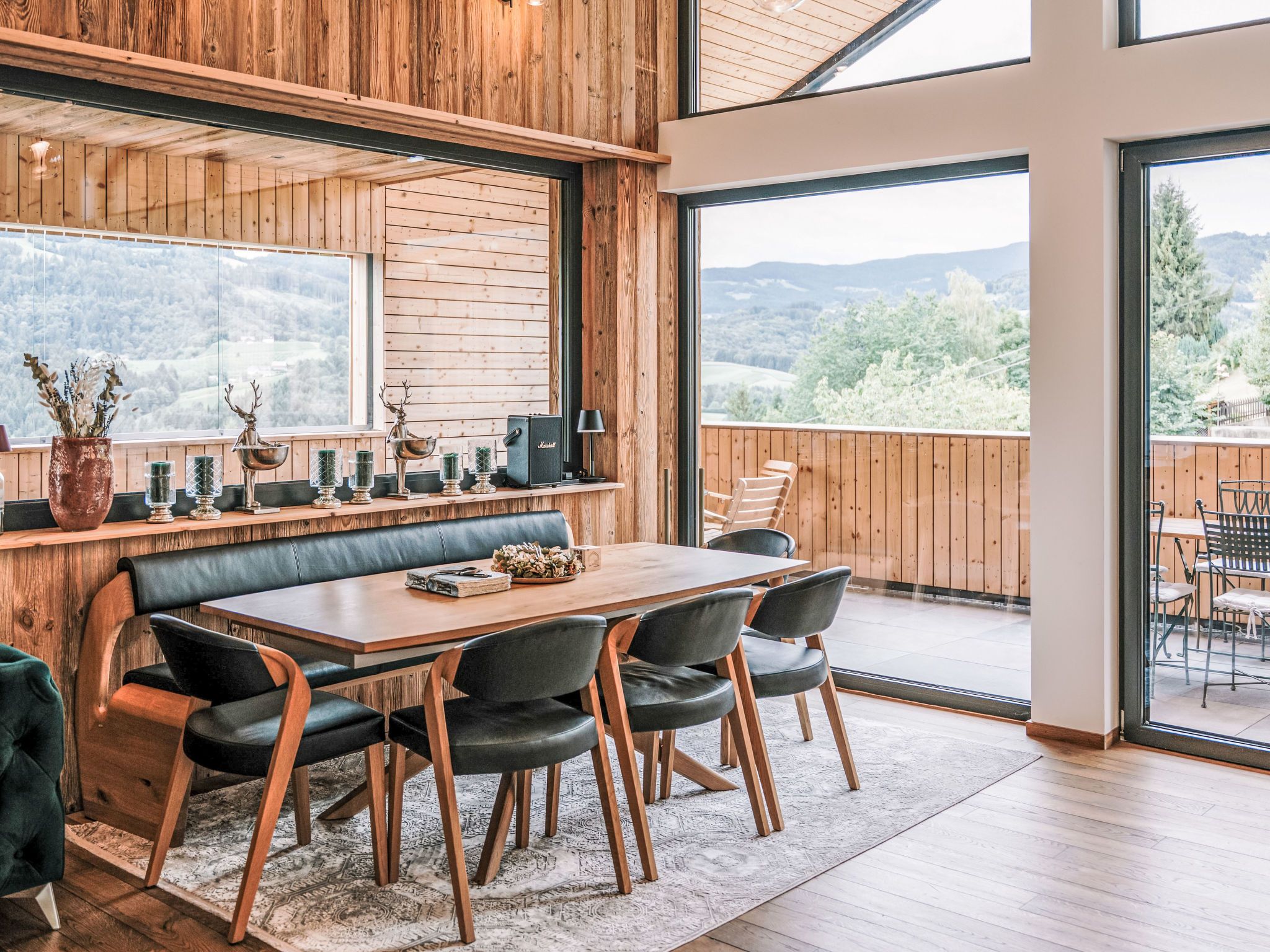 Haus am Kogl, 6-Zimmer-Landhaus 300 m2 auf 2 Stockwerken. Objekt geeignet für 10 Erwachsene + 3 Kinder. Hell, teilweise abgeschrägt, komfortabel und mit viel Holz eingerichtet: grosses Wohn-/Esszimmer mit Esstisch, Sat-TV und Internationale TV-Sender (Flachbildschirm), Kachelofen. Ausgang zum Balkon. 1 Zimmer mit Panoramafenster mit 1 Doppeldiwanbett (1 x 140 cm, Länge 200 cm), 1 Doppelbett, Dusche/WC, Sat-TV und Internationale TV-Sender (Flachbildschirm). Offene Küche (Backofen, Geschirrspüler, 4 Induktionskochplatten, Toaster, Wasserkocher, Grill, elektrische Kaffeemaschine, Racletteofen) mit Bar. Sep. WC. Fussbodenheizung. Unteres Geschoss: 3 Doppelzimmer, jedes Zimmer mit Dusche/WC, Sat-TV und Internationale TV-Sender (Flachbildschirm). Ausgang zur Terrasse. Obergeschoss: 1 abgeschrägtes Zimmer mit Schiebetür mit 1 Diwanbett (90 cm, Länge 200 cm), 1 Doppelbett, Sat-TV und Internationale TV-Sender (Flachbildschirm). Offene Galerie. Parkettboden. Terrasse. Terrassenmöbel, Gartengrill, Liegestühle. Sehr schöne Panoramasicht auf die Landschaft. Zur Verfügung: Waschmaschine, Wäschetrockner, Bügeleisen, Kinderhochstuhl, Babybett bis 2 Jahre, Haartrockner, Holz (gratis). Internet (WLAN, gratis). E-Ladestation. Bitte beachten: Nichtraucher-Haus. Rauchmelder, Feuerlöscher. Der ausgeschriebene Pool ist zur alleinigen Nutzung.