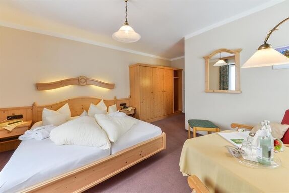 Unsere im gemütlichen Landhausstiel eingerichteten Doppelzimmer sind alle mit Dusche und WC, Radio, Farb-TV, Durchwahltelefon, Kühlschrank, Balkon ausgestattet. Es erwartet Sie ein reichhaltiges Frühstücksbuffet. Auf Wunsch bieten wir Ihnen eine Abendküche. Kuranwendungen sind im Hause erhältlich. Die Saunalandschaft mit Dampfbad, Finnischer Sauna und Bio-Kräutersauna, sowie unsere Sonnenterrasse stehen Ihnen kostenlos zur Verfügung.
