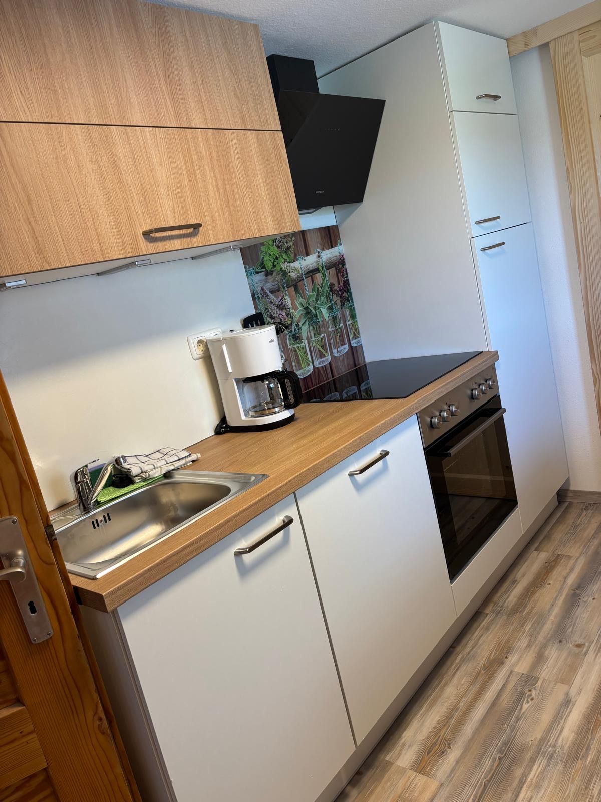 - eine voll ausgestatteten Küchenzeile mit Herd, Backofen, Kühlschrank, Kaffeemaschine, Wasserkocher und Toaster, sowie einen gemütlichen Sitzbereich